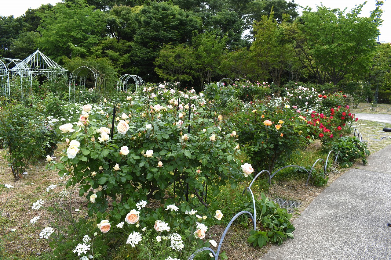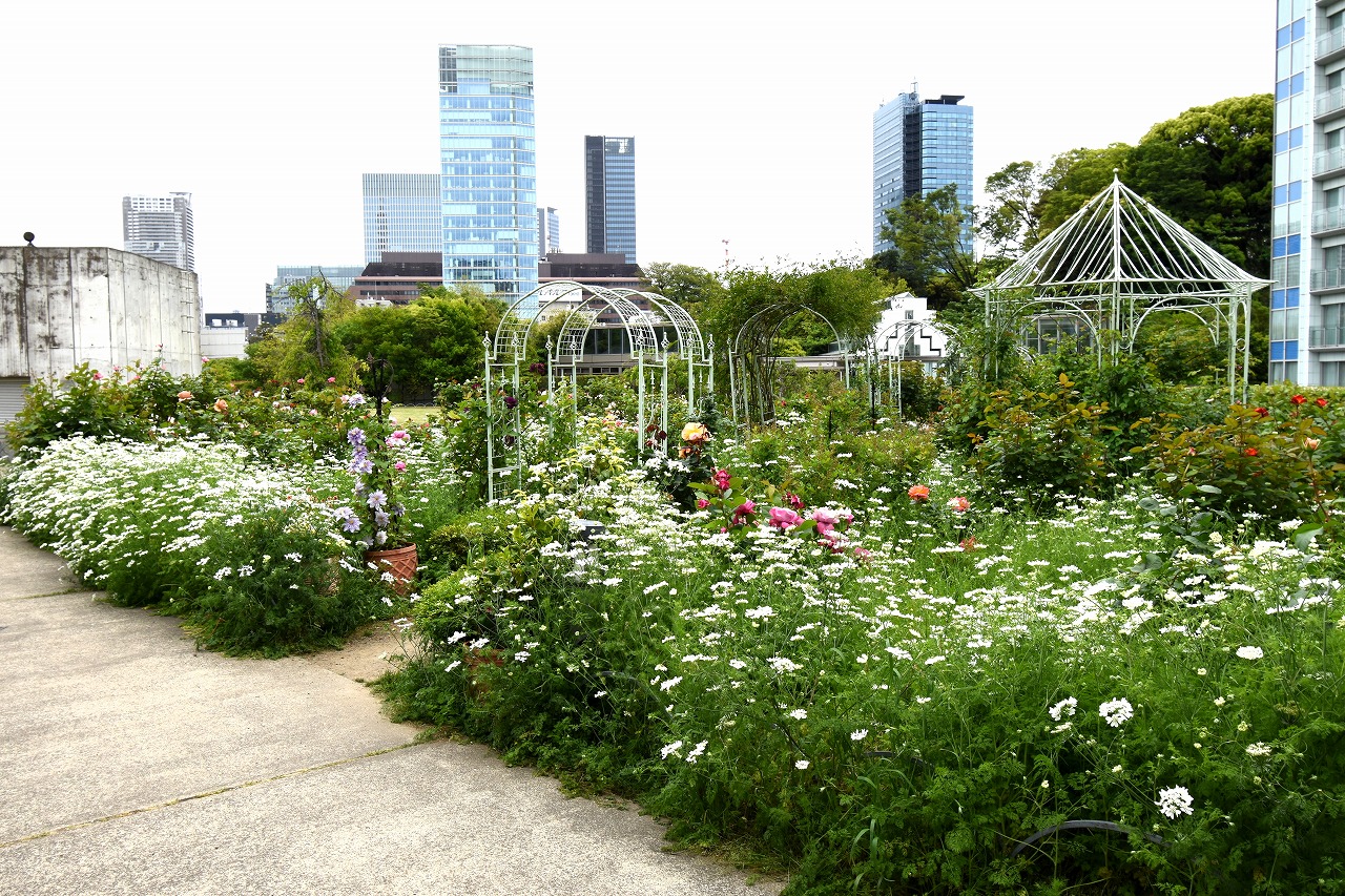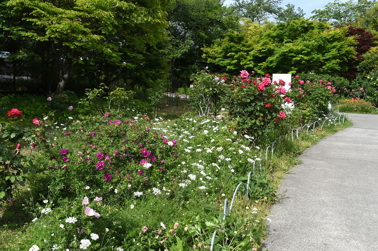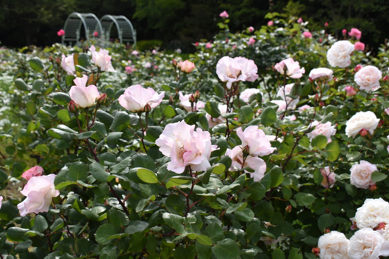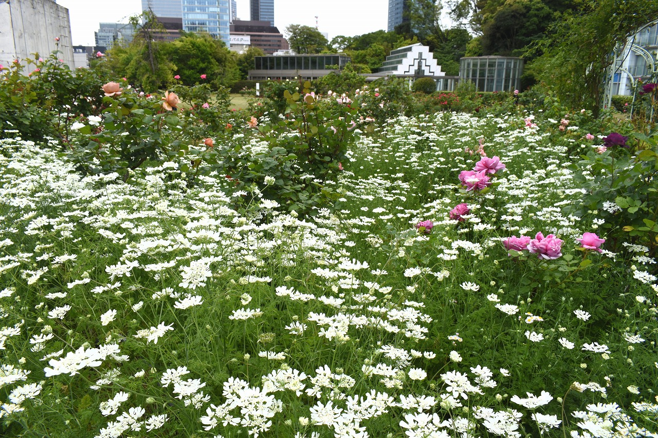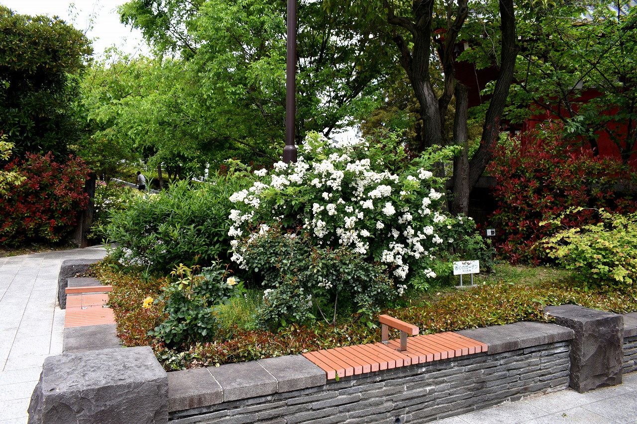 芝公園は新緑が綺麗です。広場にバラの門が出来ました。ベニバナトチノキに花が咲きました。花壇には色々な花が咲いています。