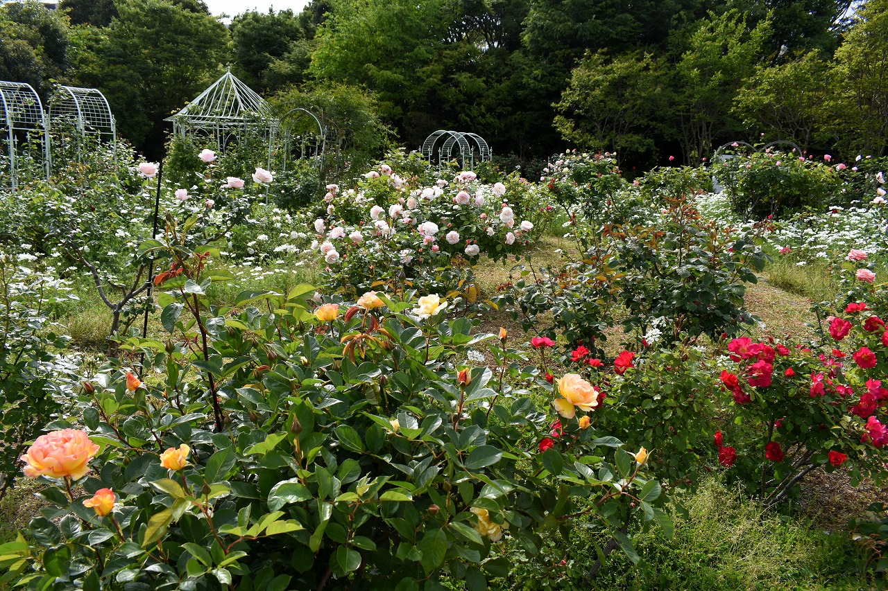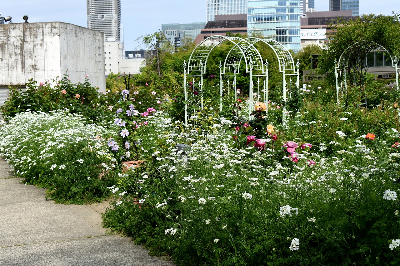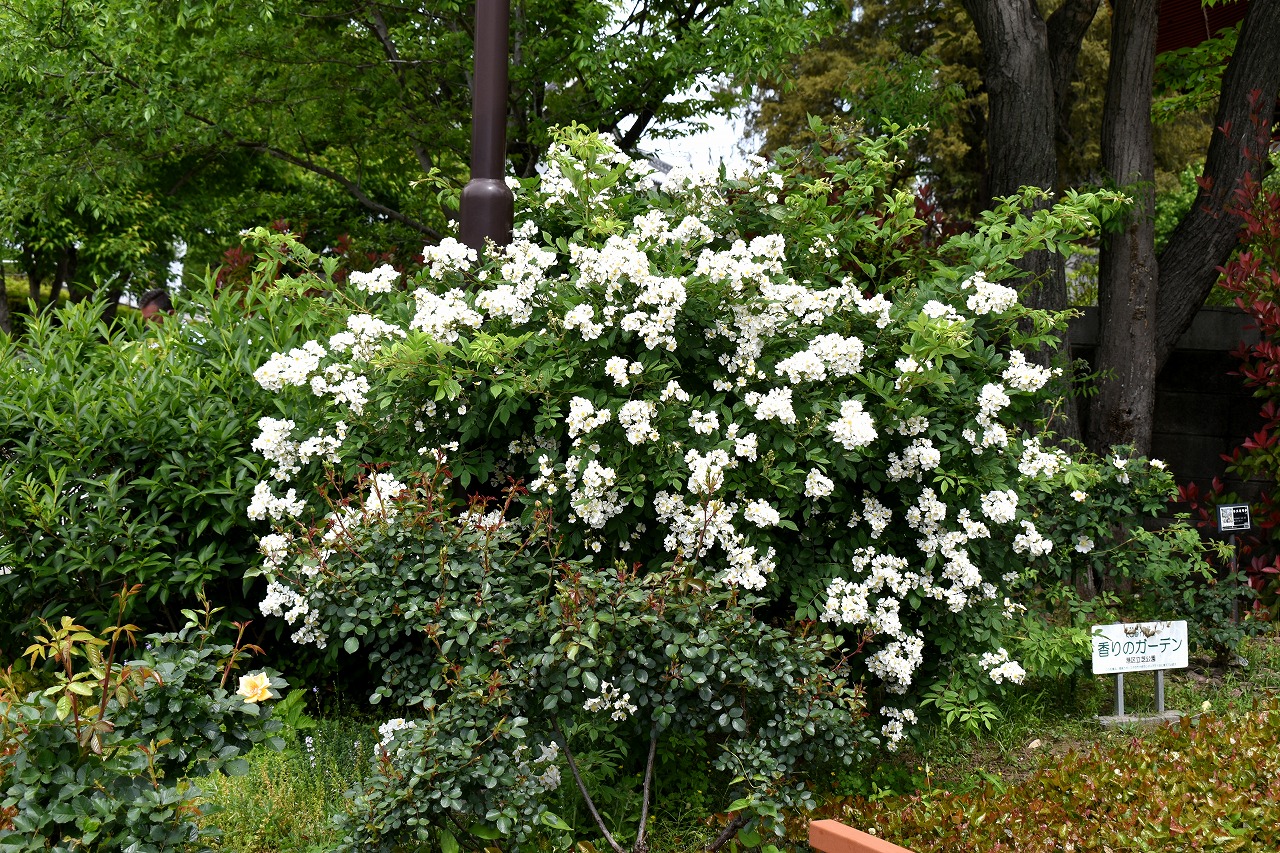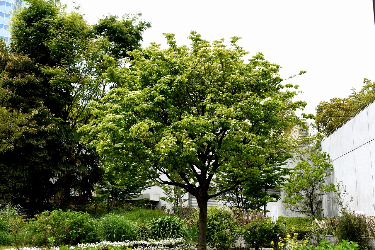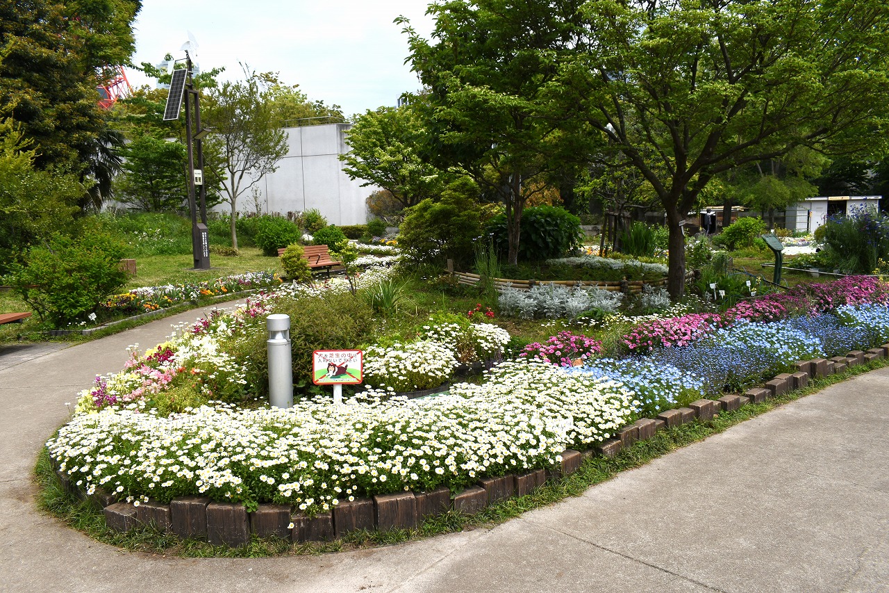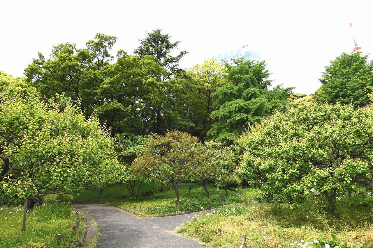 芝公園は新緑が綺麗です。広場にバラの門が出来ました。ベニバナトチノキに花が咲きました。花壇には色々な花が咲いています。