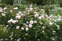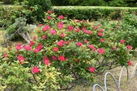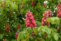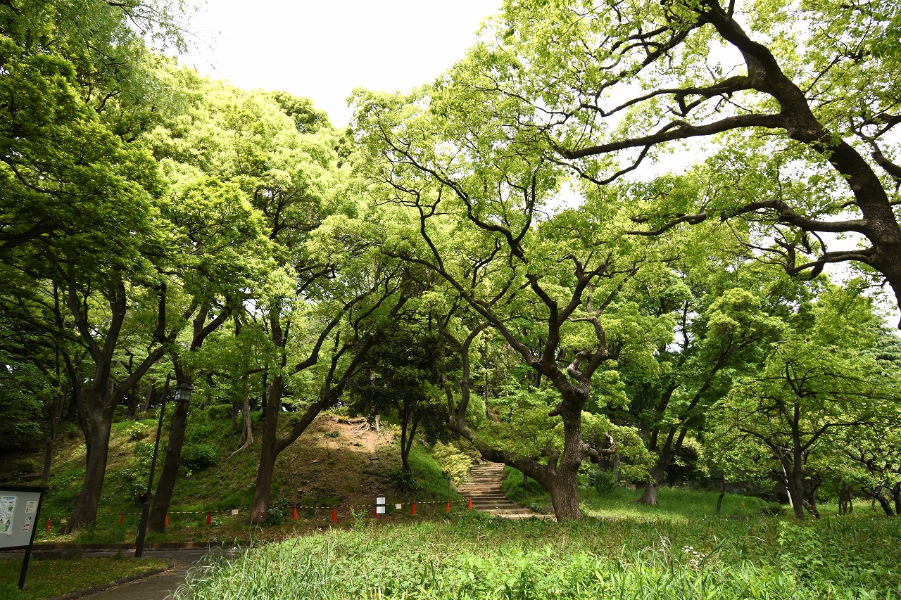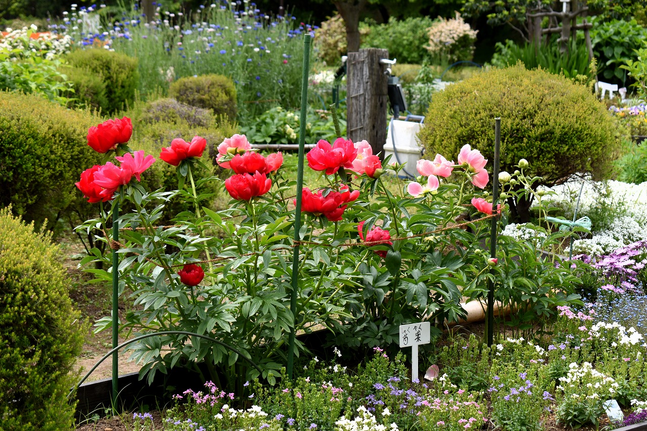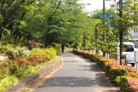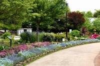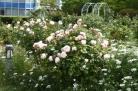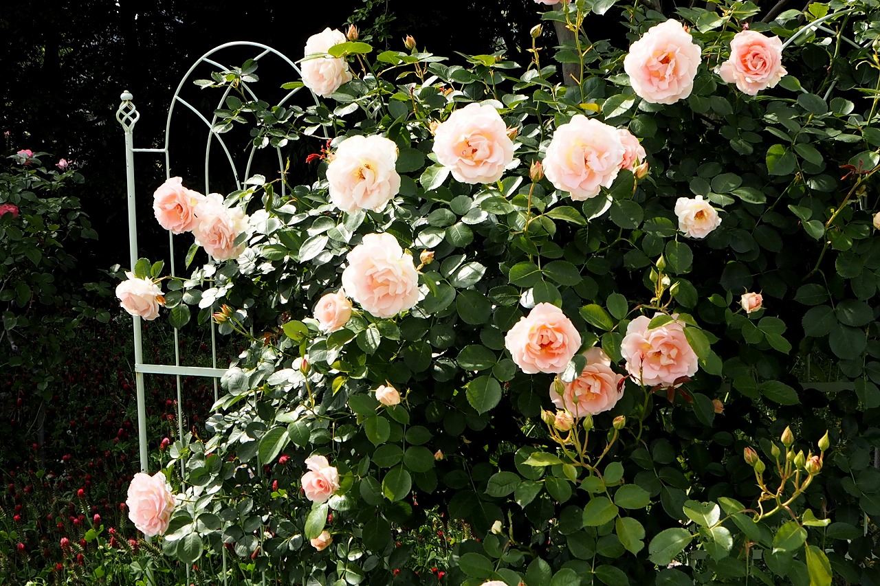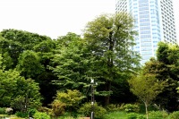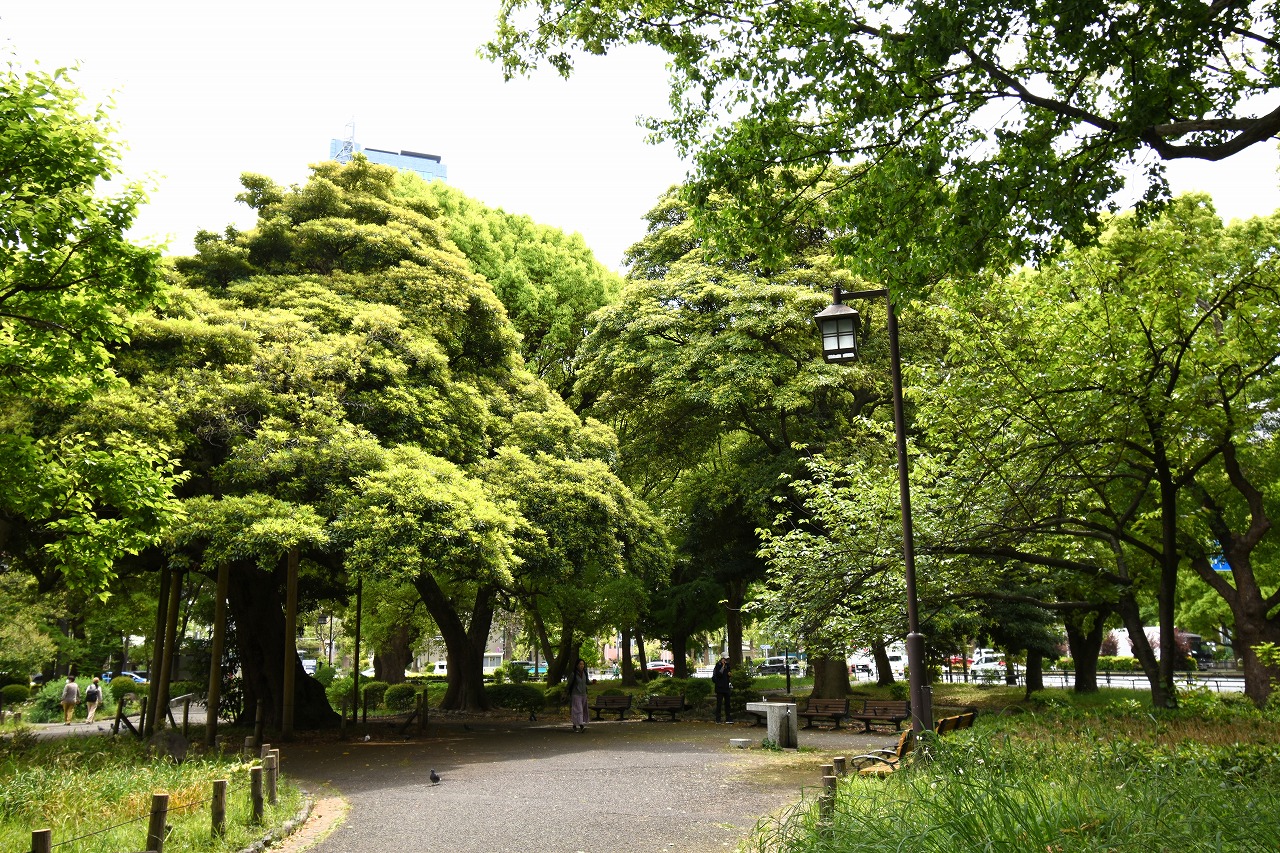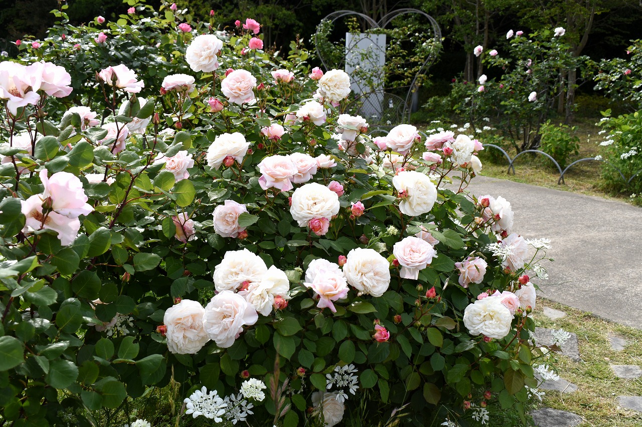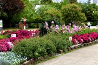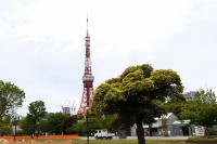 芝公園は新緑が綺麗です。広場にバラの門が出来ました。ベニバナトチノキに花が咲きました。花壇には色々な花が咲いています。