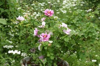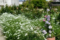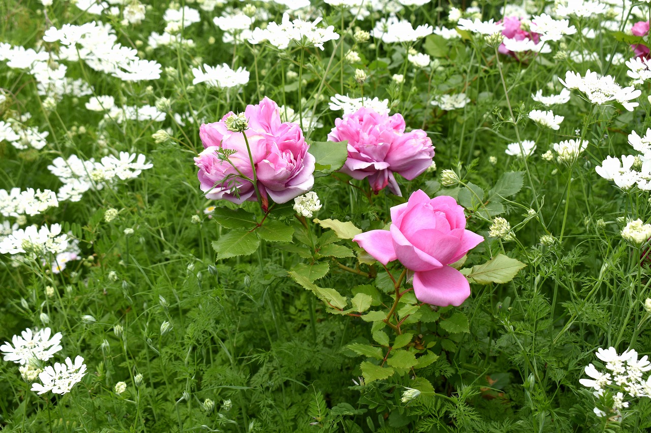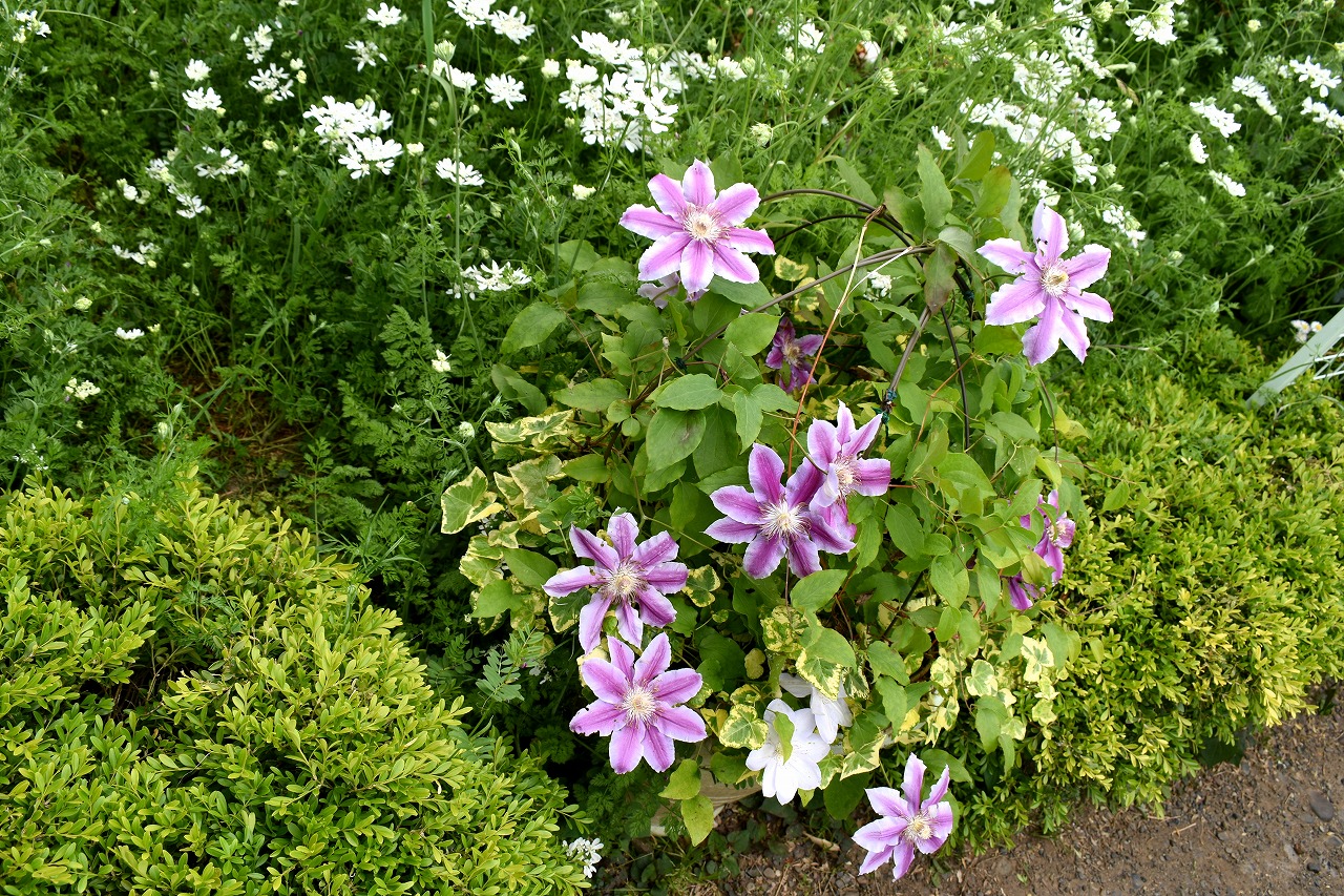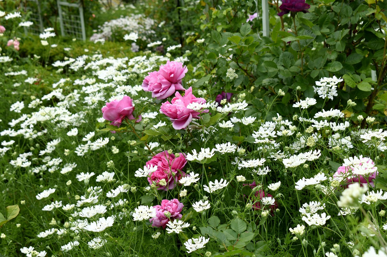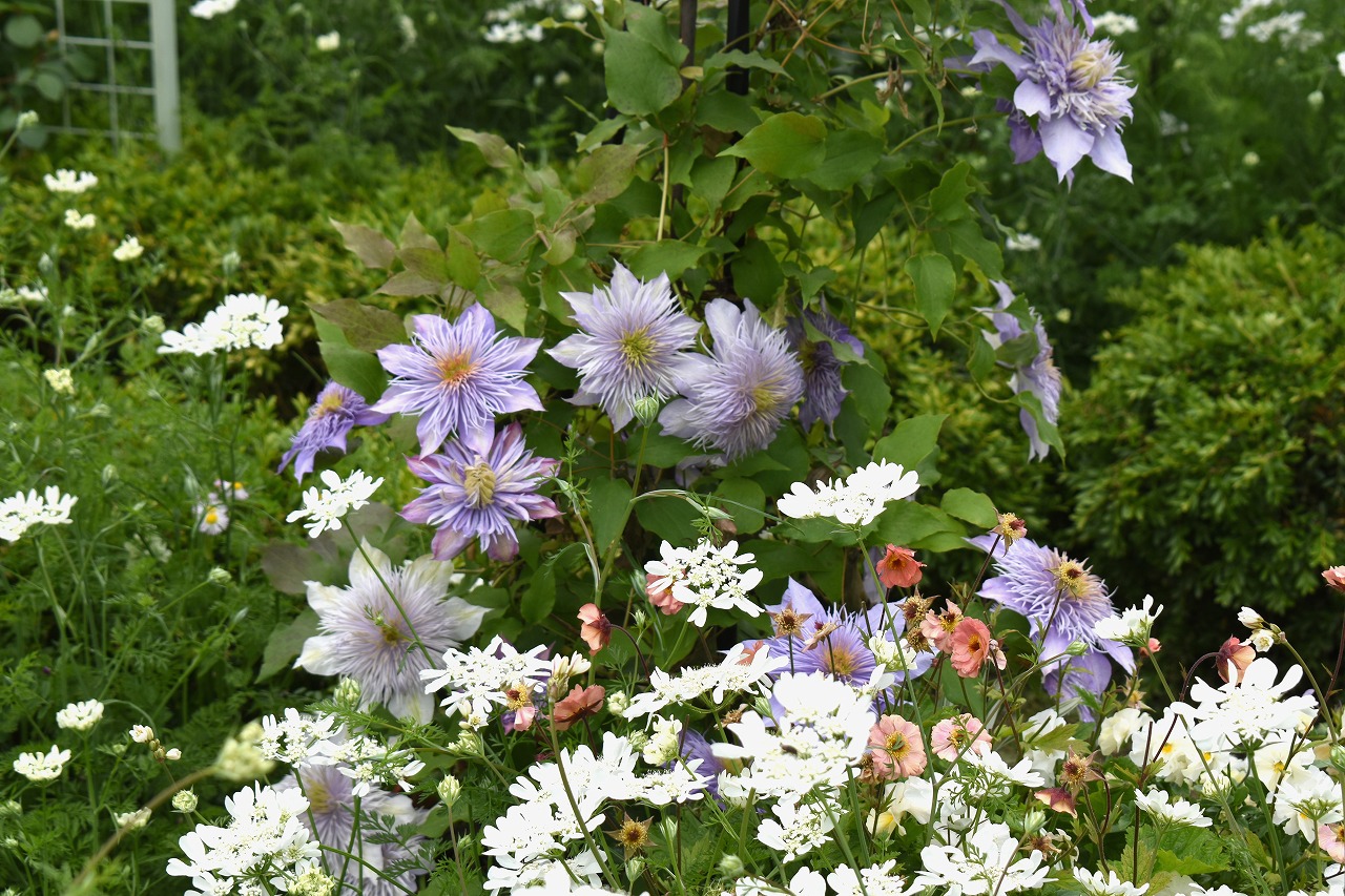 ホワイトレースフラワーも咲いて華やかになっています。色々な色の花が咲いています。渋い濃い茶色の花も咲いています。