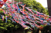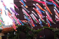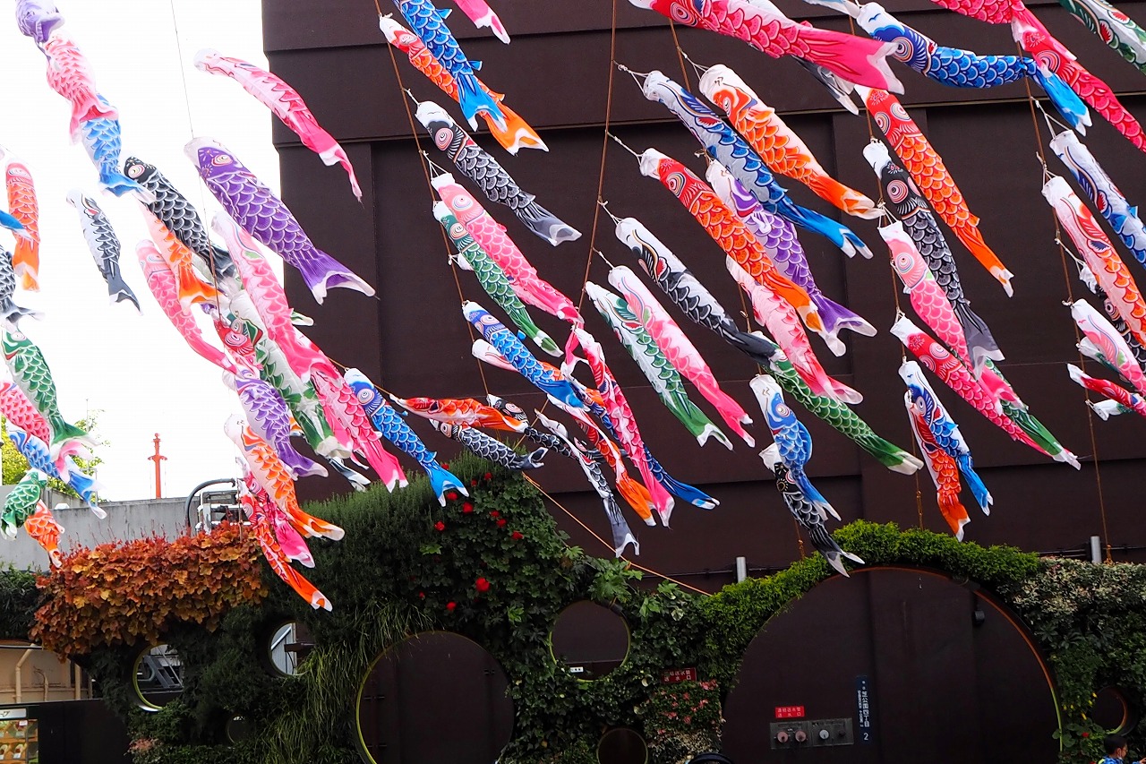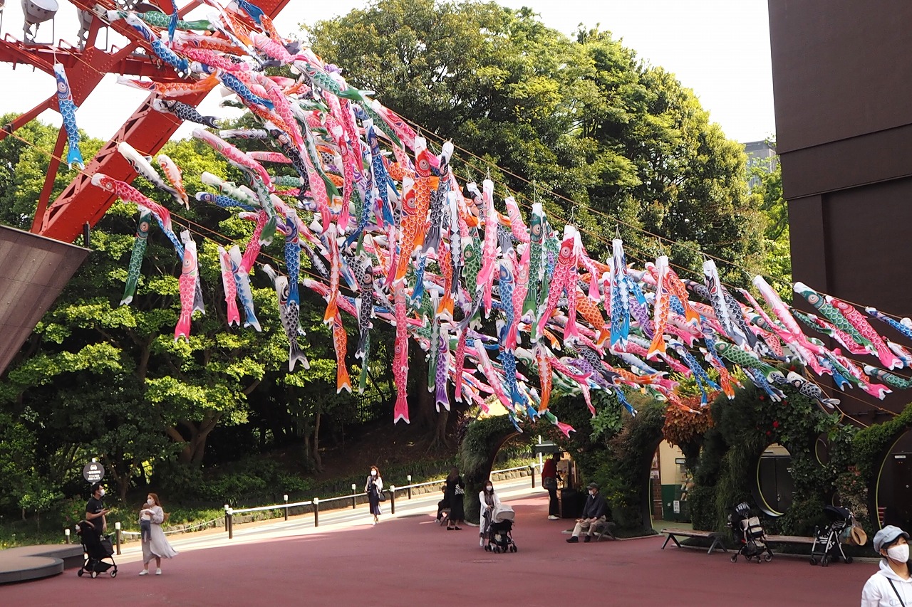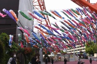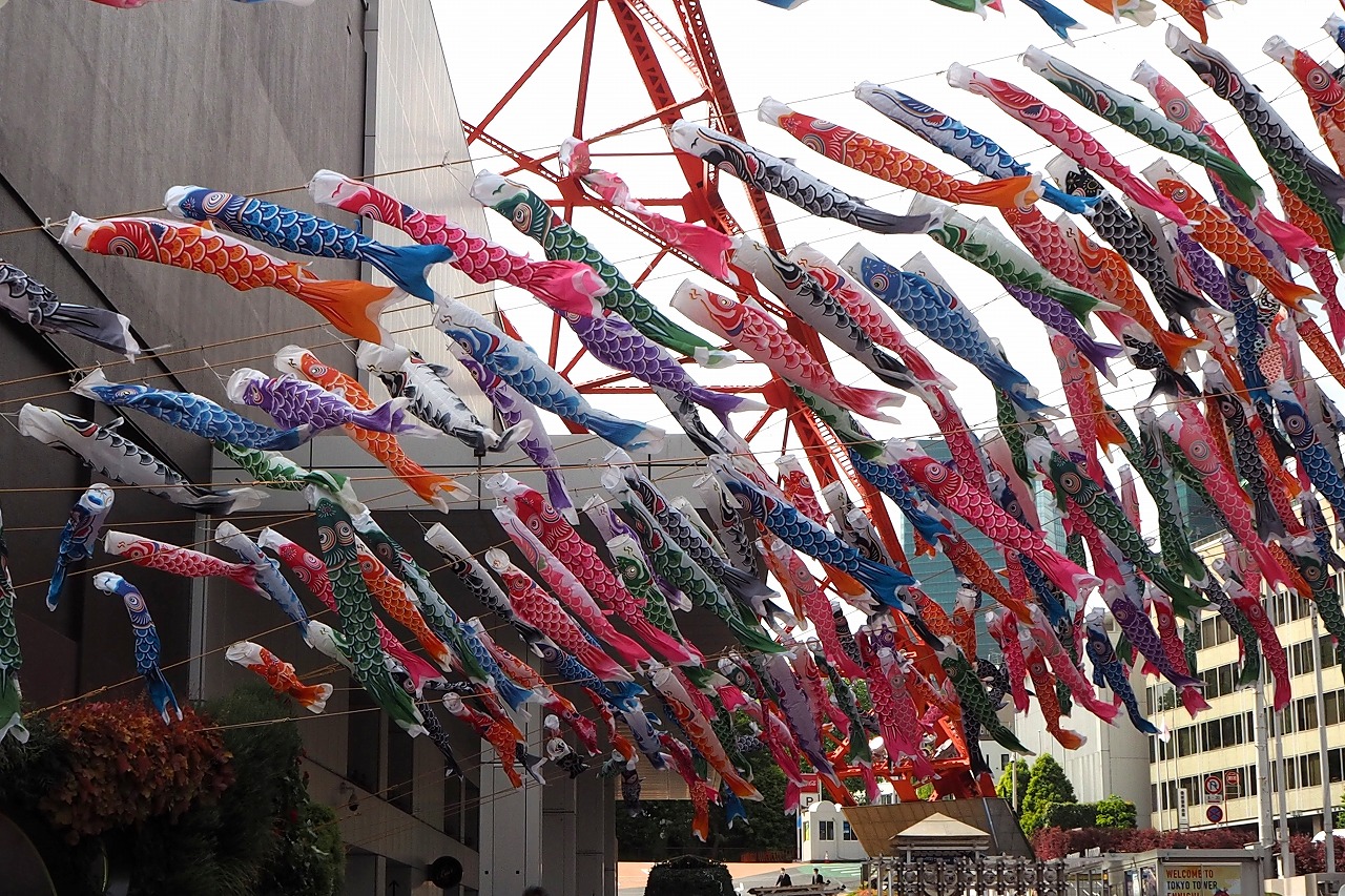 東京タワーの入口には色々な色の鯉のぼりが泳いでします。非常にたくさんの鯉のぼりが青い空に泳ぐのは圧巻です。