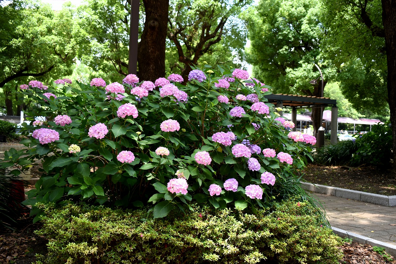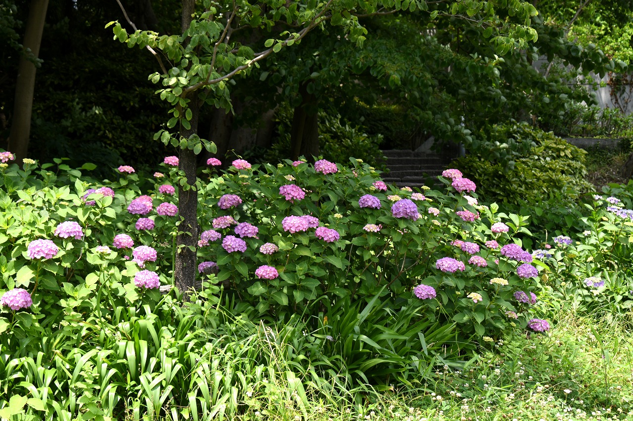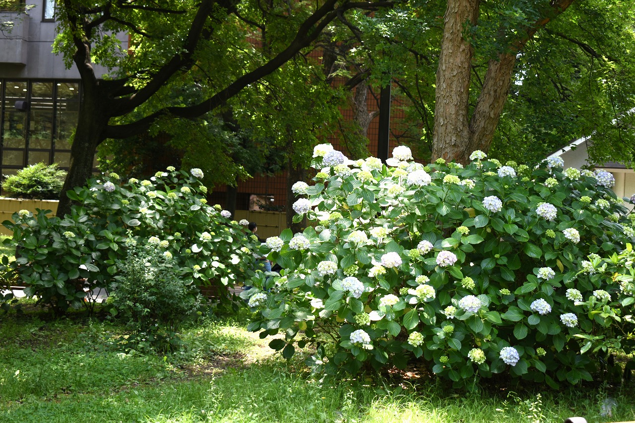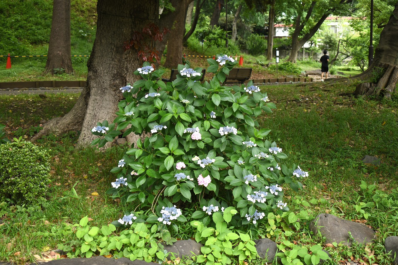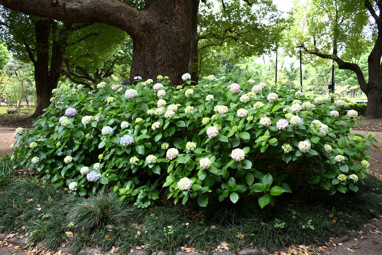 「一言」芝公園のあちこちにアジサイの花が咲いています。区役所の前の大きな木の下にはおおきなアジサイの木があり、たくさんの花をつけています。 時計台の下にもアジサイの花があり、モデルを連れたカメラマンが写真を撮っていました。広場には夾竹桃の花がヒドコートの上に咲いています。 梅林には宮城野萩や木萩が咲いています。ドクダミも一面に咲いていました。