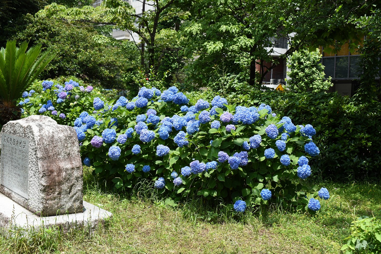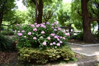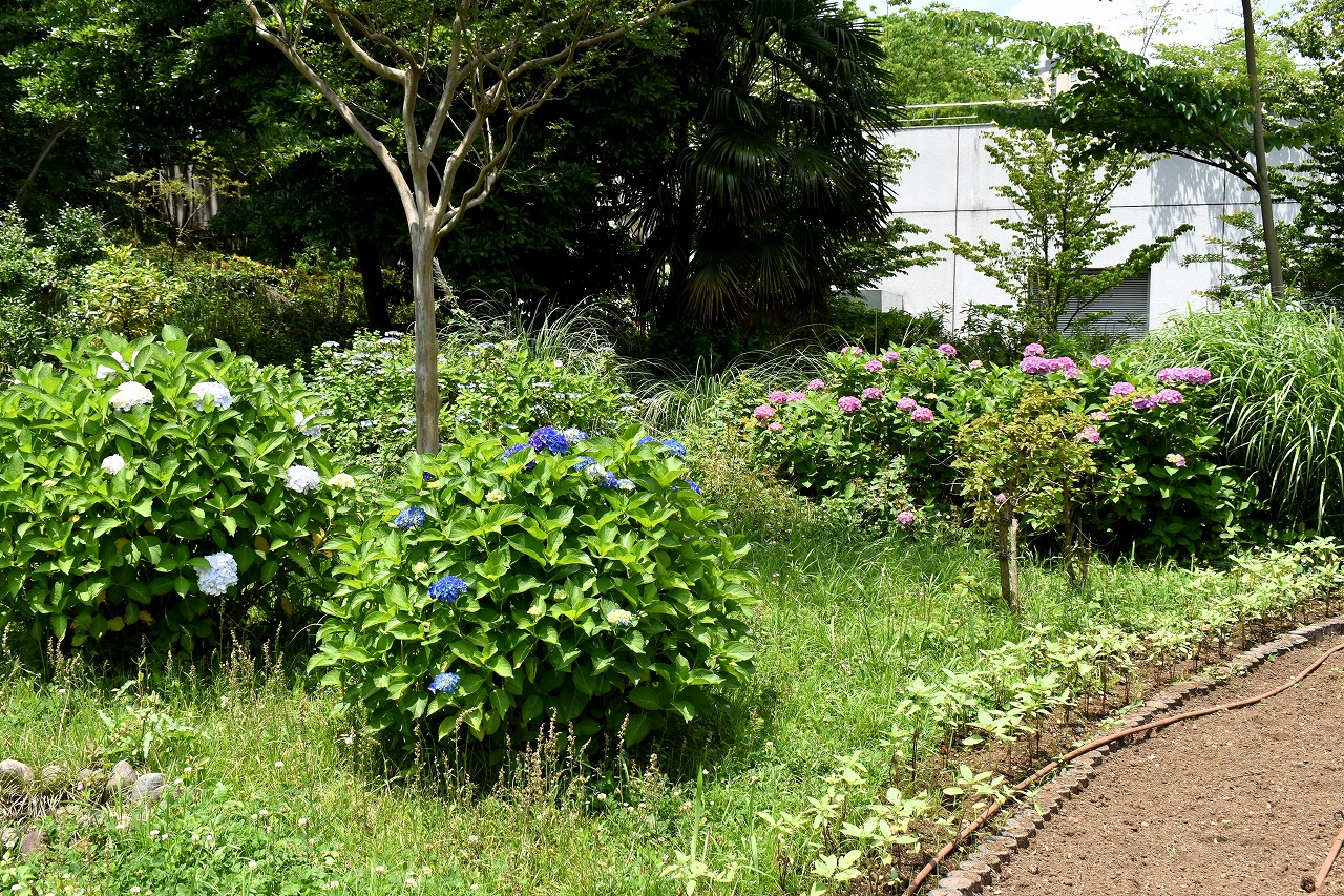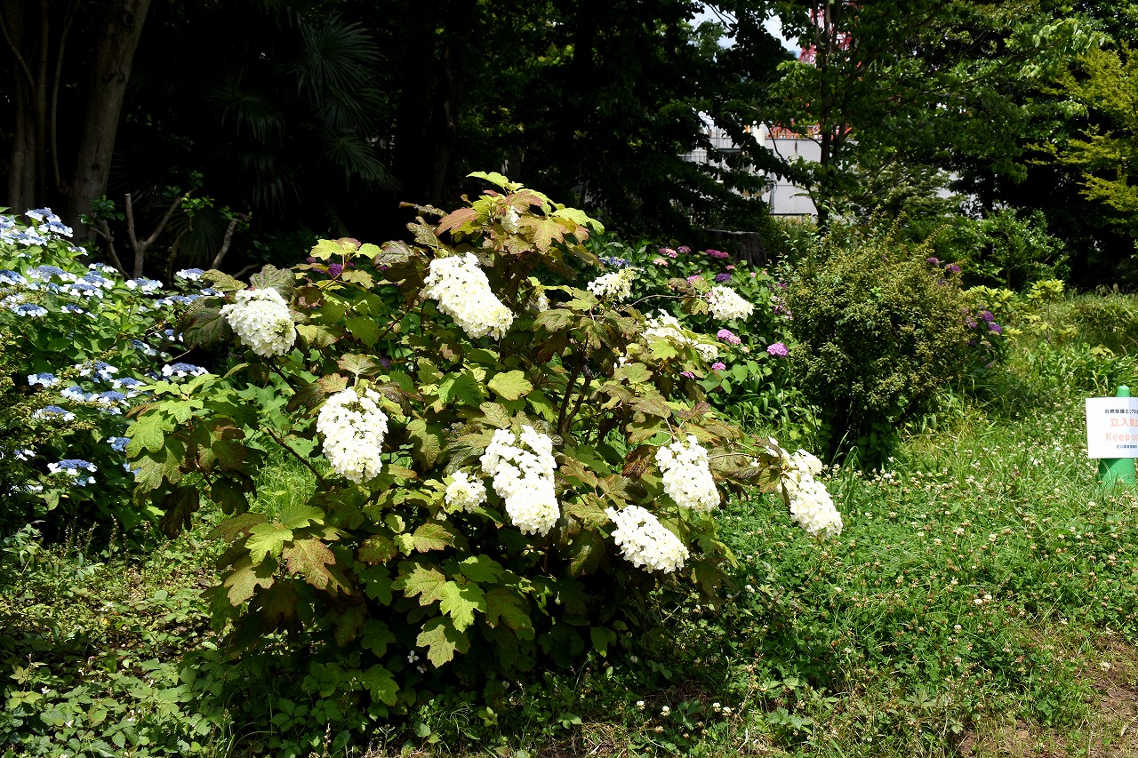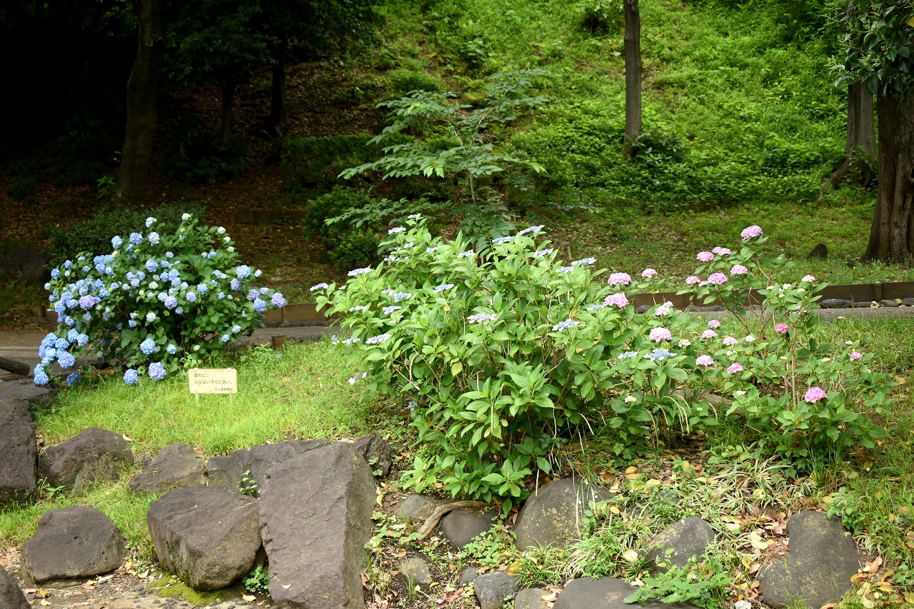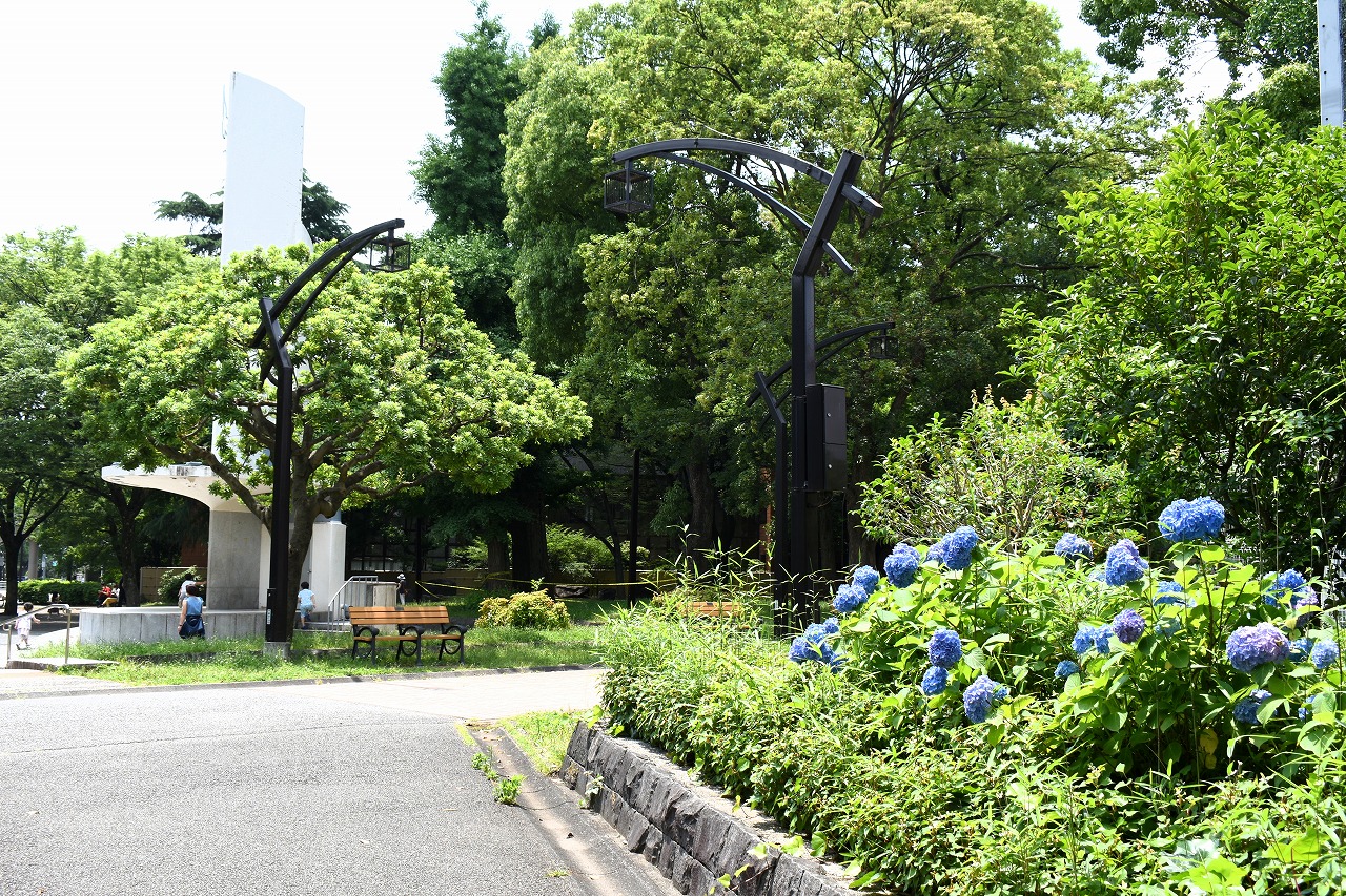 「一言」芝公園のあちこちにアジサイの花が咲いています。区役所の前の大きな木の下にはおおきなアジサイの木があり、たくさんの花をつけています。 時計台の下にもアジサイの花があり、モデルを連れたカメラマンが写真を撮っていました。広場には夾竹桃の花がヒドコートの上に咲いています。 梅林には宮城野萩や木萩が咲いています。ドクダミも一面に咲いていました。