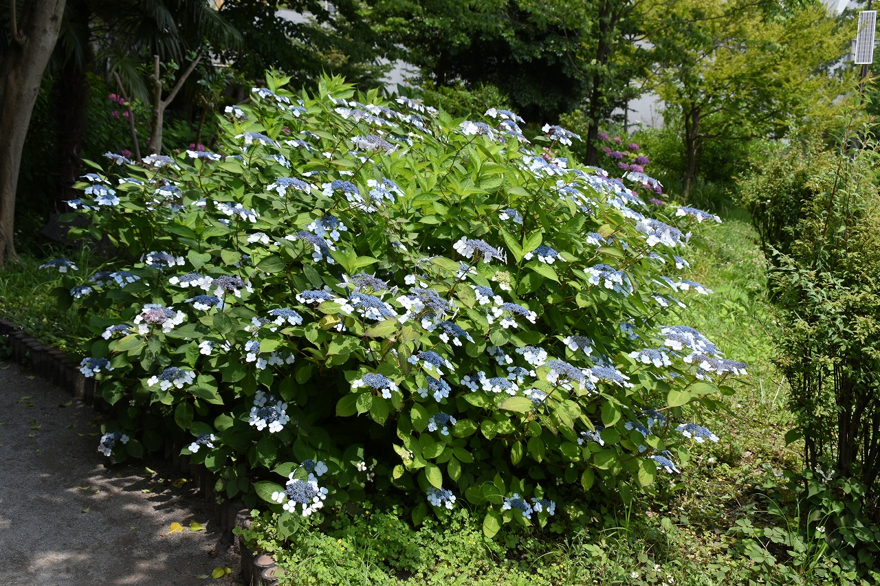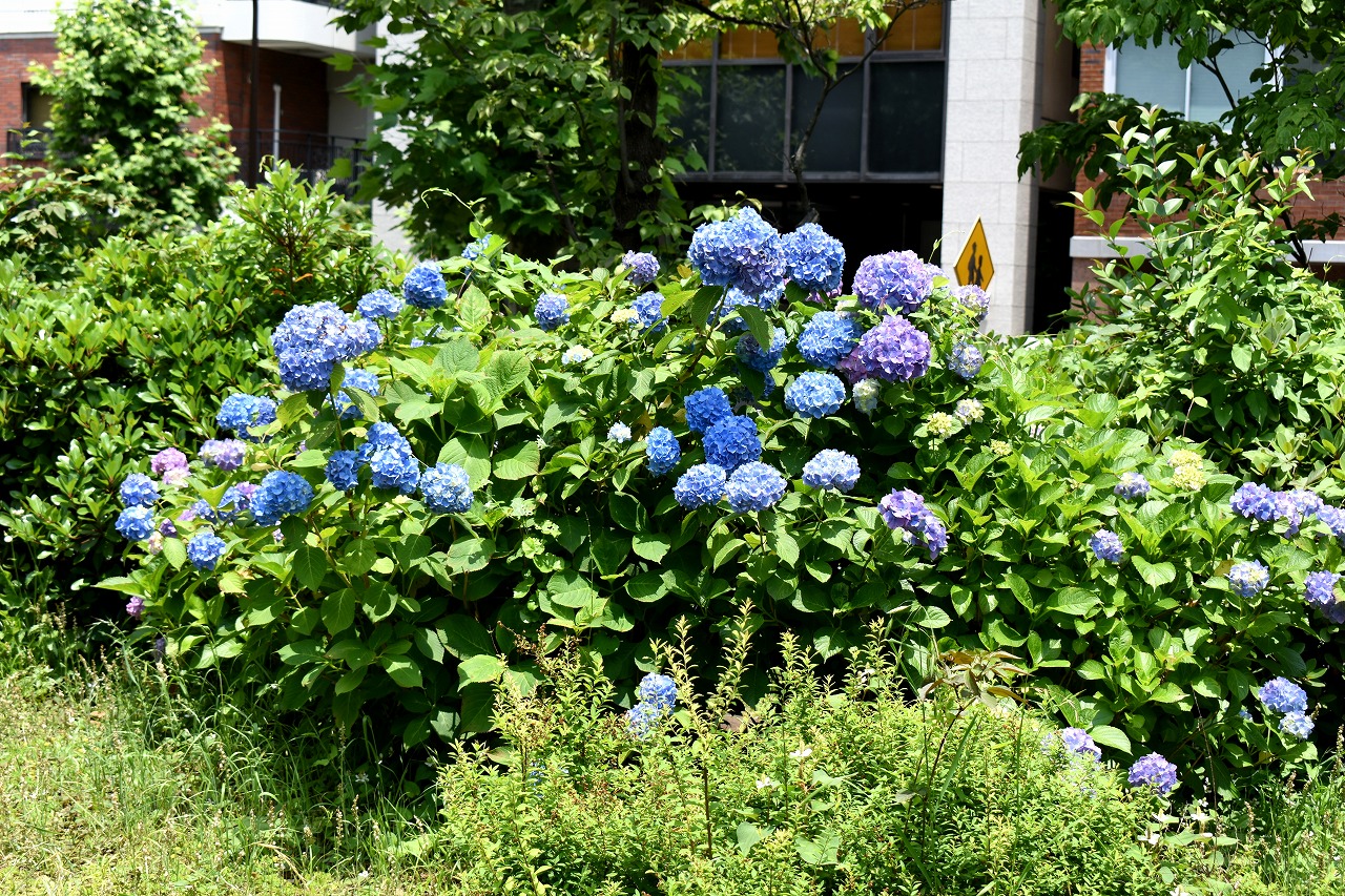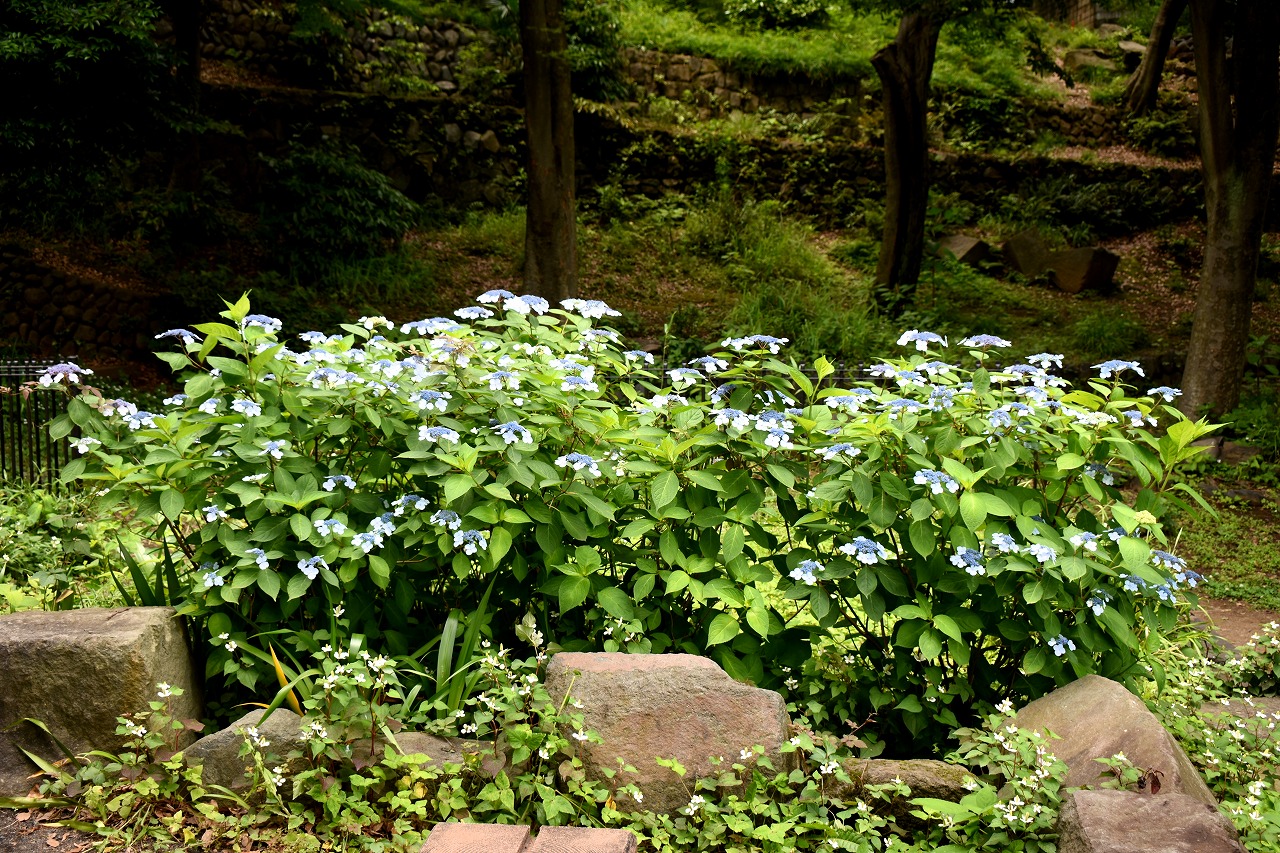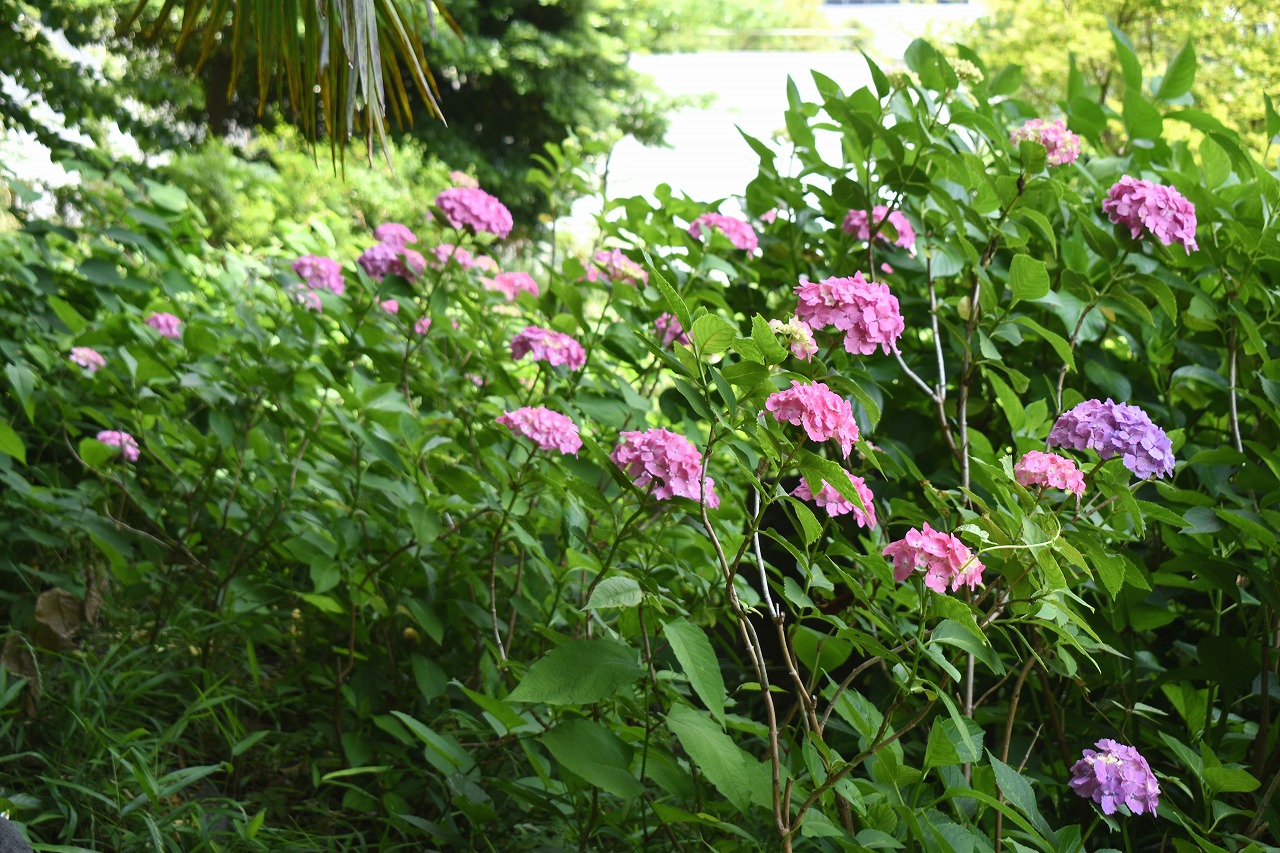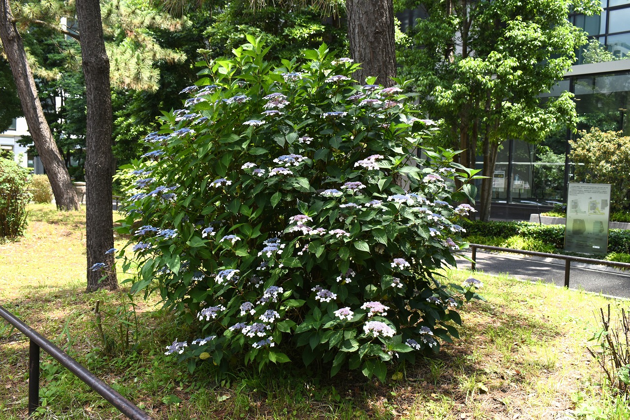 「一言」芝公園のあちこちにアジサイの花が咲いています。区役所の前の大きな木の下にはおおきなアジサイの木があり、たくさんの花をつけています。 時計台の下にもアジサイの花があり、モデルを連れたカメラマンが写真を撮っていました。広場には夾竹桃の花がヒドコートの上に咲いています。 梅林には宮城野萩や木萩が咲いています。ドクダミも一面に咲いていました。
