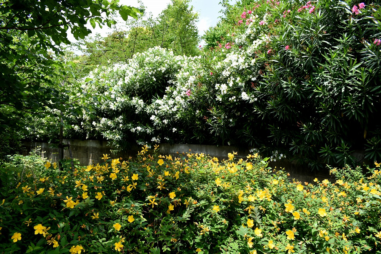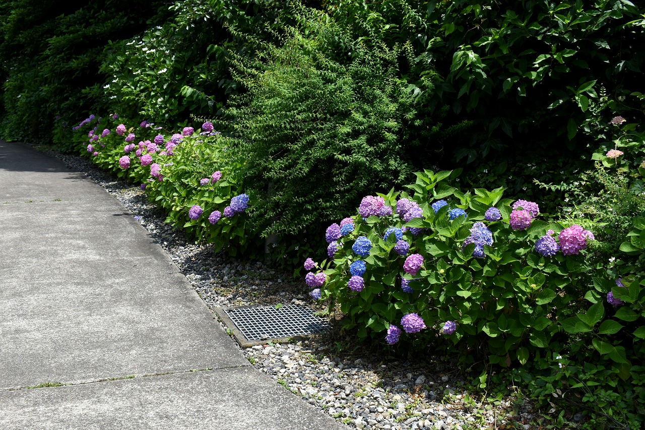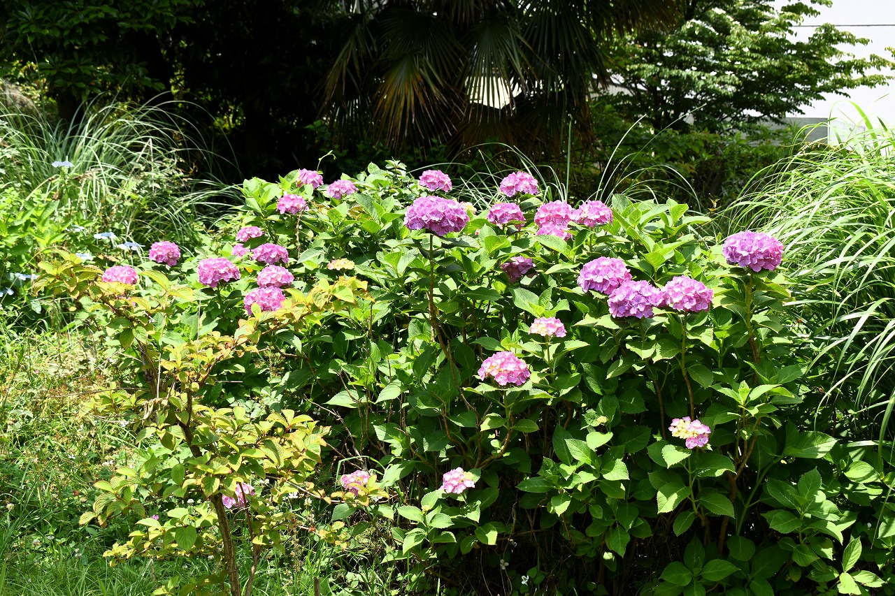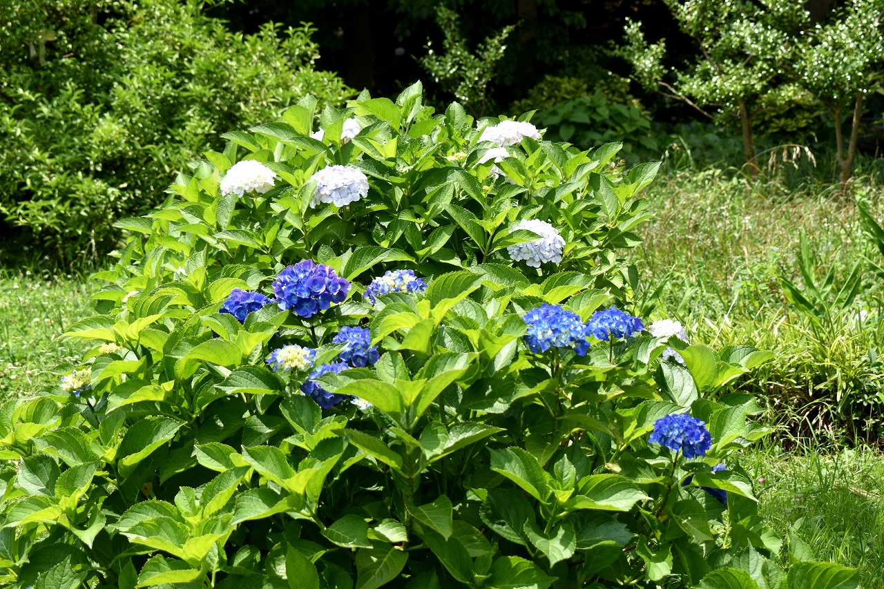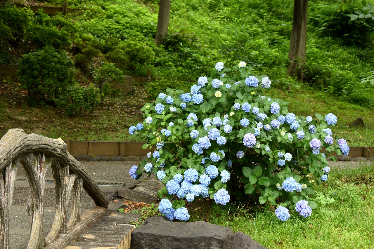 「一言」芝公園のあちこちにアジサイの花が咲いています。区役所の前の大きな木の下にはおおきなアジサイの木があり、たくさんの花をつけています。 時計台の下にもアジサイの花があり、モデルを連れたカメラマンが写真を撮っていました。広場には夾竹桃の花がヒドコートの上に咲いています。 梅林には宮城野萩や木萩が咲いています。ドクダミも一面に咲いていました。