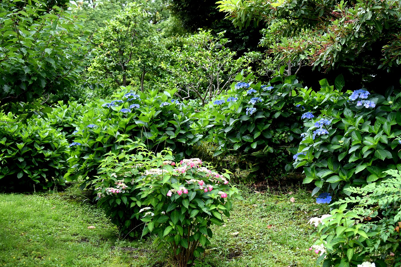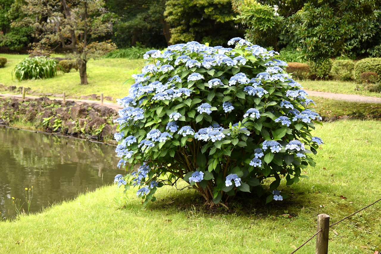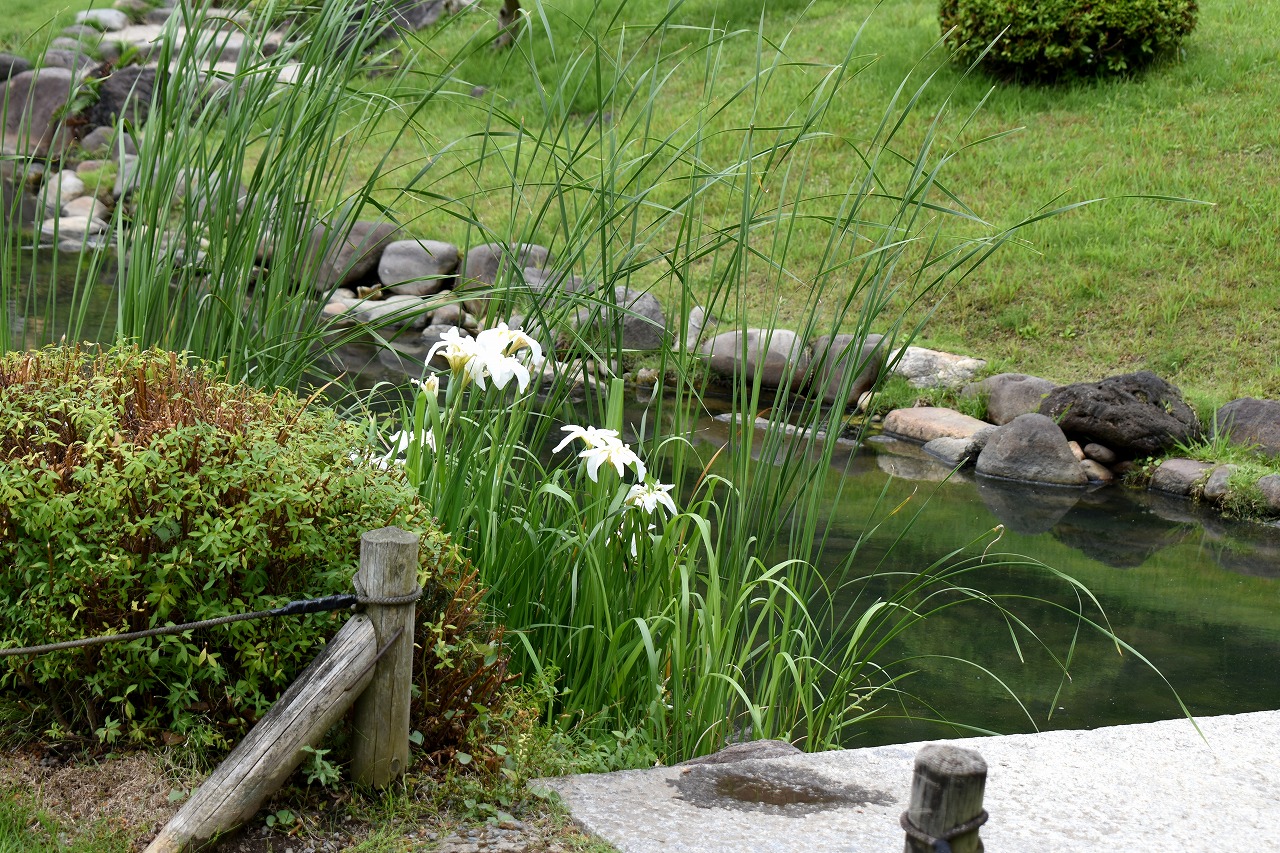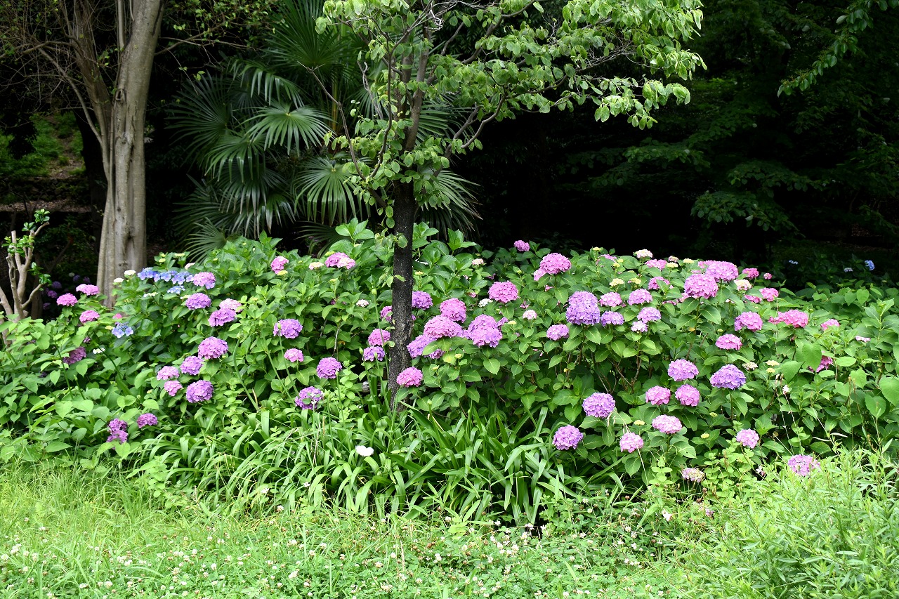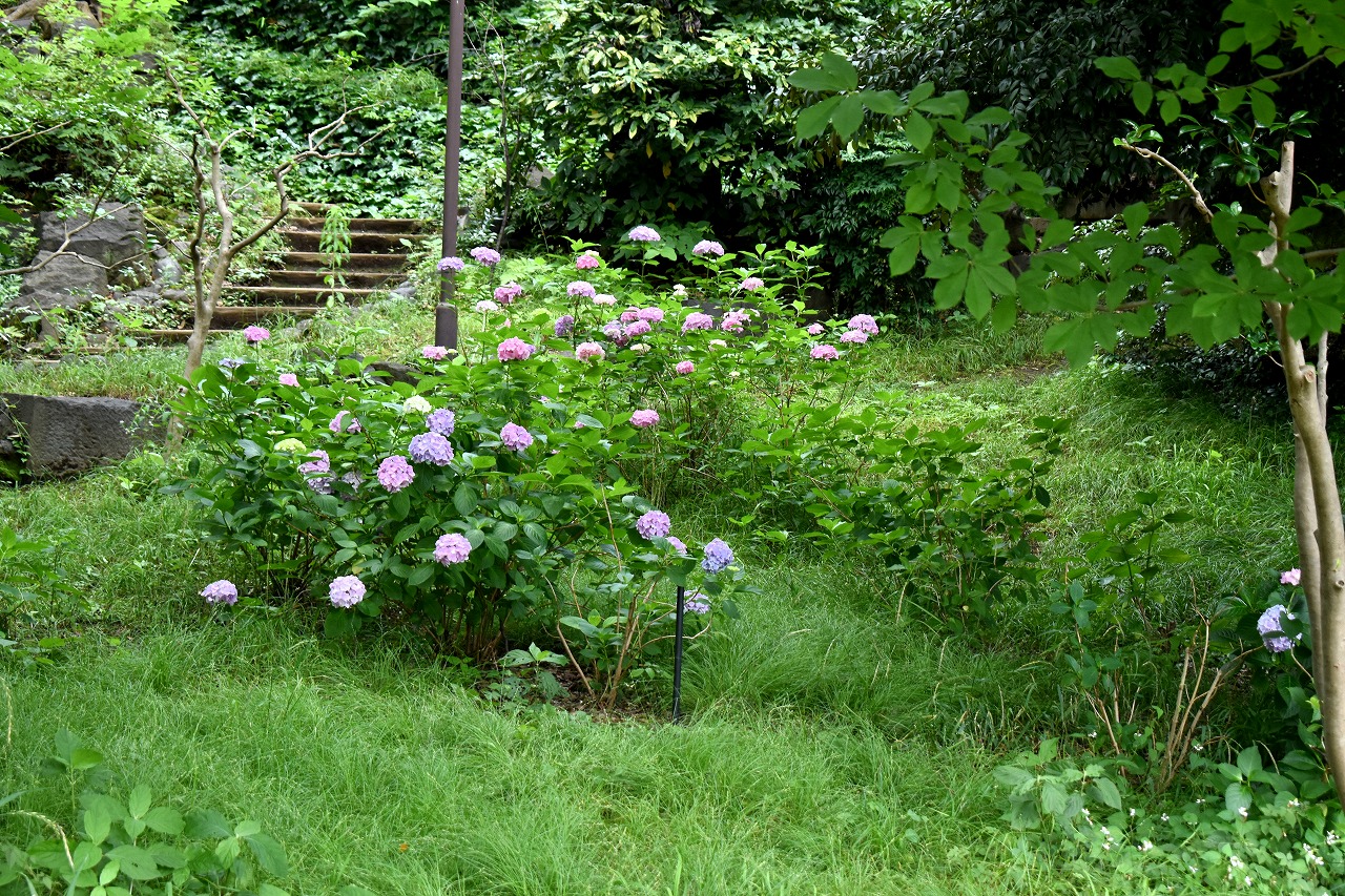 インドハマユウや花菖蒲の花が咲いていました。庭園内にはあちこちにアジサイの花が咲いて綺麗でした。ピンク色や黄色い小さな