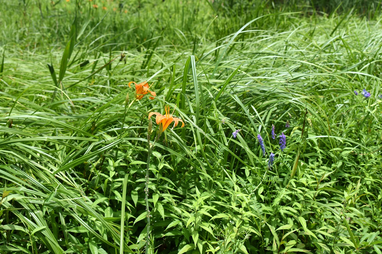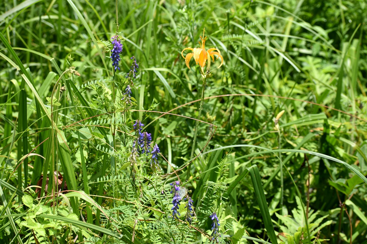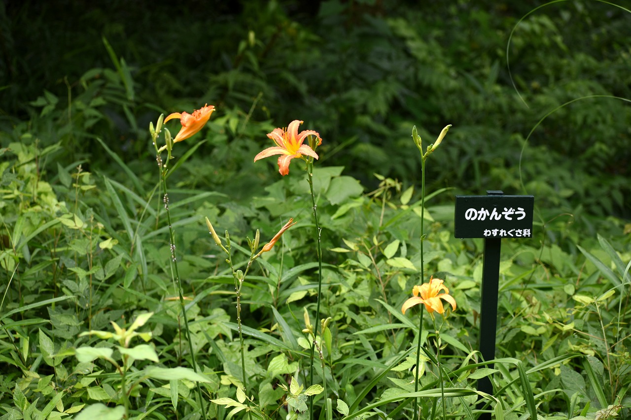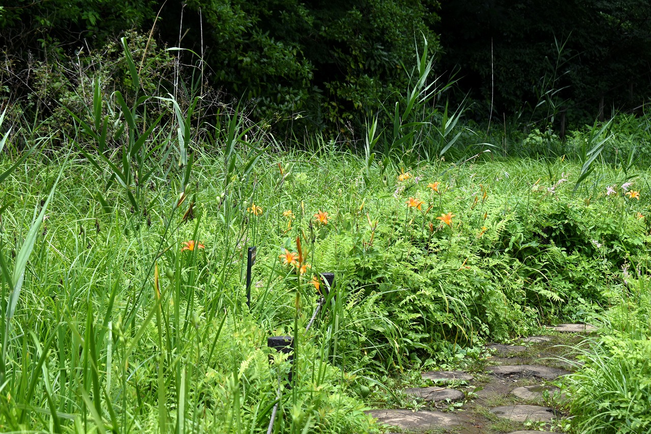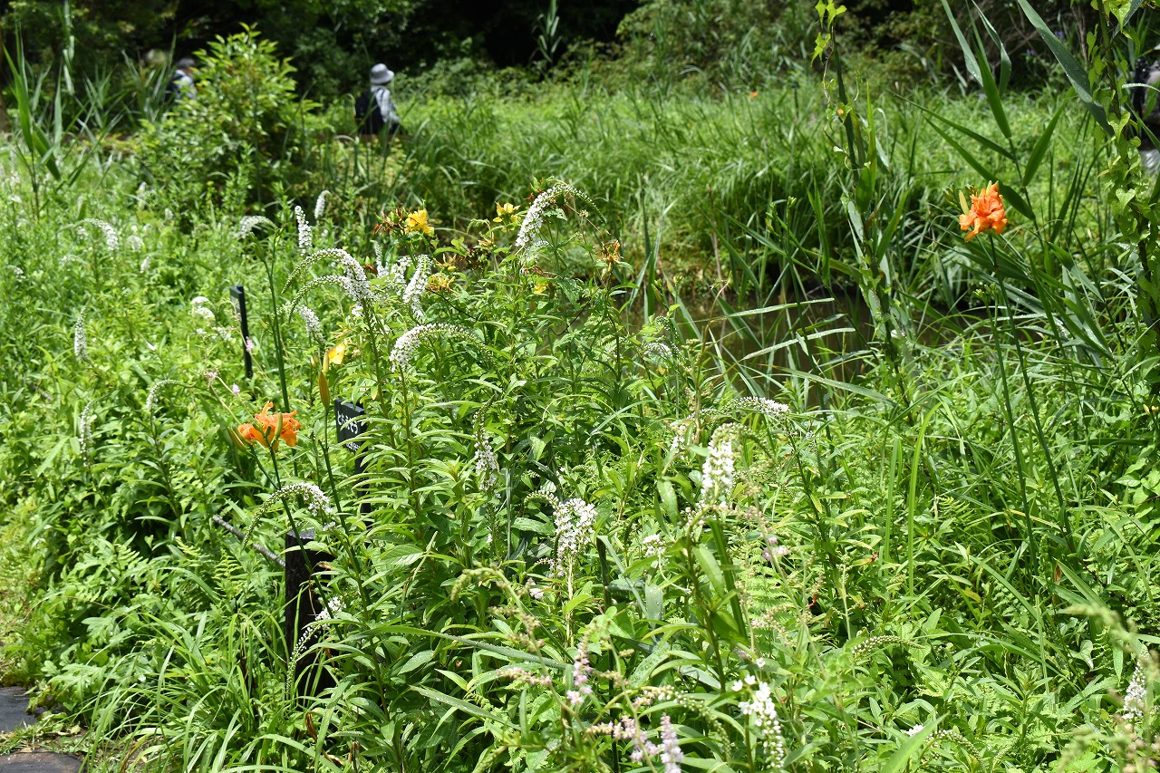 「一言」自然教育園にはノカンゾウ、ヤブカンゾウなどがたくさん咲いています。ヤブレガサやオオハギギボウシ、イヌヌマトラノオ、 トモエソウ、クサフジなど色々な花が咲いています。池には黄色い小さなアサザが咲いています。