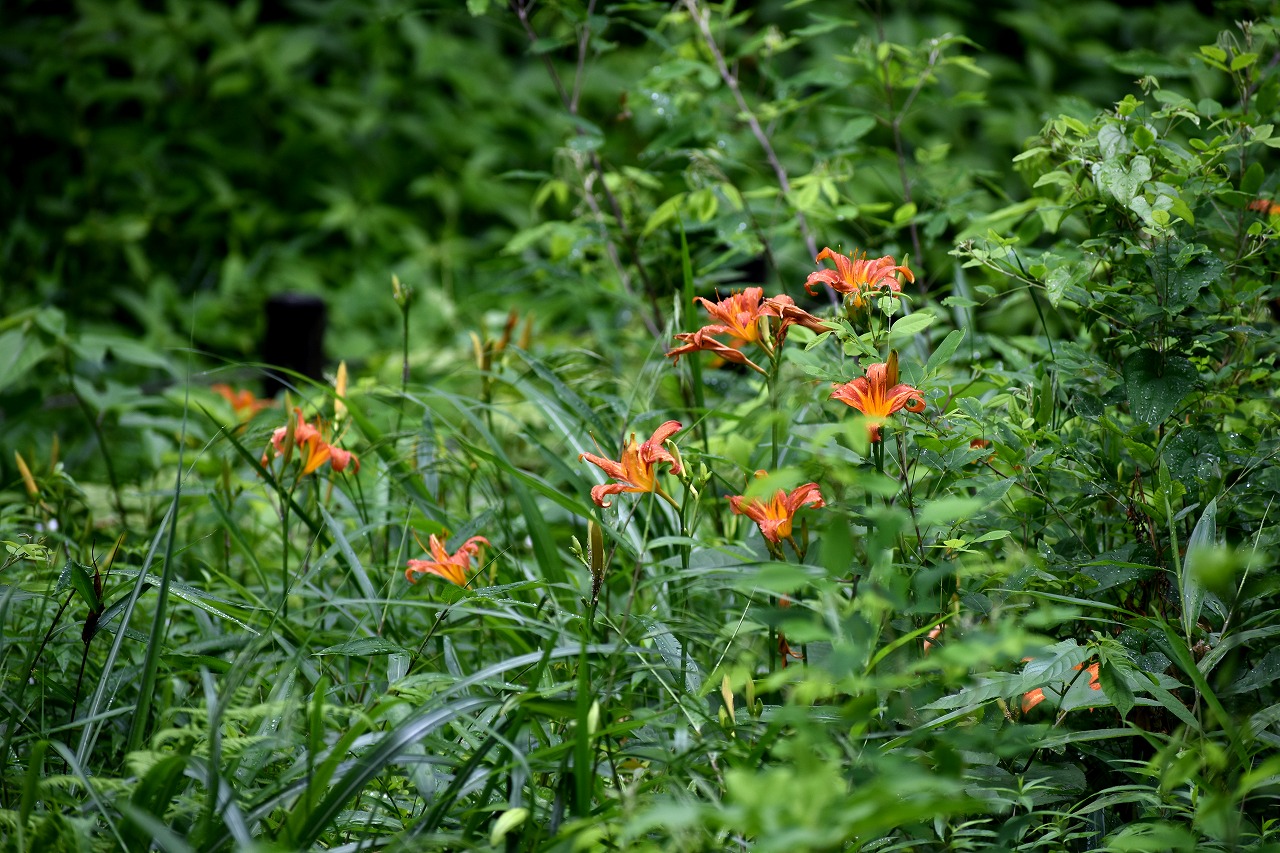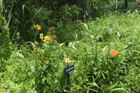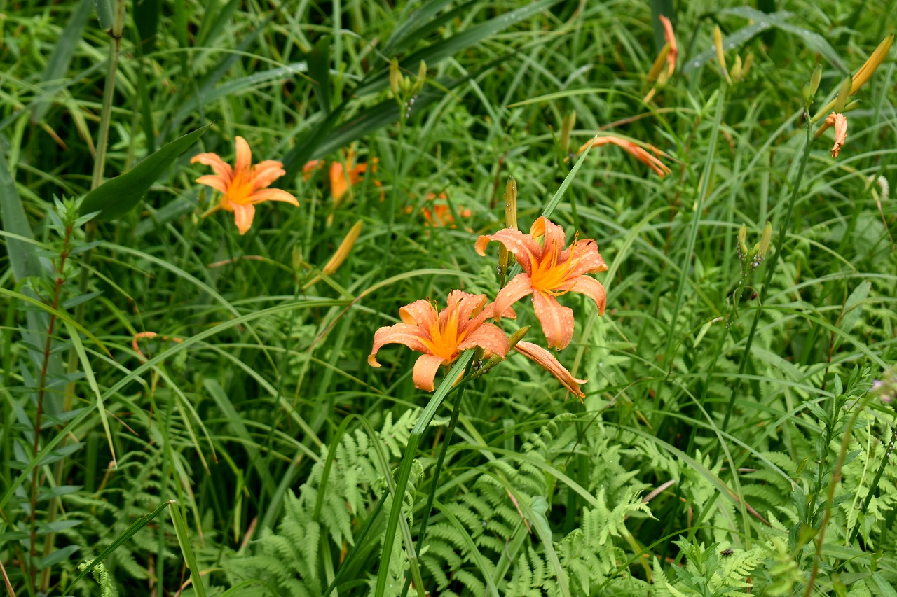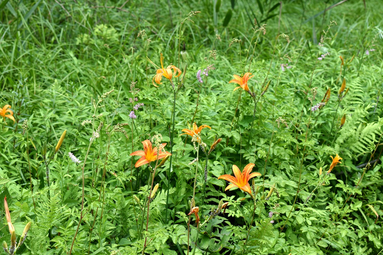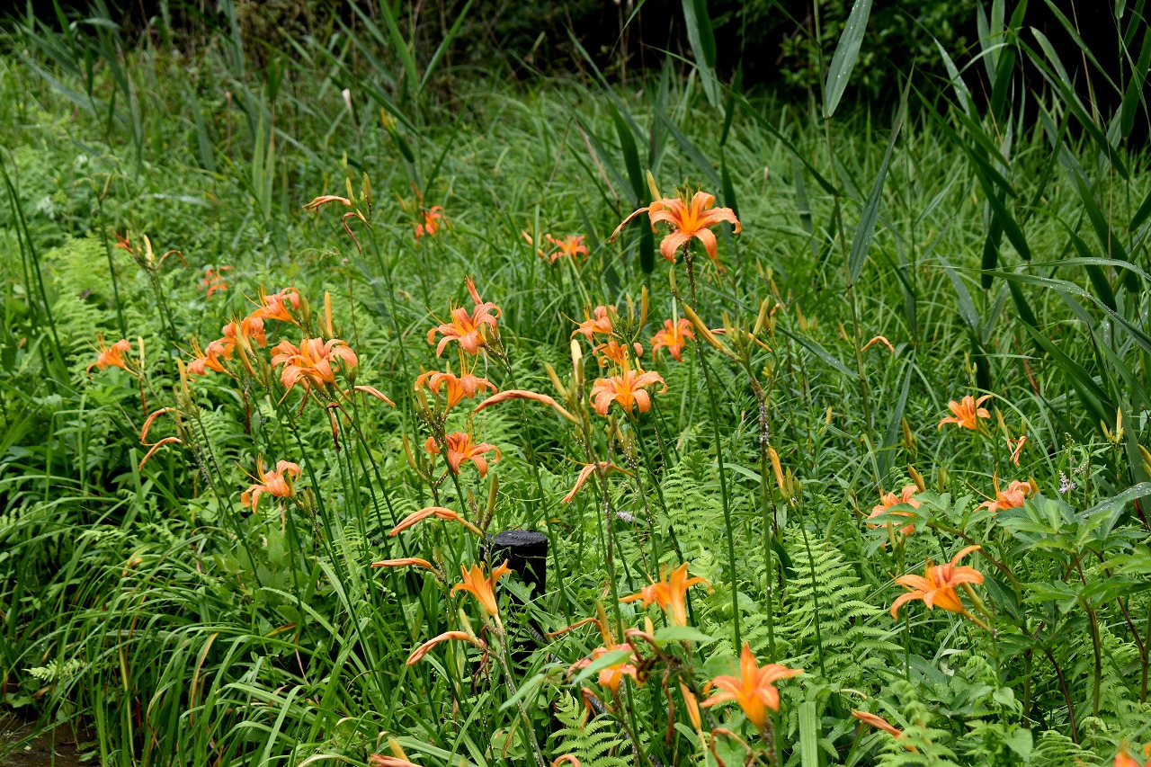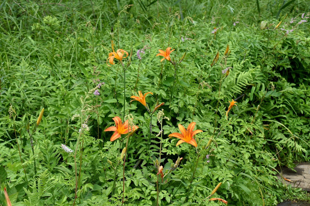「一言」自然教育園にはノカンゾウ、ヤブカンゾウなどがたくさん咲いています。ヤブレガサやオオハギギボウシ、イヌヌマトラノオ、 トモエソウ、クサフジなど色々な花が咲いています。池には黄色い小さなアサザが咲いています。