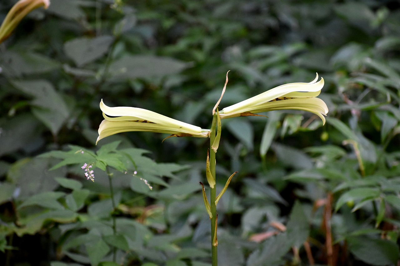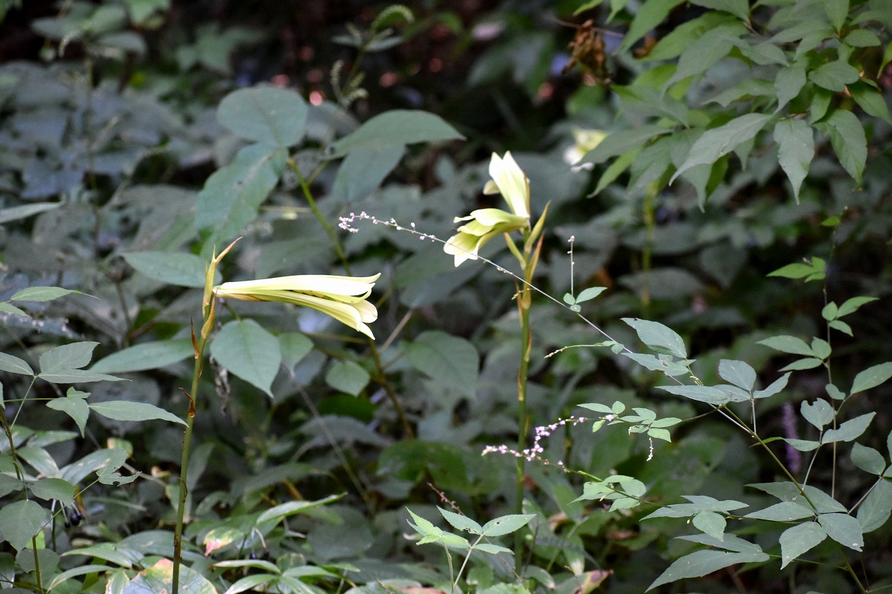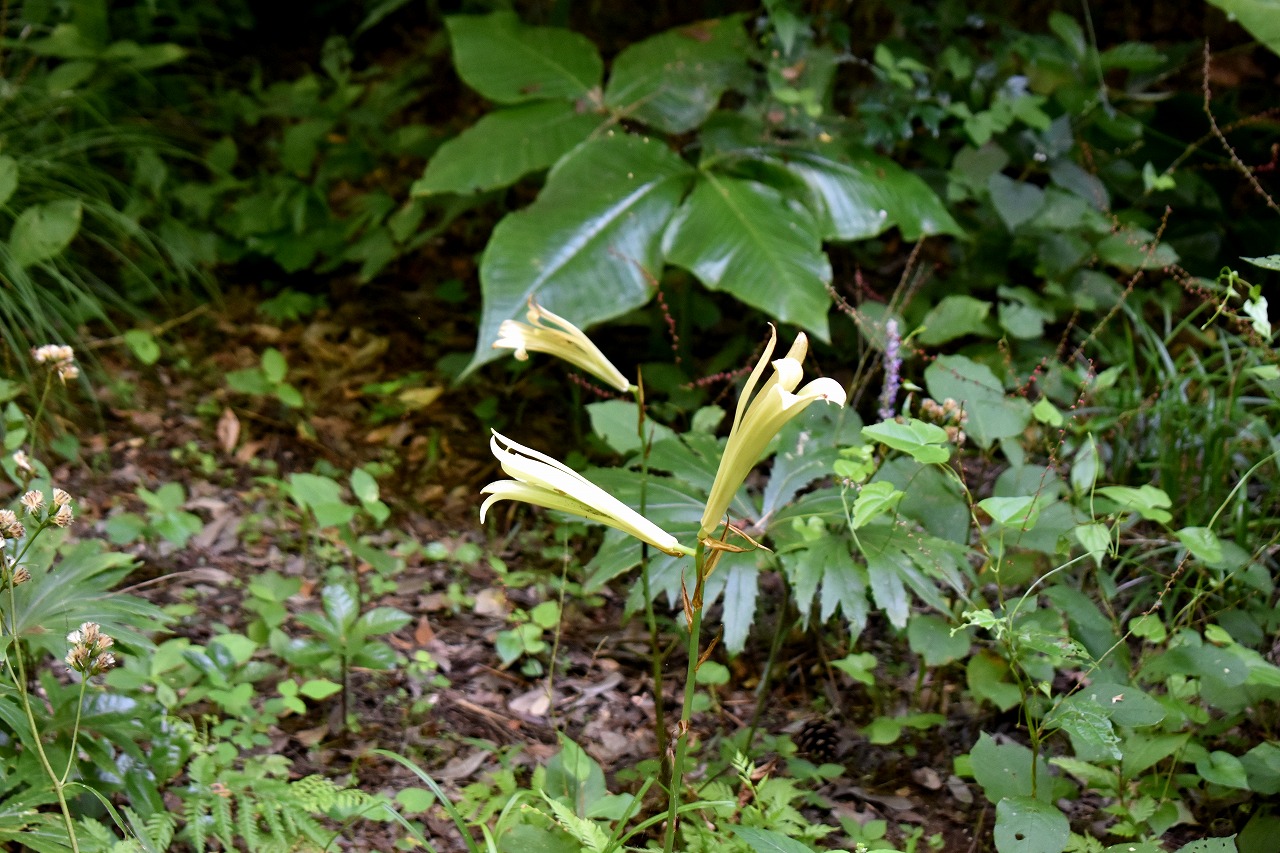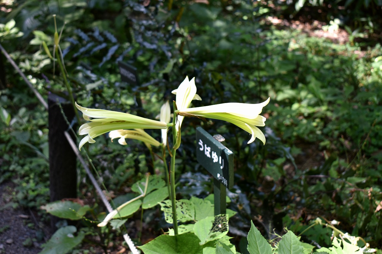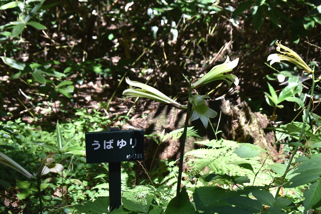 「一言」自然教育園にはウバユリがたくさん咲いています。黄色いキンミズヒキの花やオレンジ色のキツネノカミソリという花も咲いています。