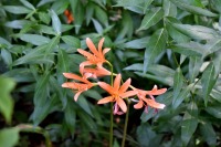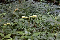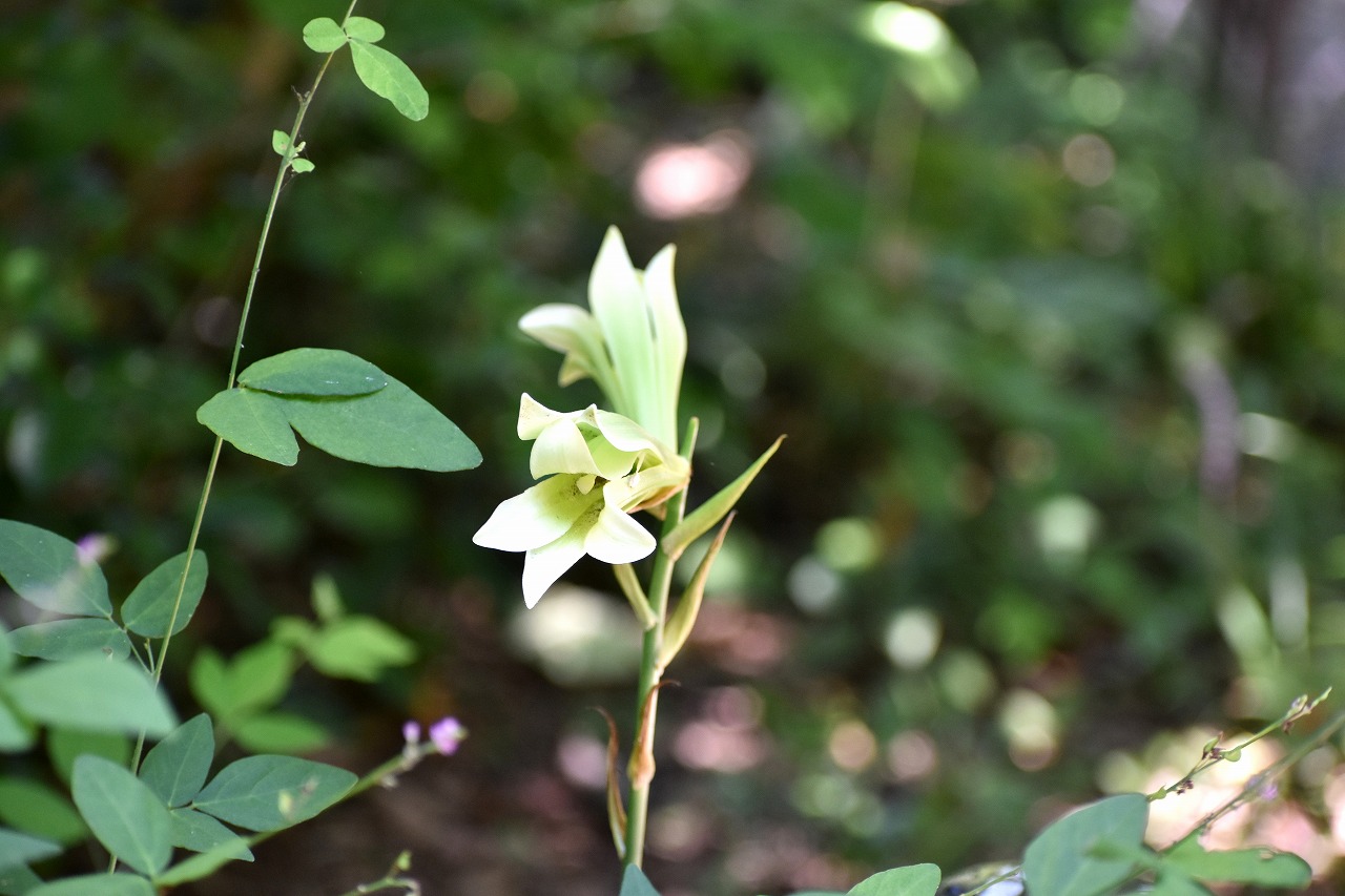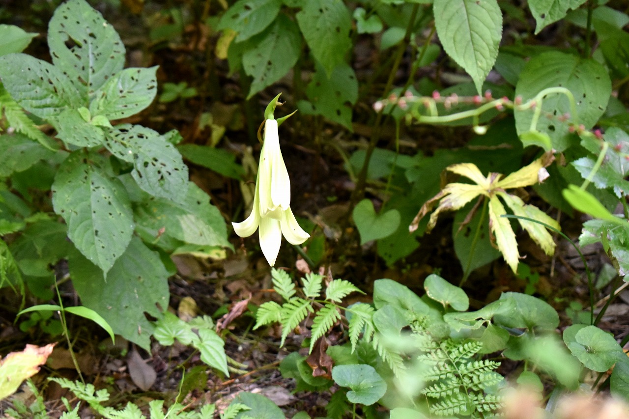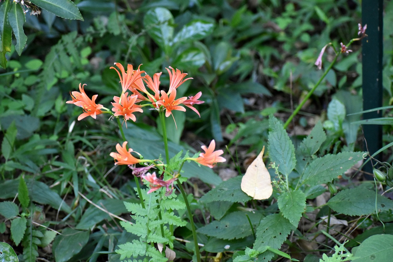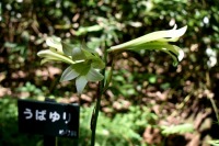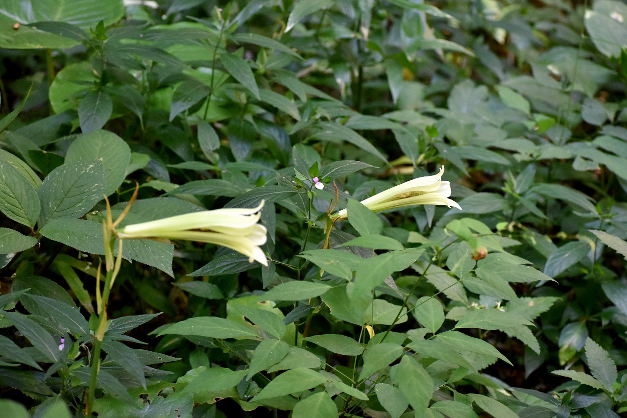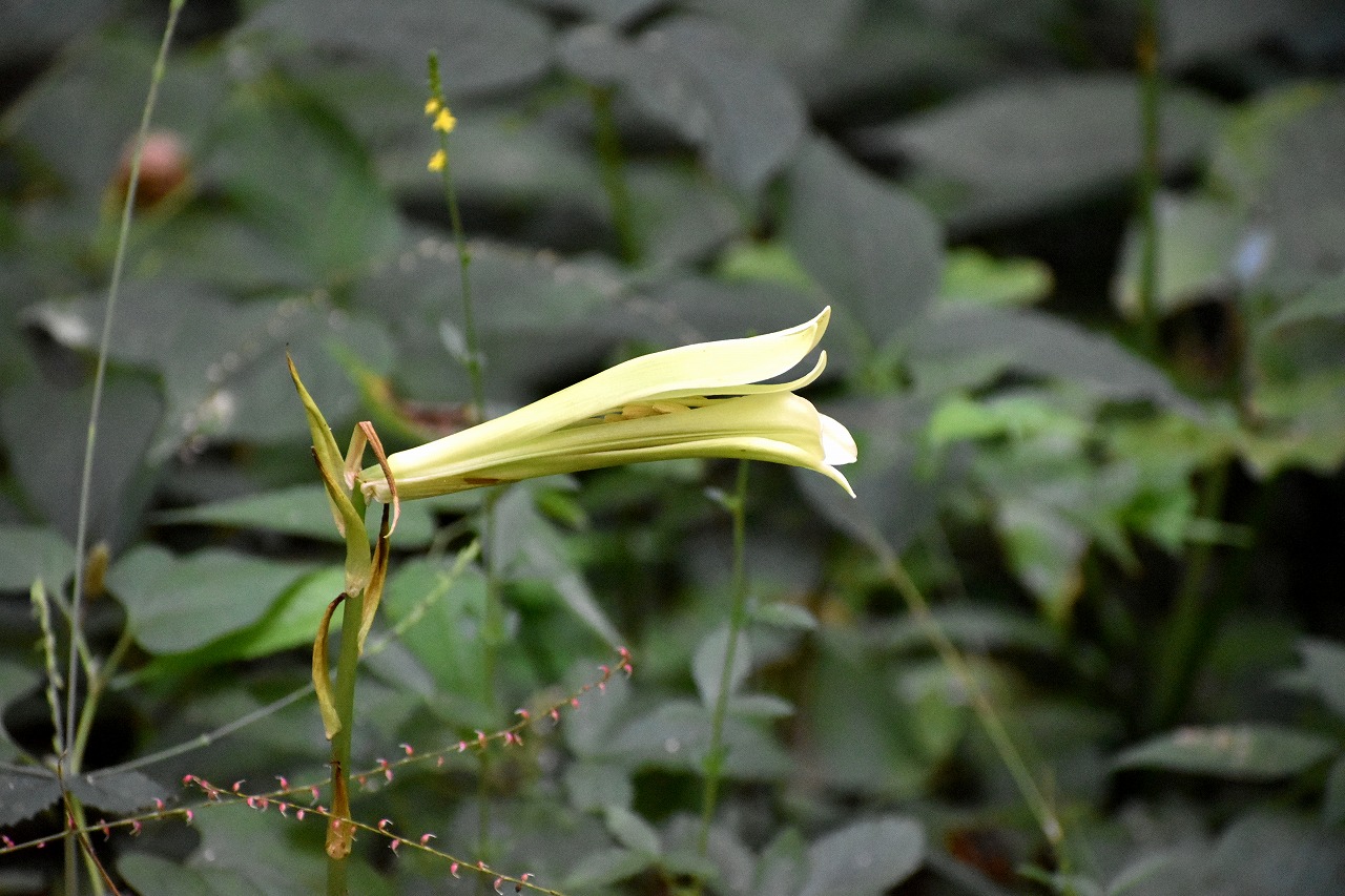 「一言」自然教育園にはウバユリがたくさん咲いています。黄色いキンミズヒキの花やオレンジ色のキツネノカミソリという花も咲いています。