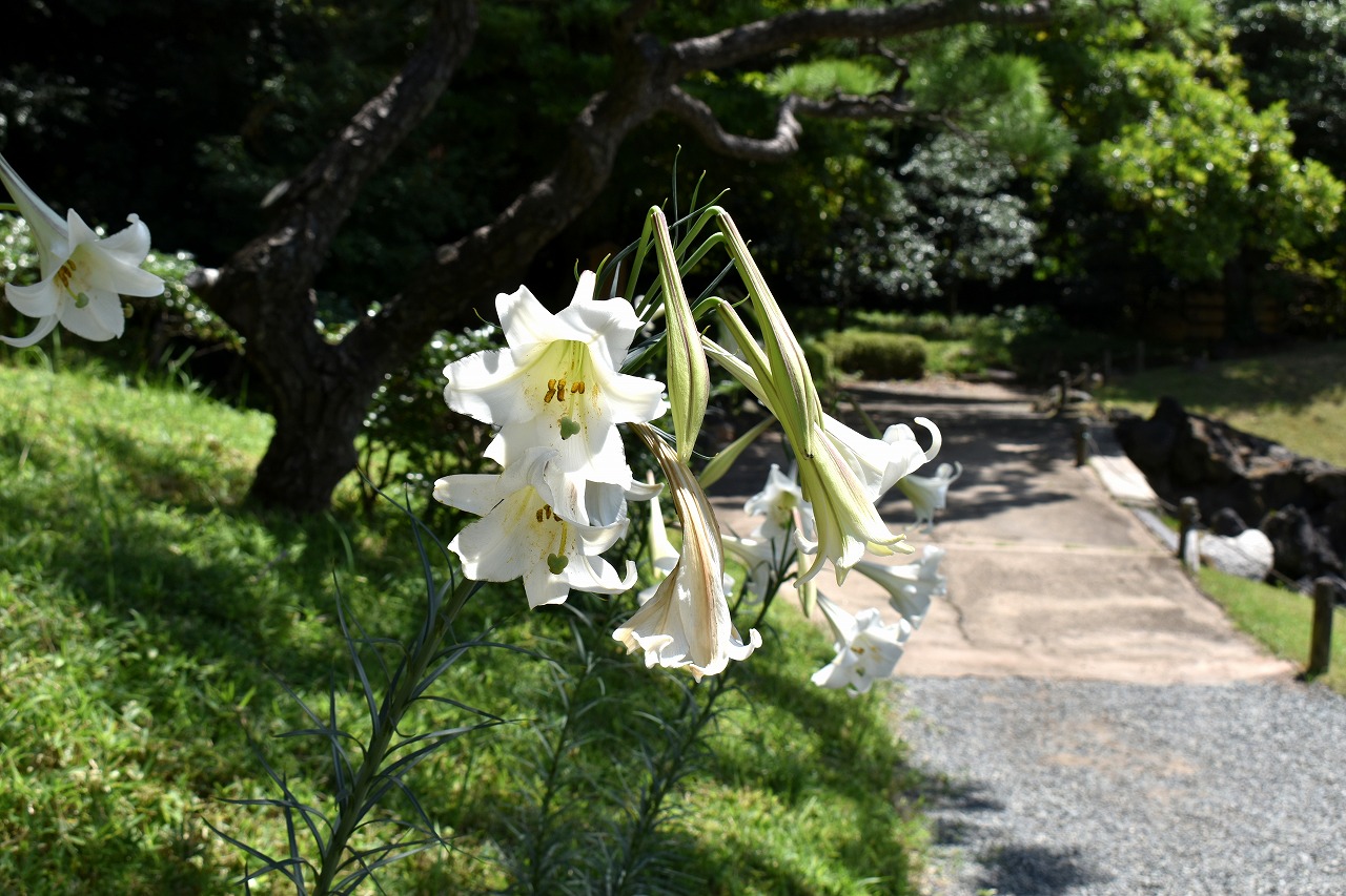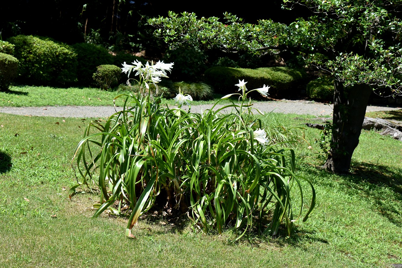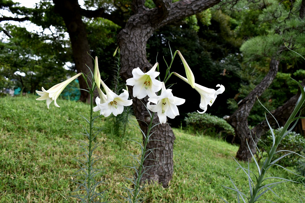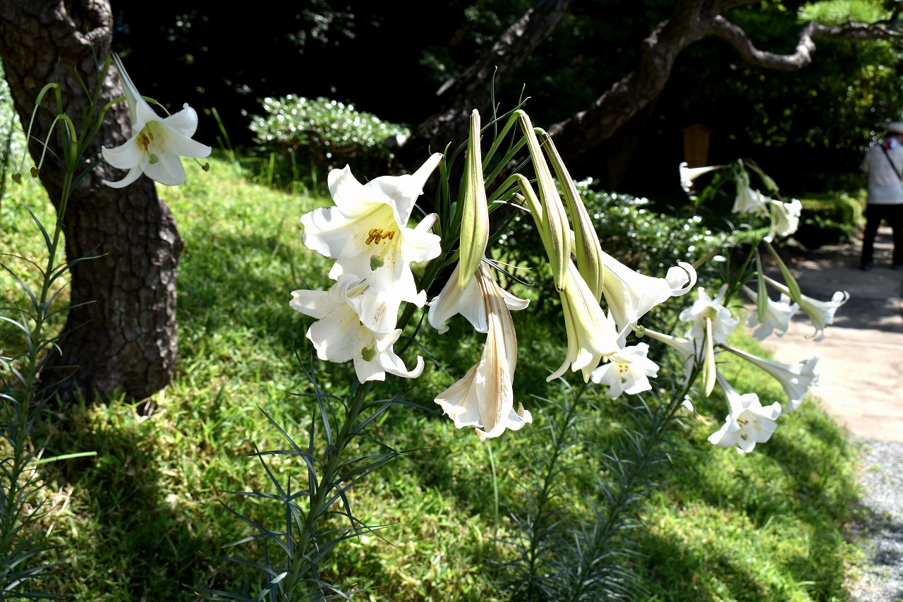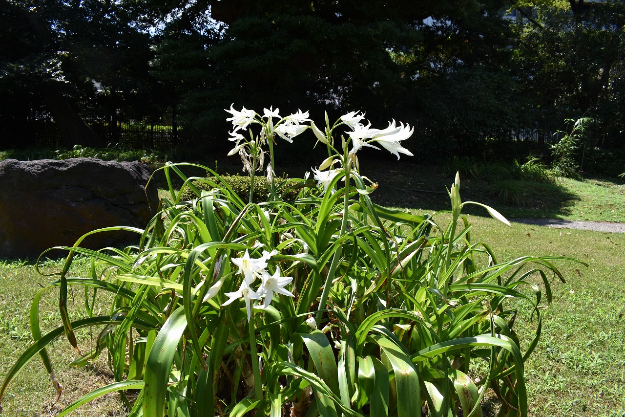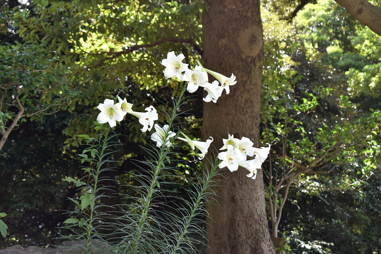 「一言」非常に暑い夏が来ました。芝公園にはヒマワリがたくさん咲いています。旧芝離宮にはタカサゴユリが咲き出しました。 暑い時期ですが、7月31日には桔梗の花が増えていました。時期外れに咲いた藤の花が房を伸ばしていました。しかし、 8月4日には藤の花は散っていました。インドハマユウが再び咲いています。タカサゴユリの白い花は増えて爽やかです。 サルスベリも咲き出したところです。キツネノカミソリの花があちこちに咲いています。