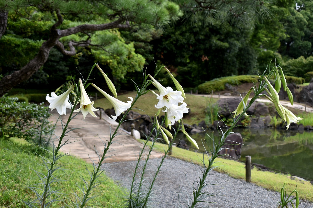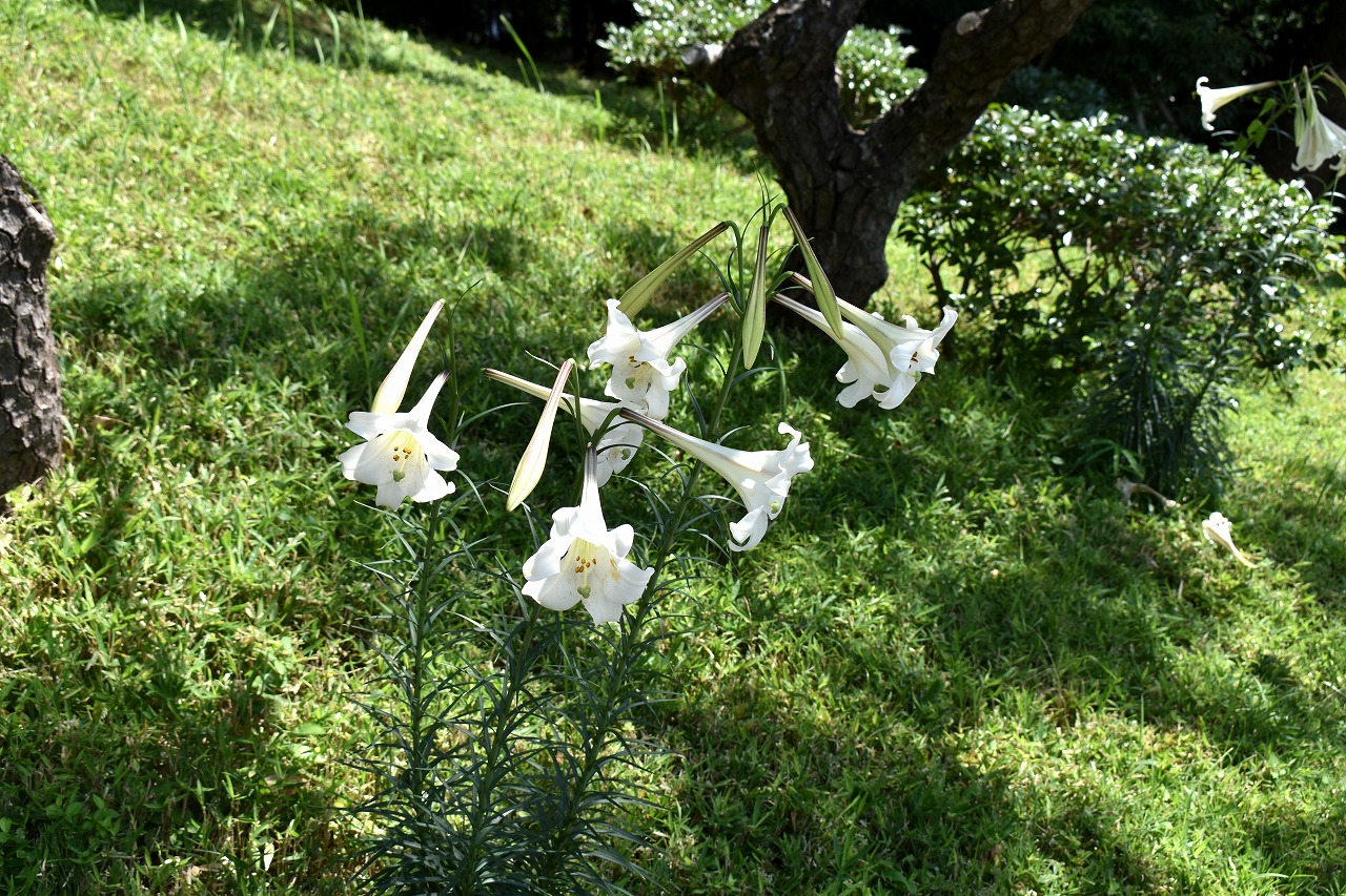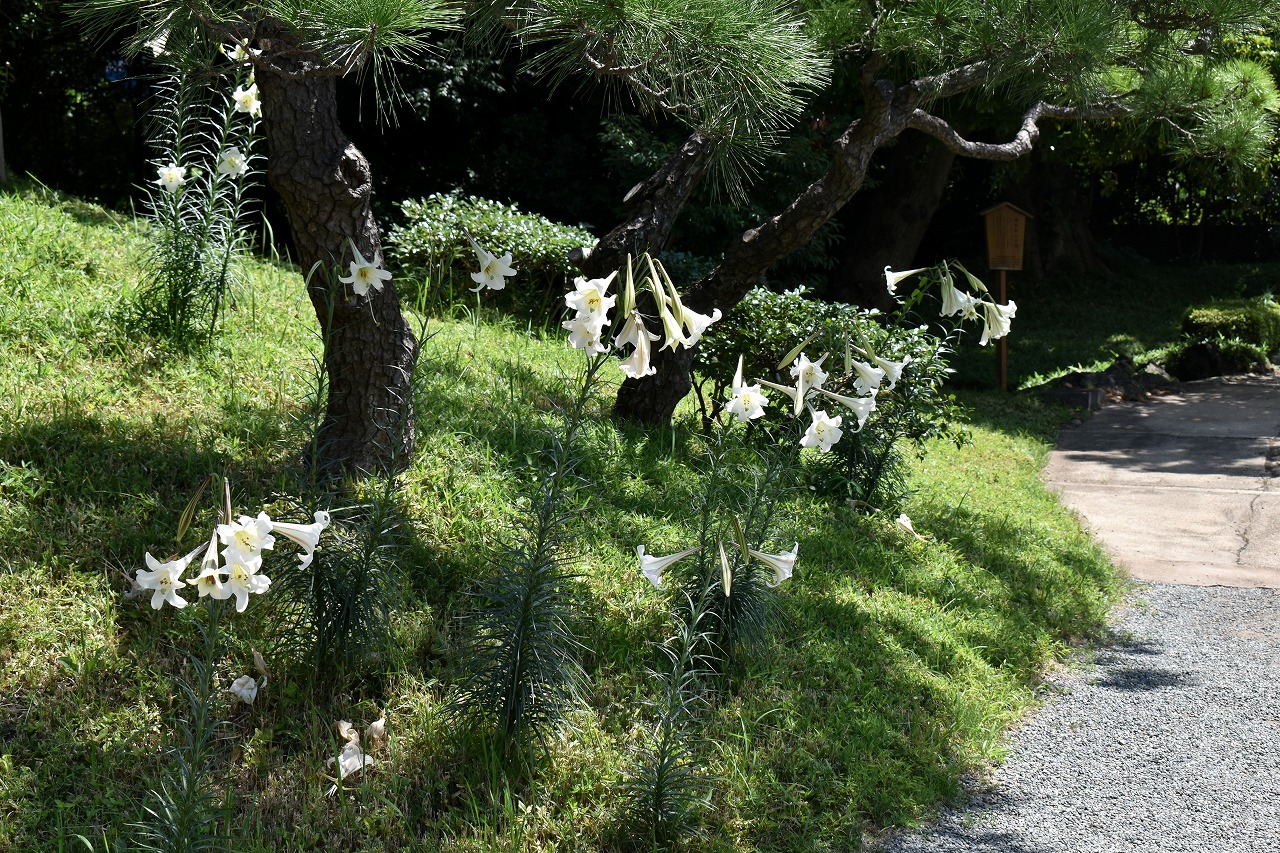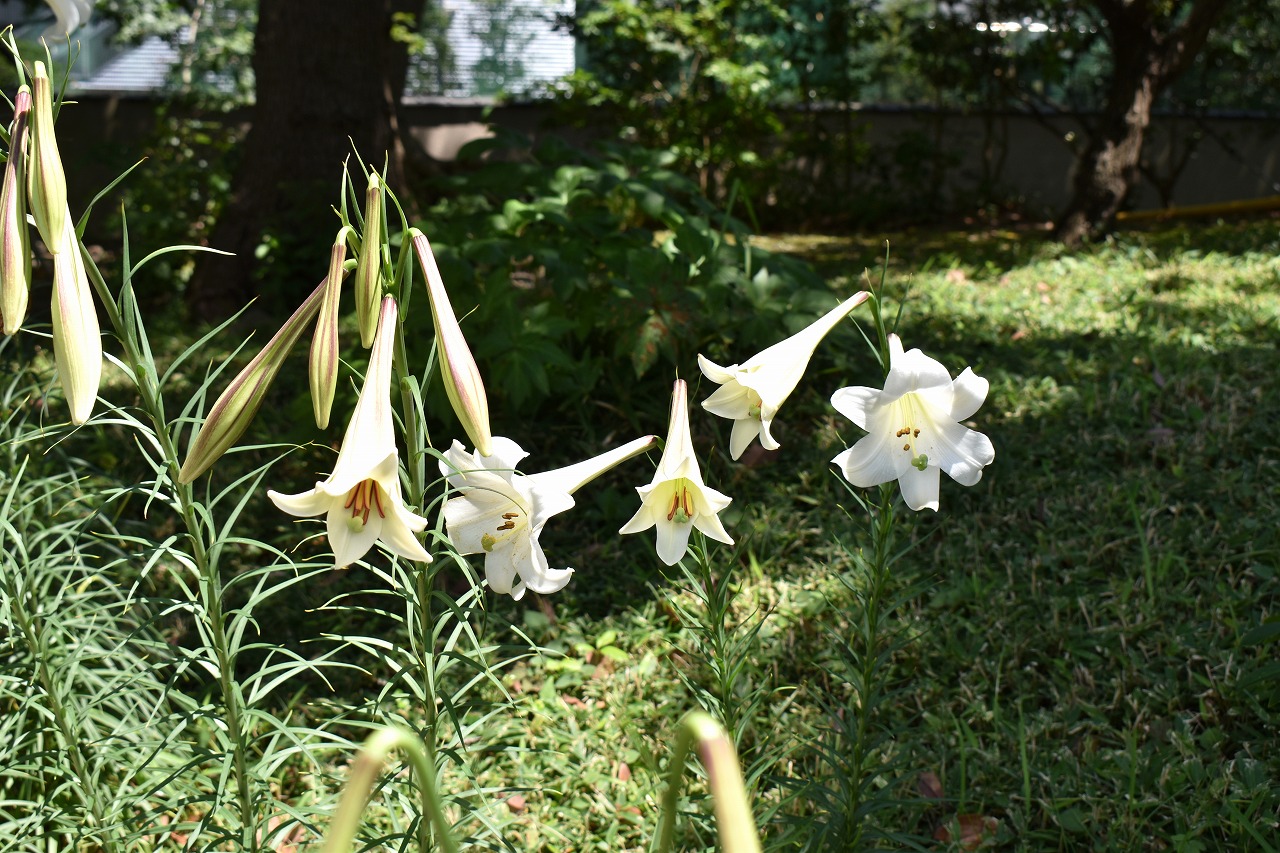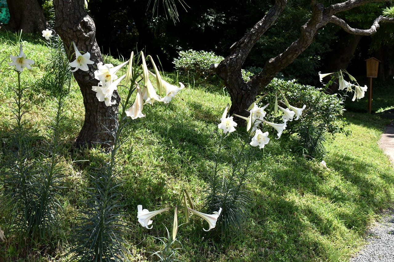 「一言」非常に暑い夏が来ました。芝公園にはヒマワリがたくさん咲いています。旧芝離宮にはタカサゴユリが咲き出しました。 暑い時期ですが、7月31日には桔梗の花が増えていました。時期外れに咲いた藤の花が房を伸ばしていました。しかし、 8月4日には藤の花は散っていました。インドハマユウが再び咲いています。タカサゴユリの白い花は増えて爽やかです。 サルスベリも咲き出したところです。キツネノカミソリの花があちこちに咲いています。