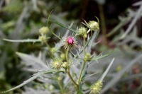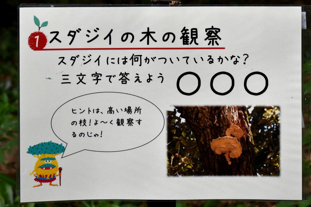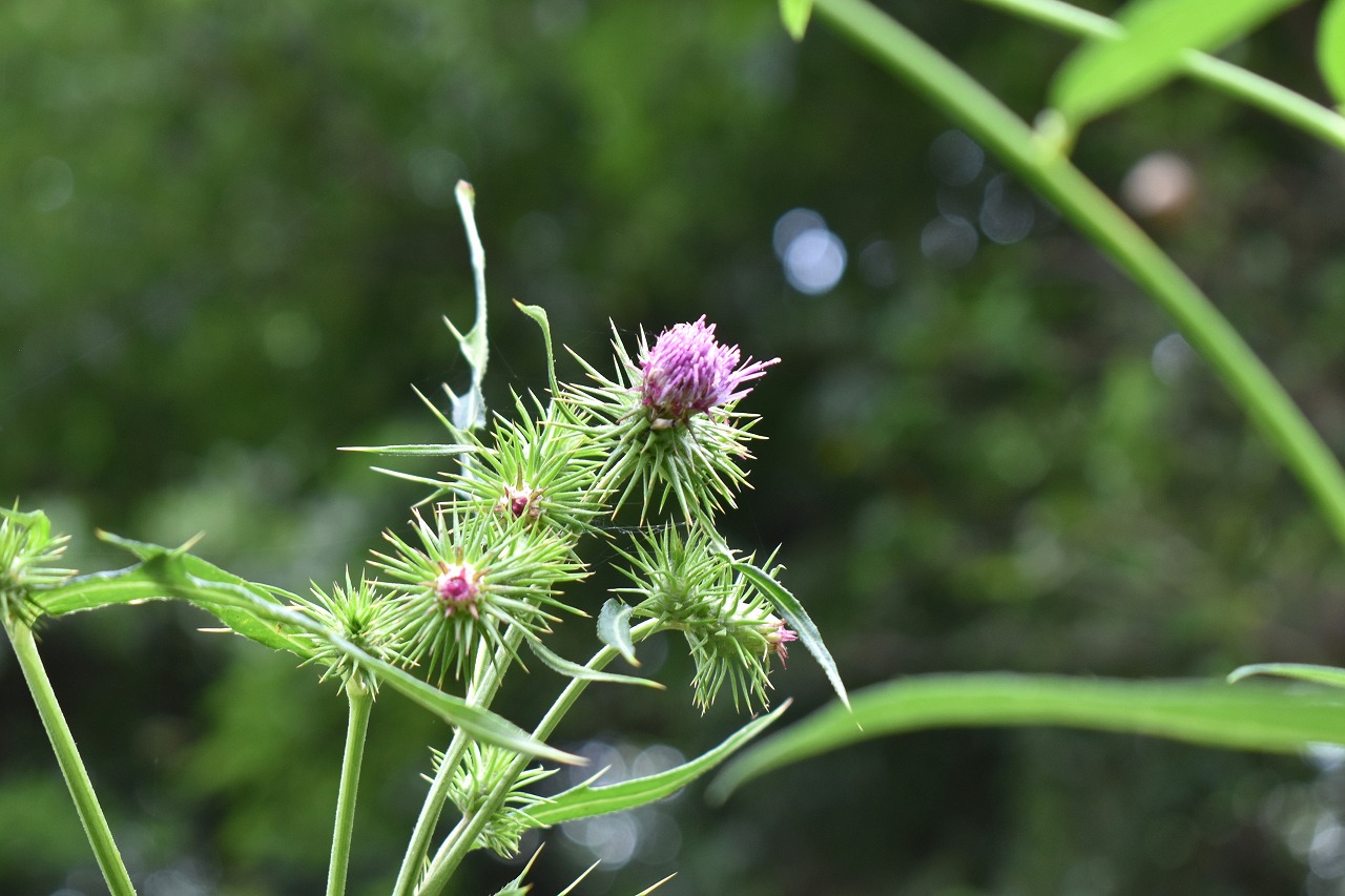白い実がたくさん実っていました。アザミの花が咲き出していました。木にはカナブンが集まっていました。