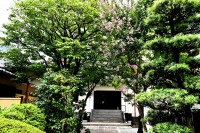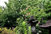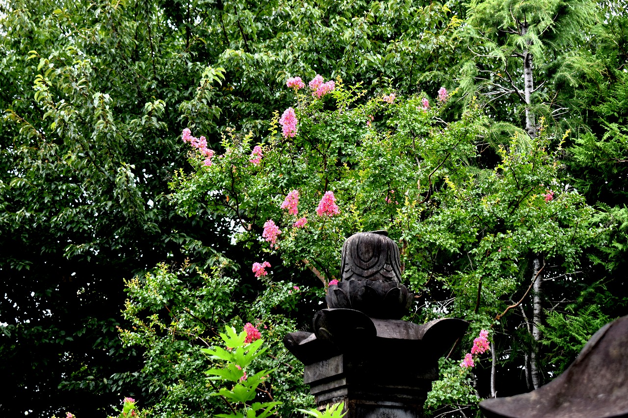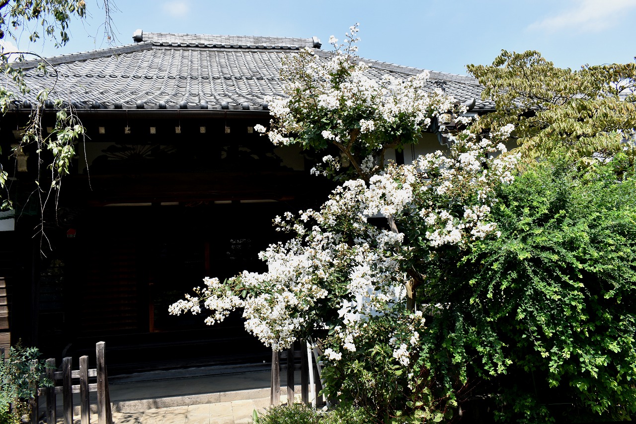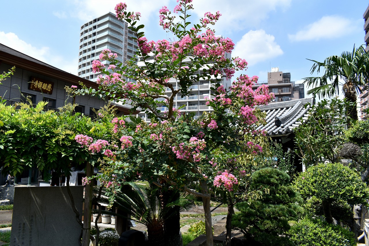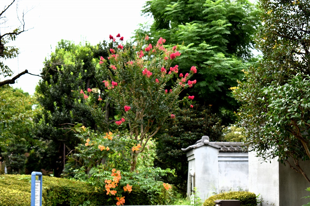 幽霊坂の途中ある忍願寺の裏門に咲く大きな百日紅の花は見事です。龍源寺にはホテイアオイの花が咲いています。