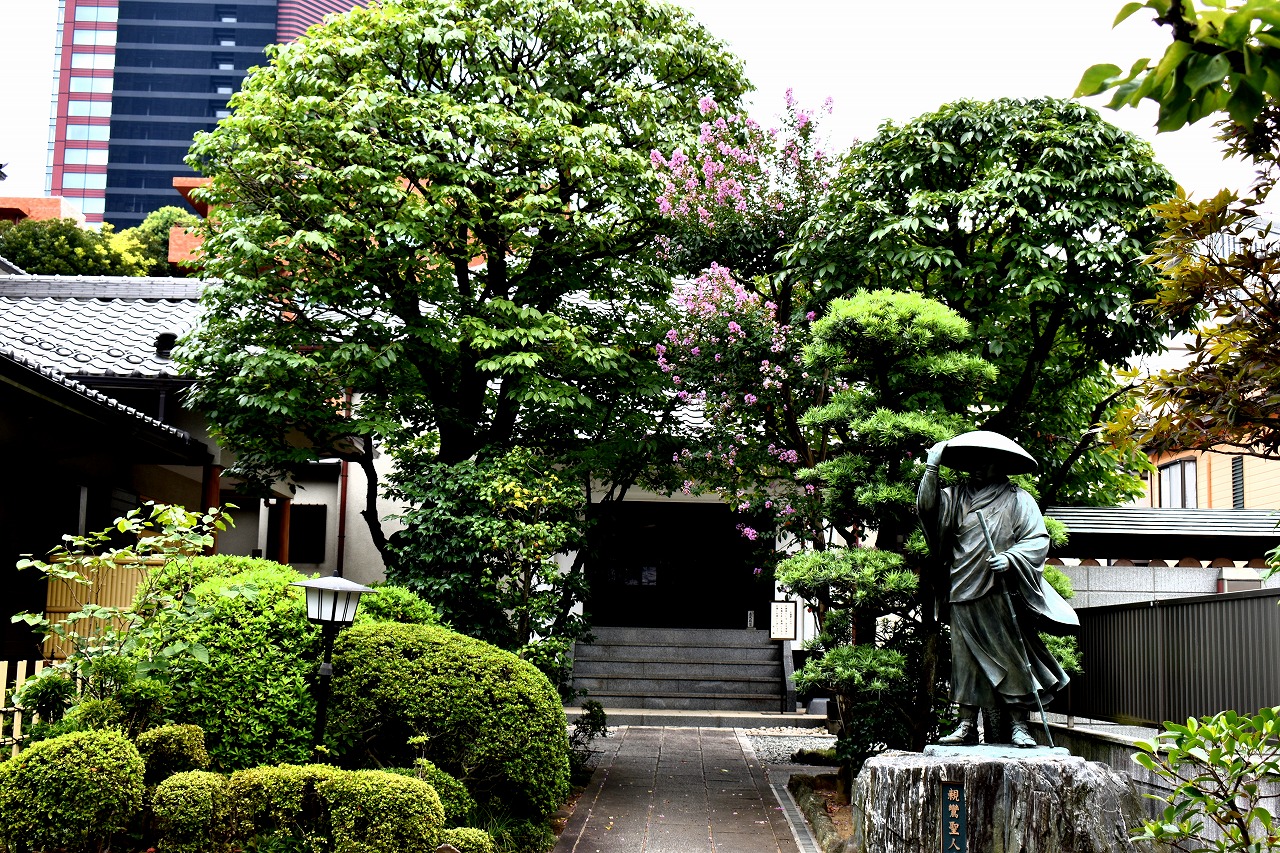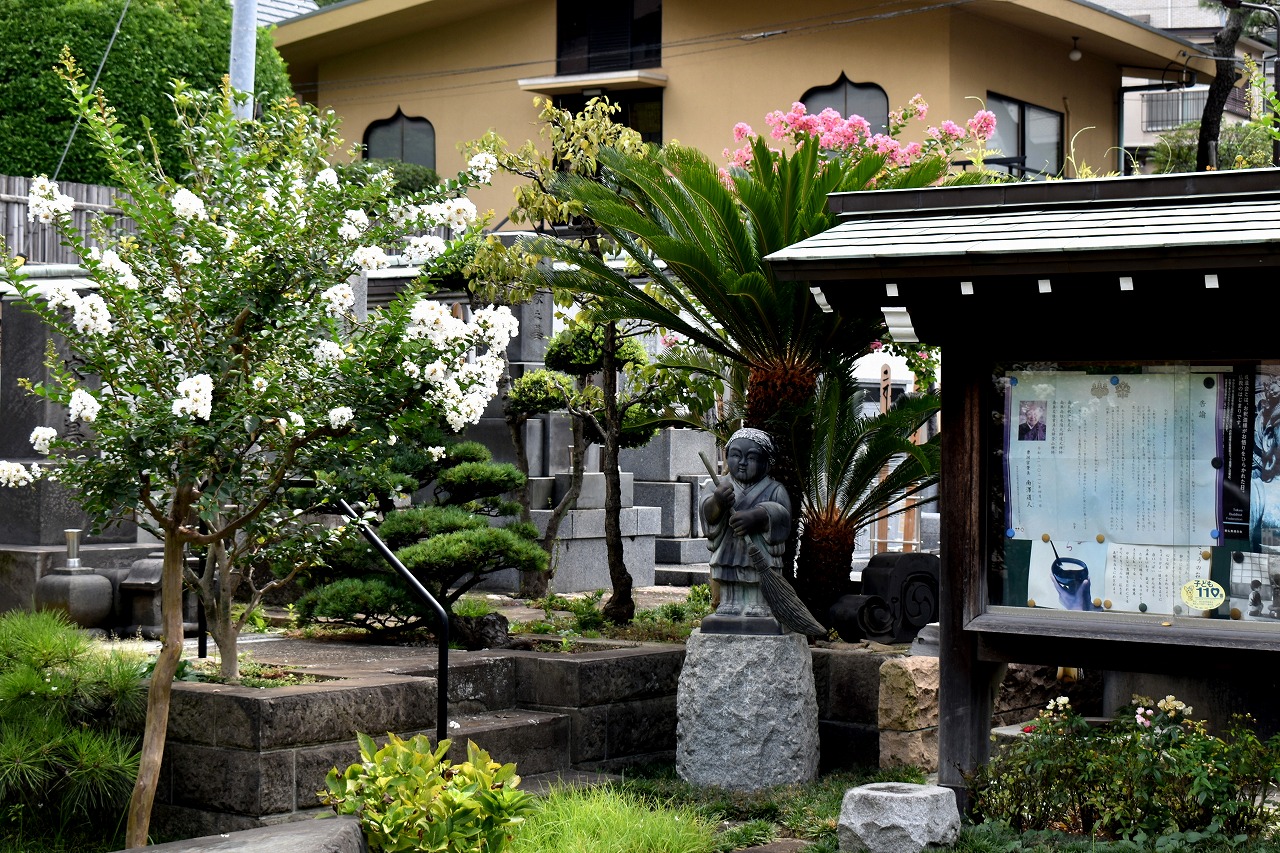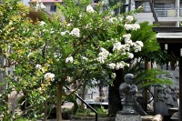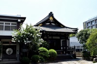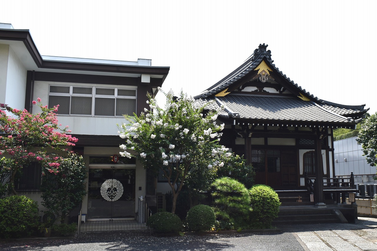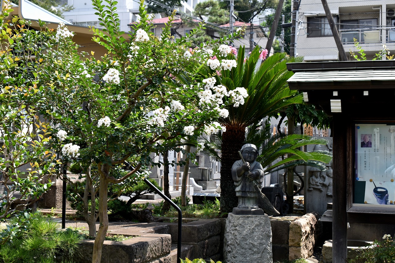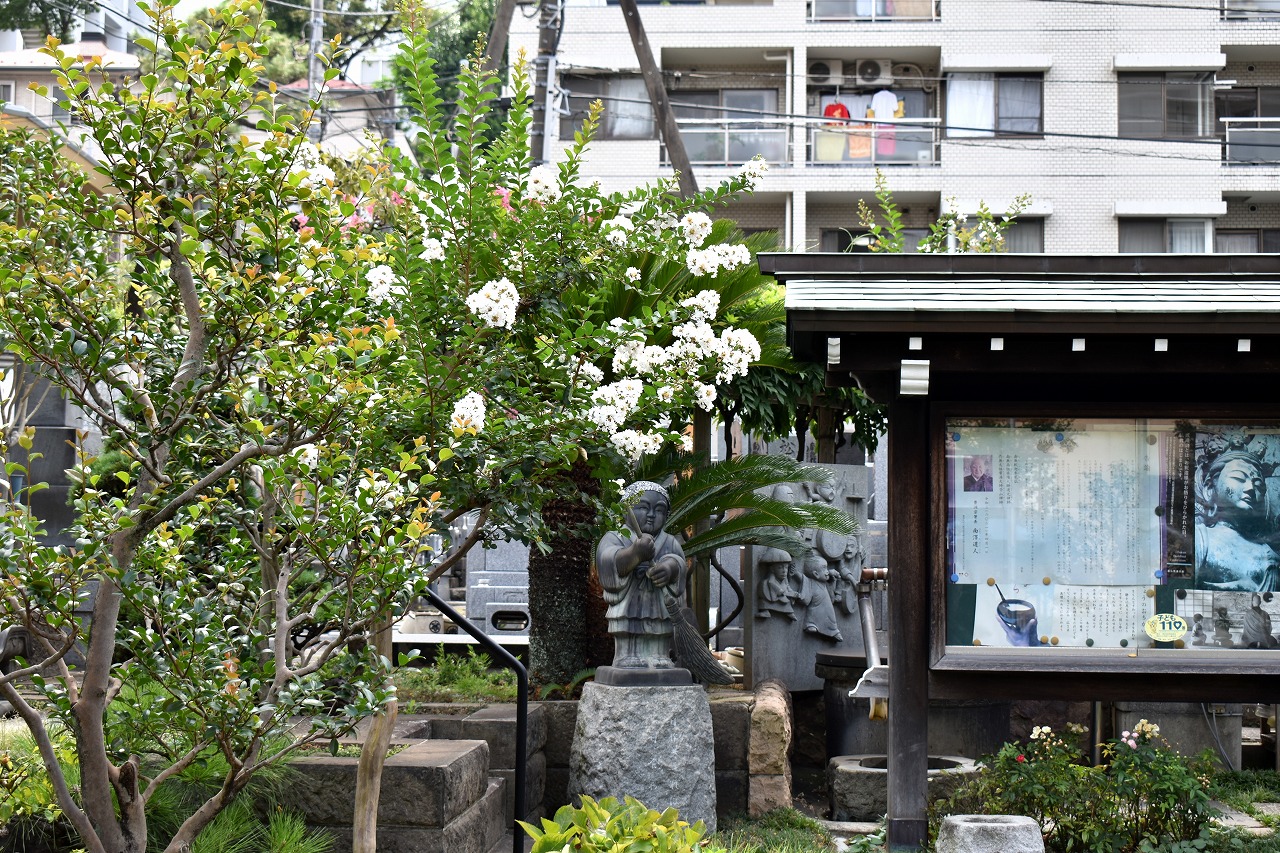 幽霊坂の途中ある忍願寺の裏門に咲く大きな百日紅の花は見事です。龍源寺にはホテイアオイの花が咲いています。