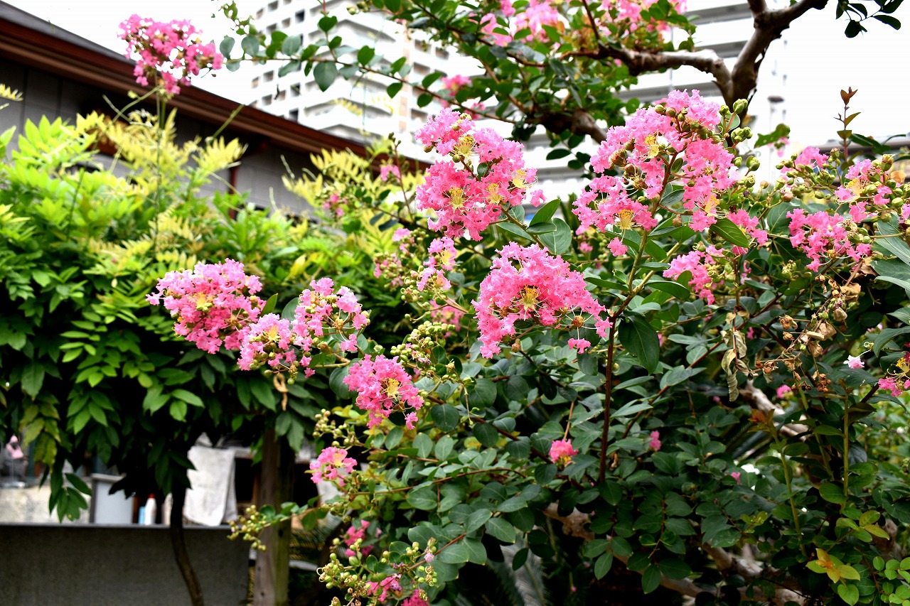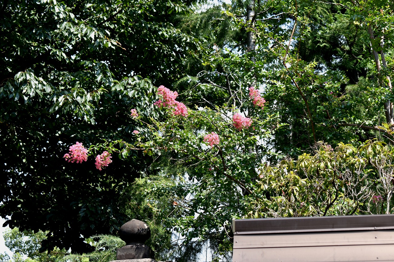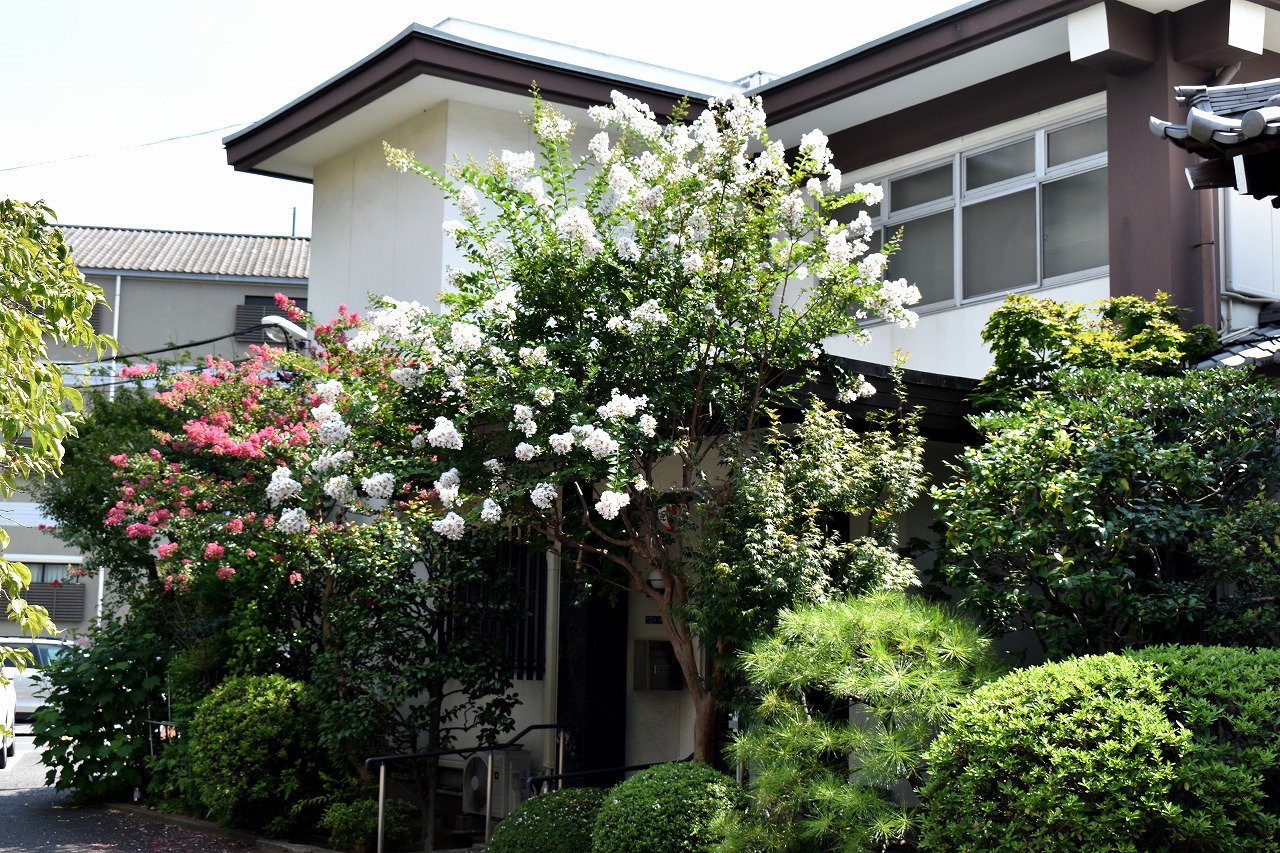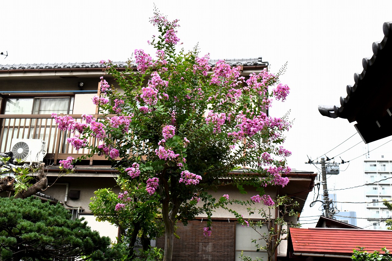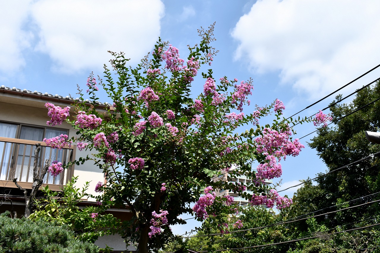 「一言」三田寺町の多くのお寺に百日紅の木が植えており、たくさん花を咲かせています。仮御所の前のプリンセスミチコの