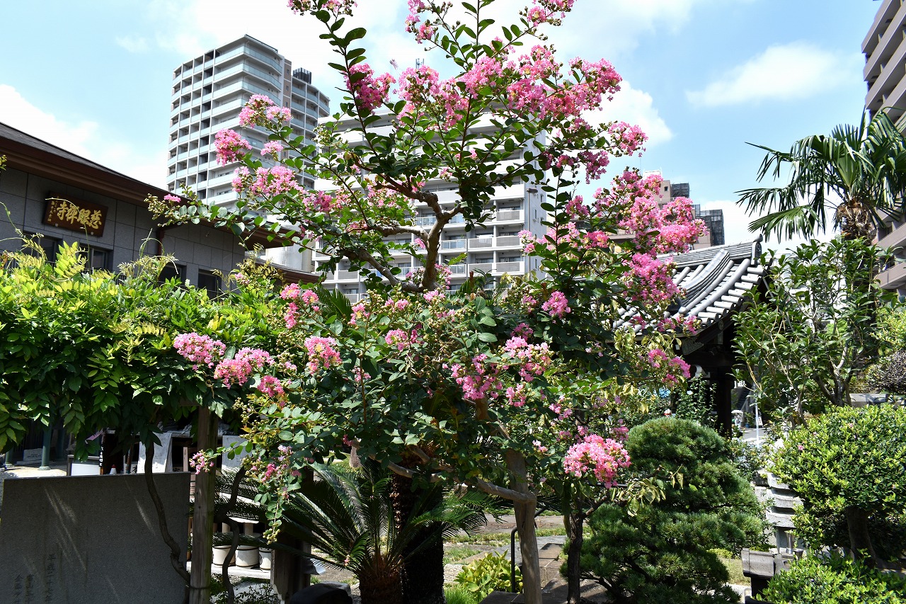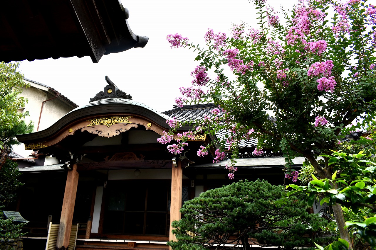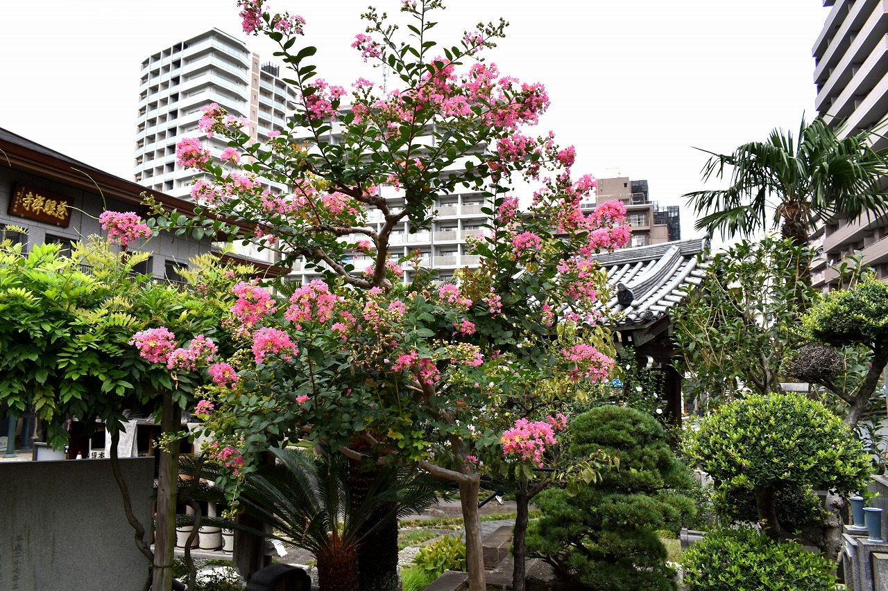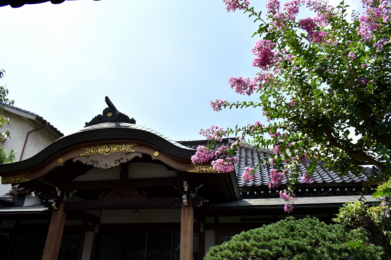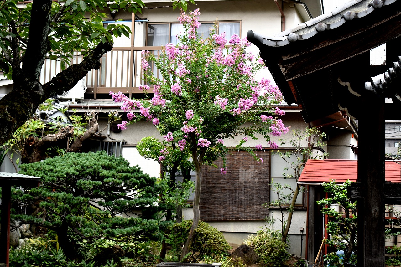 「一言」三田寺町の多くのお寺に百日紅の木が植えており、たくさん花を咲かせています。仮御所の前のプリンセスミチコの