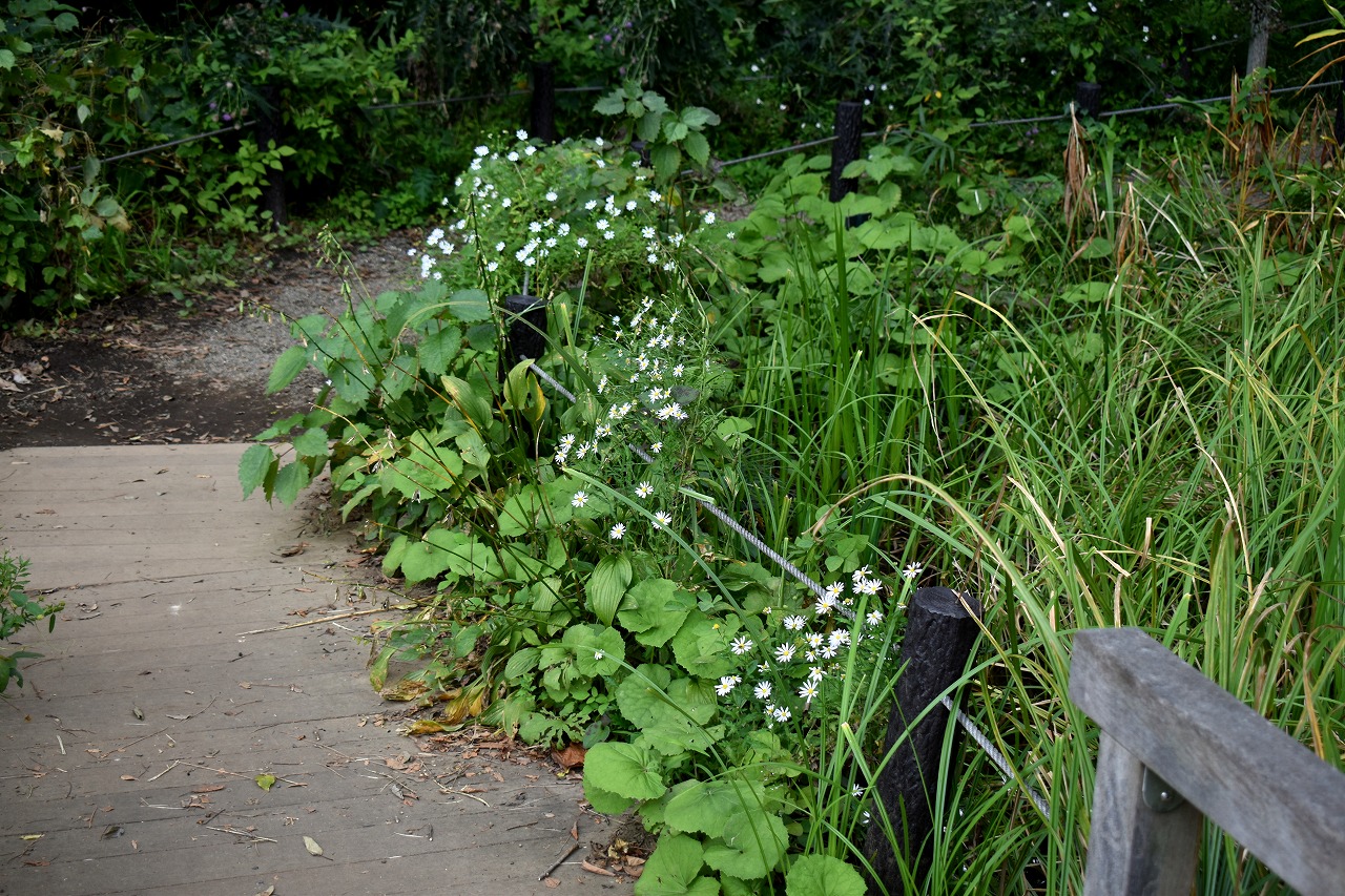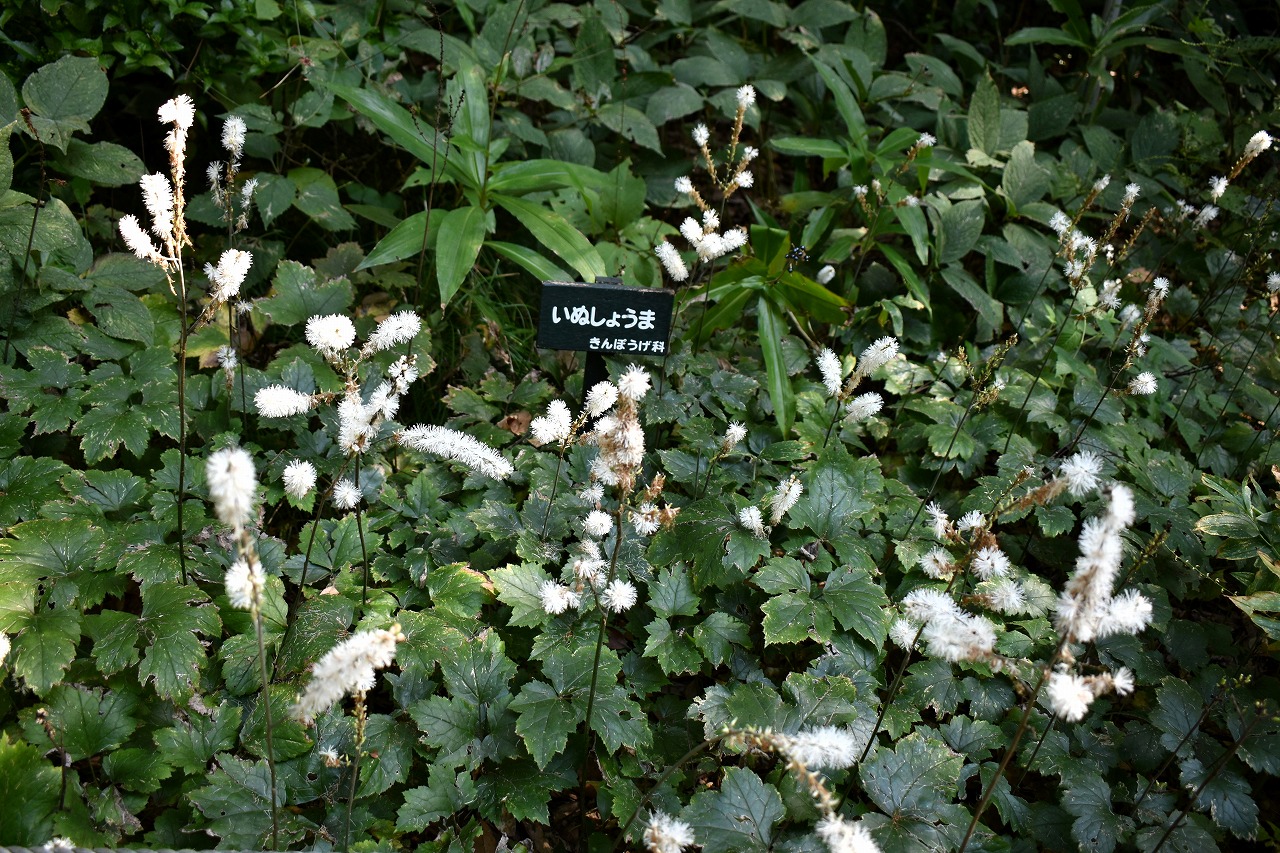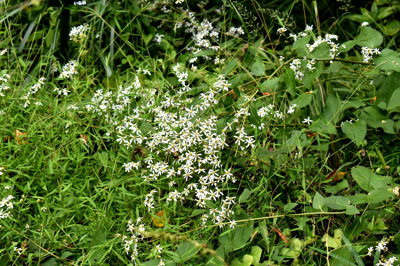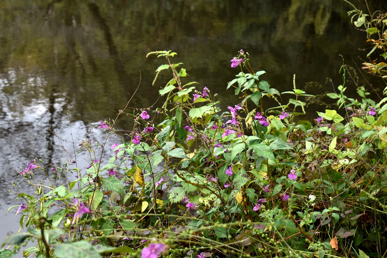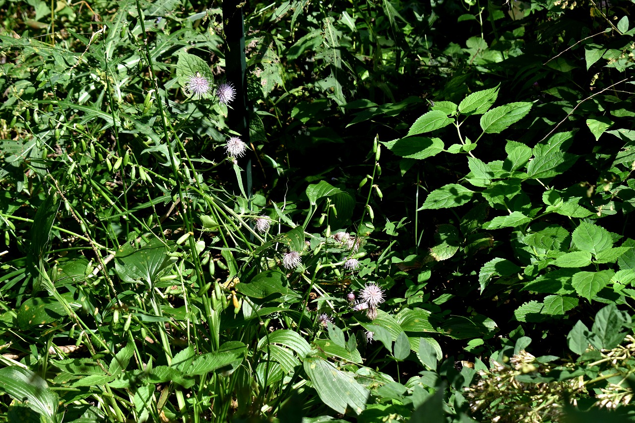 「一言」自然教育園には秋の花が色々と咲き、散策していると楽しめます。イヌショウマの花があちこちで咲いています。 池のまわりにはツリフネソウがたくさん咲いています。ユウガギクやシラヤマギクなどもあちこちに咲いています。 茶ノ木の花やミソソバの花も咲いています。アザミの花もあちこちに咲いており、色々な蝶が飛んできています。