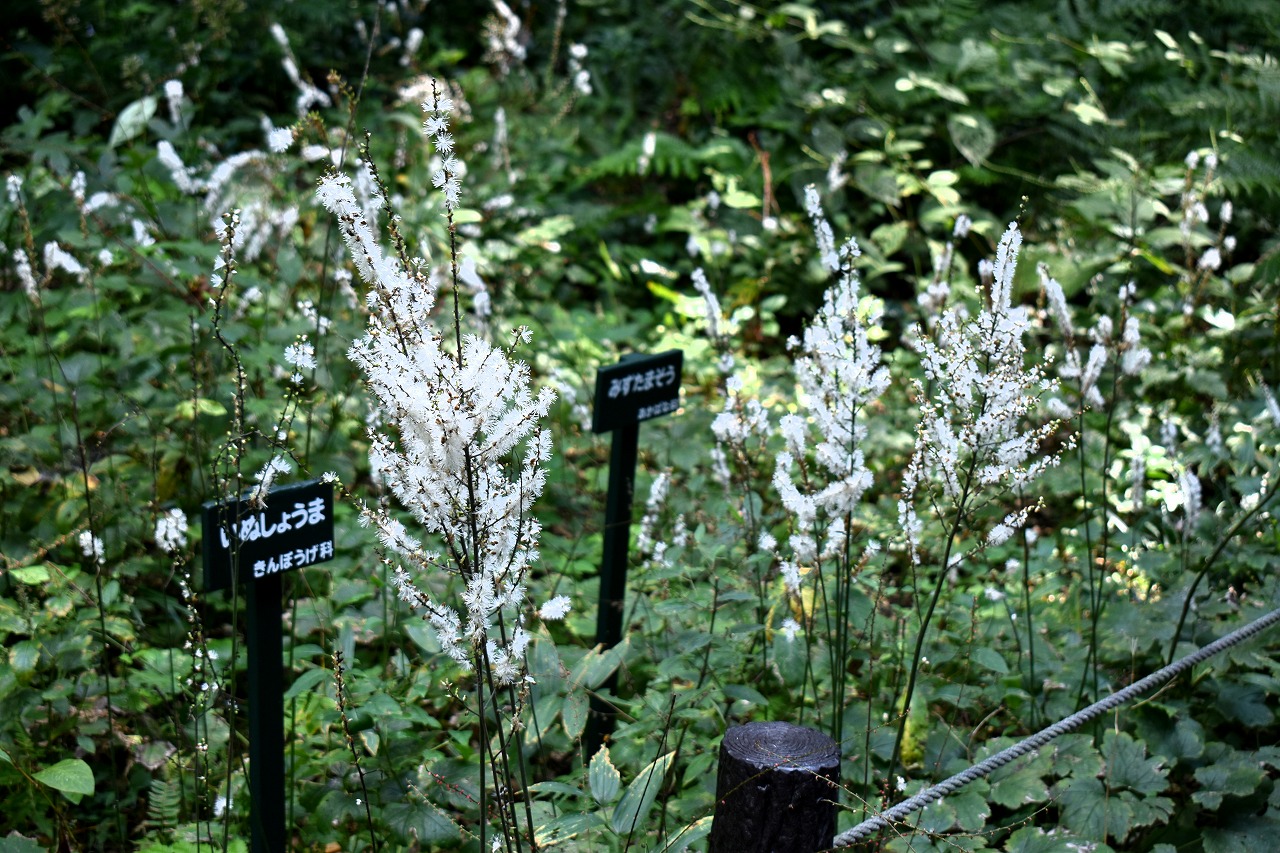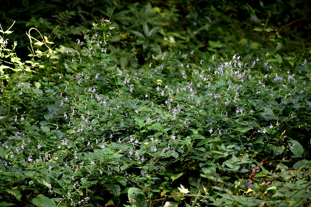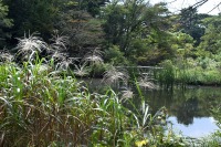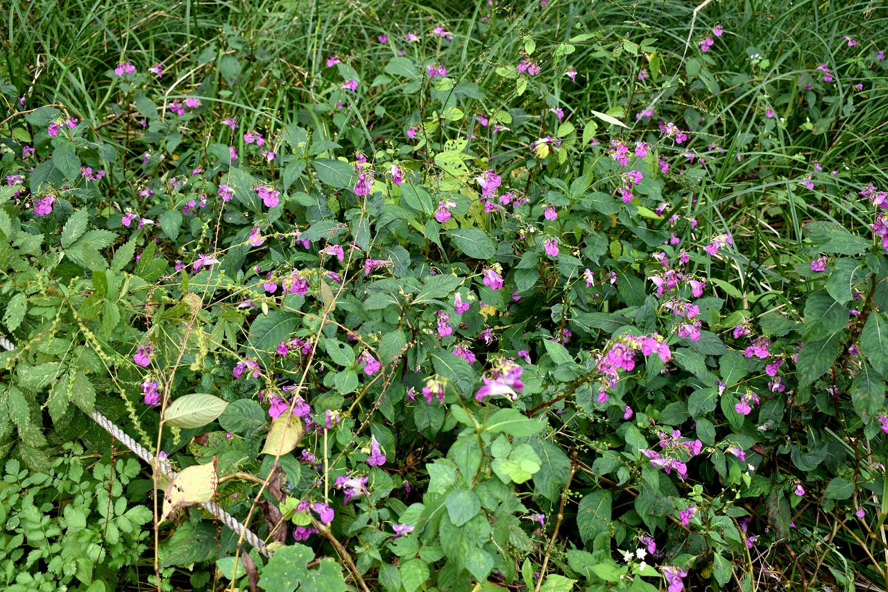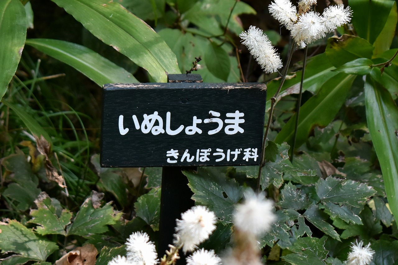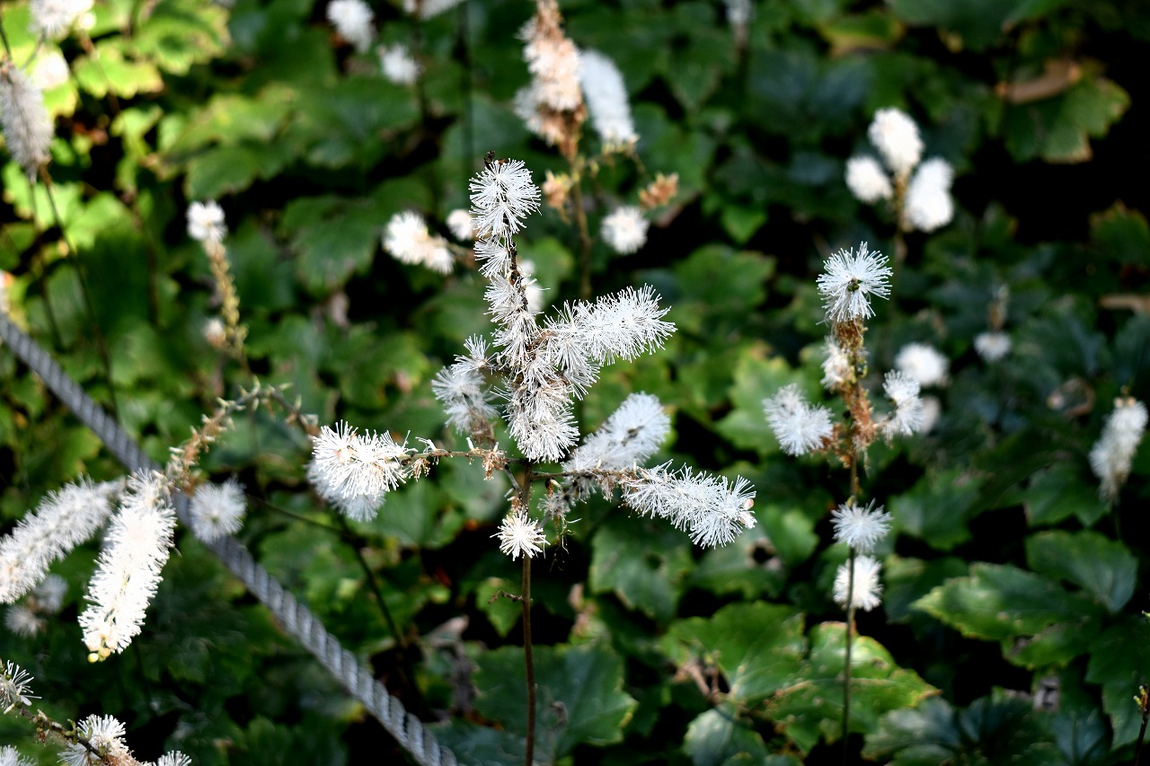 「一言」自然教育園には秋の花が色々と咲き、散策していると楽しめます。イヌショウマの花があちこちで咲いています。 池のまわりにはツリフネソウがたくさん咲いています。ユウガギクやシラヤマギクなどもあちこちに咲いています。 茶ノ木の花やミソソバの花も咲いています。アザミの花もあちこちに咲いており、色々な蝶が飛んできています。