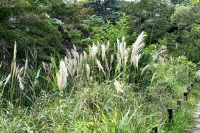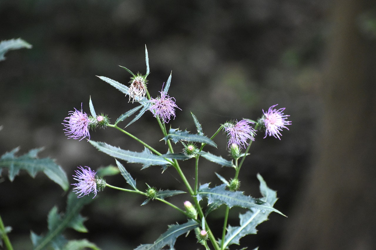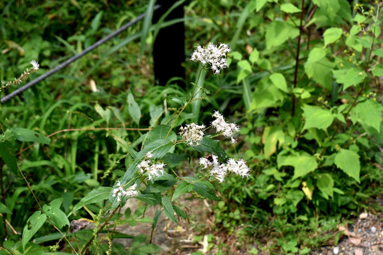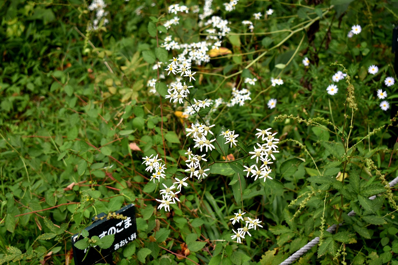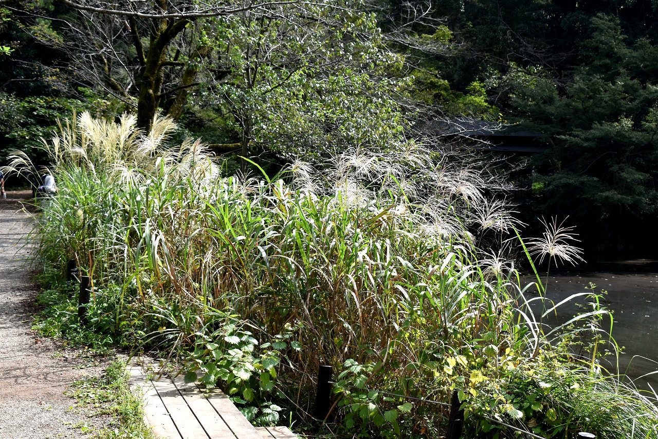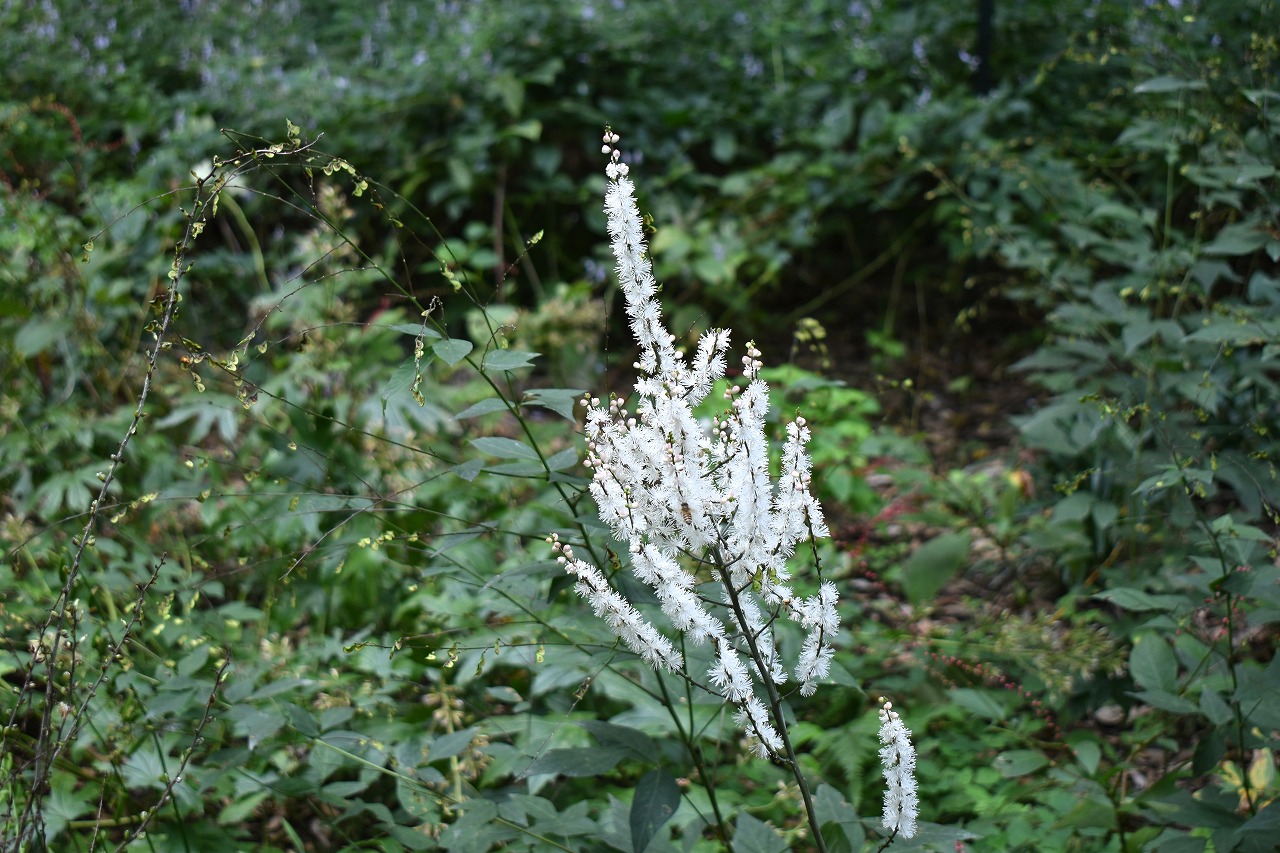 「一言」自然教育園には秋の花が色々と咲き、散策していると楽しめます。イヌショウマの花があちこちで咲いています。 池のまわりにはツリフネソウがたくさん咲いています。ユウガギクやシラヤマギクなどもあちこちに咲いています。 茶ノ木の花やミソソバの花も咲いています。アザミの花もあちこちに咲いており、色々な蝶が飛んできています。