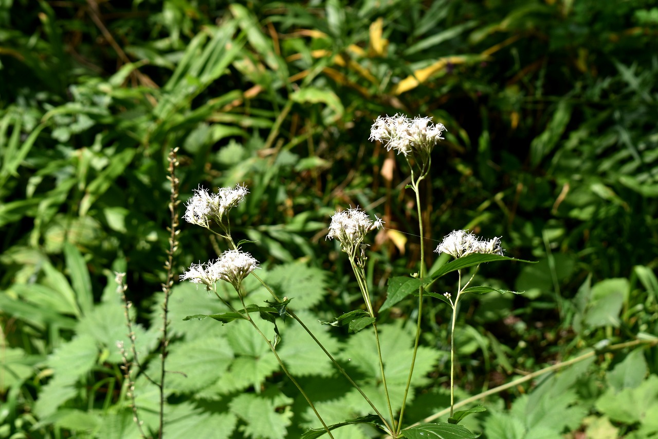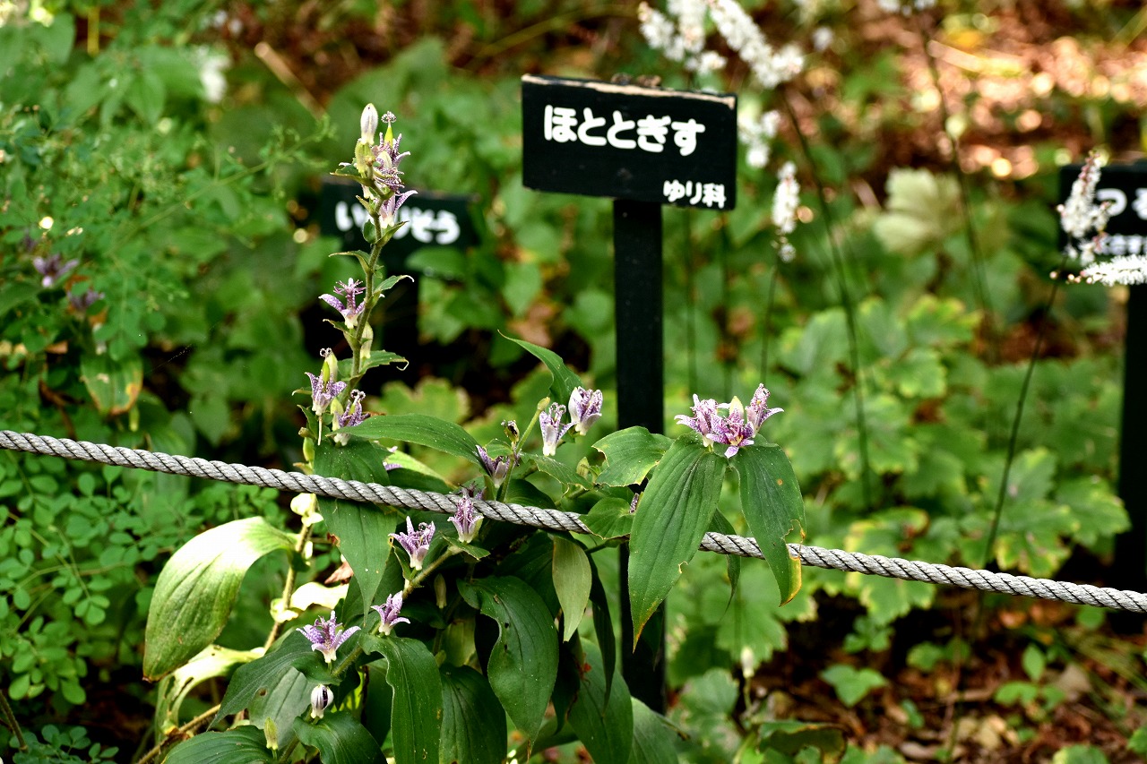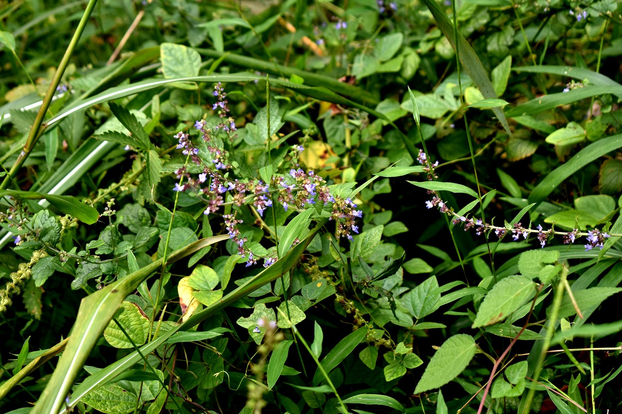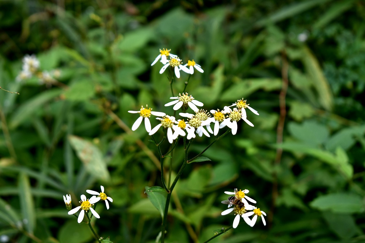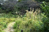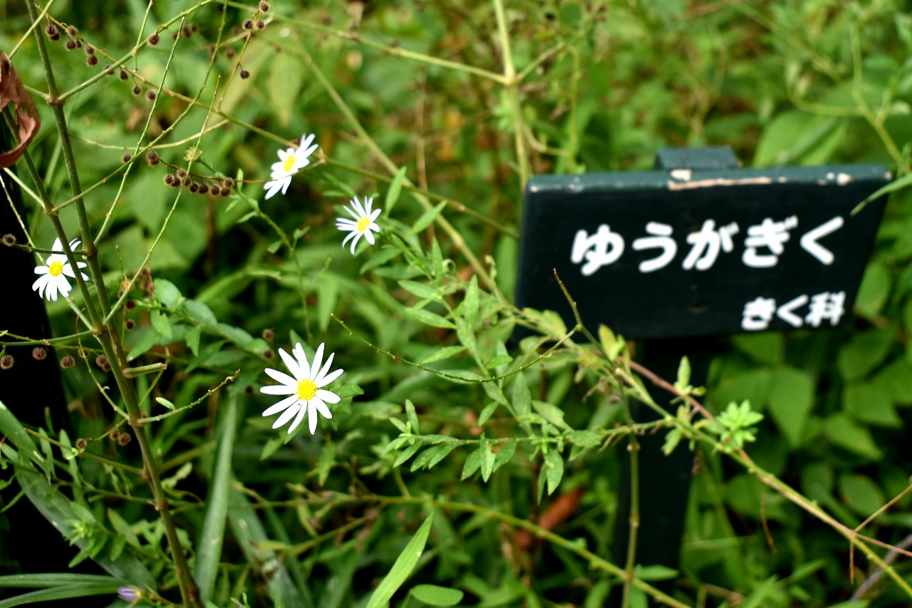 「一言」自然教育園には秋の花が色々と咲き、散策していると楽しめます。イヌショウマの花があちこちで咲いています。 池のまわりにはツリフネソウがたくさん咲いています。ユウガギクやシラヤマギクなどもあちこちに咲いています。 茶ノ木の花やミソソバの花も咲いています。アザミの花もあちこちに咲いており、色々な蝶が飛んできています。