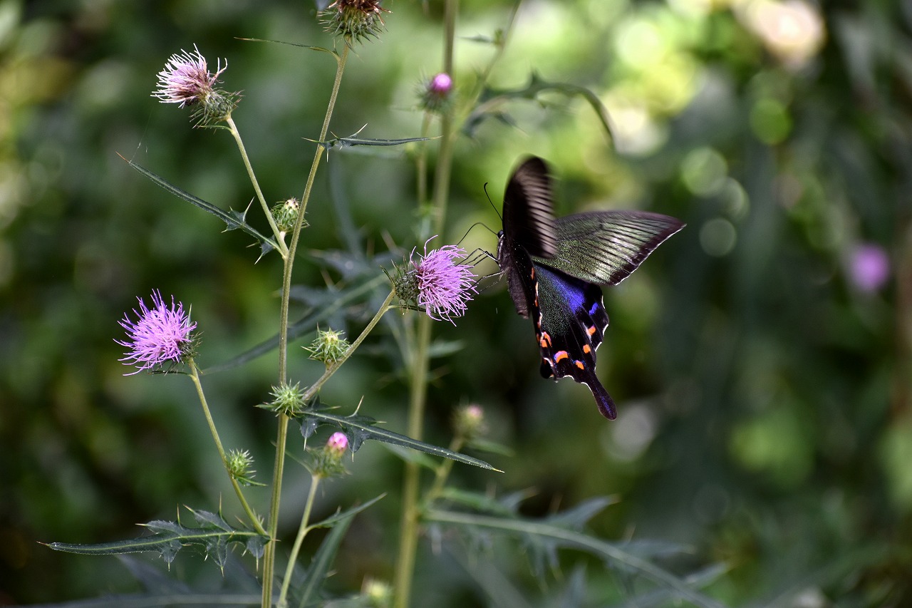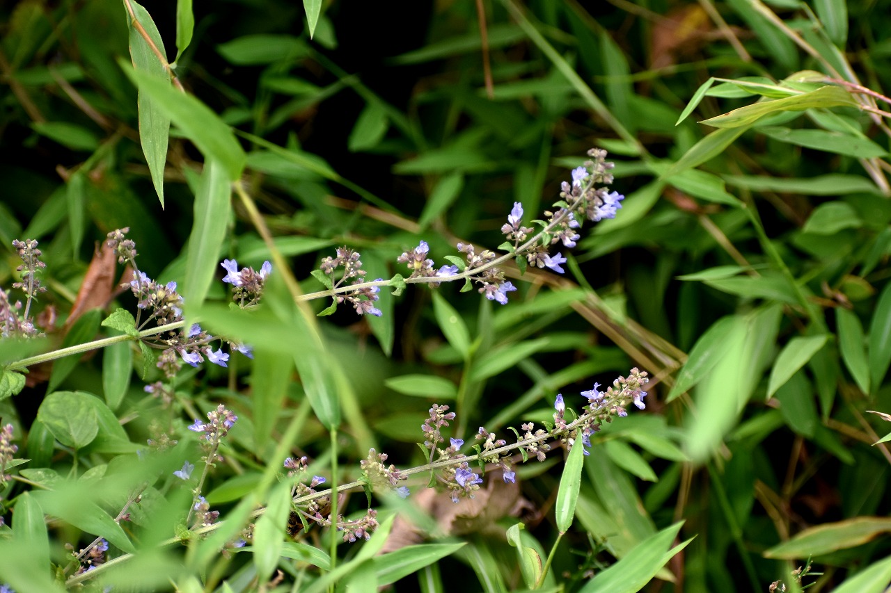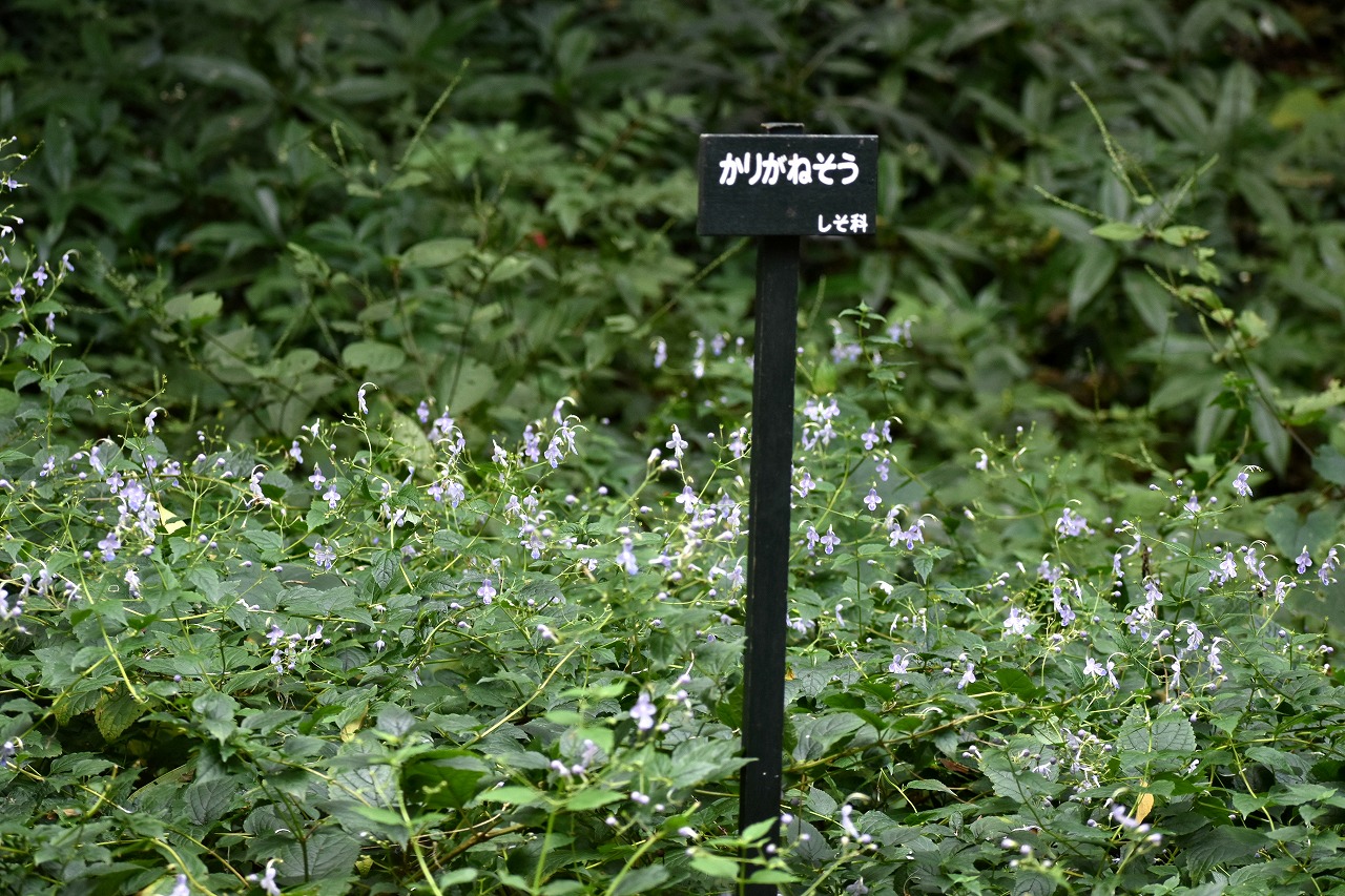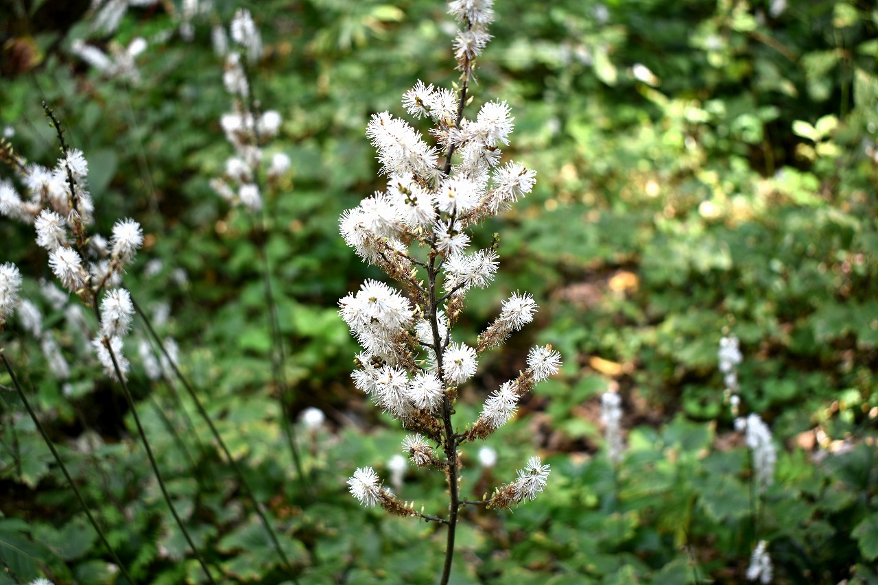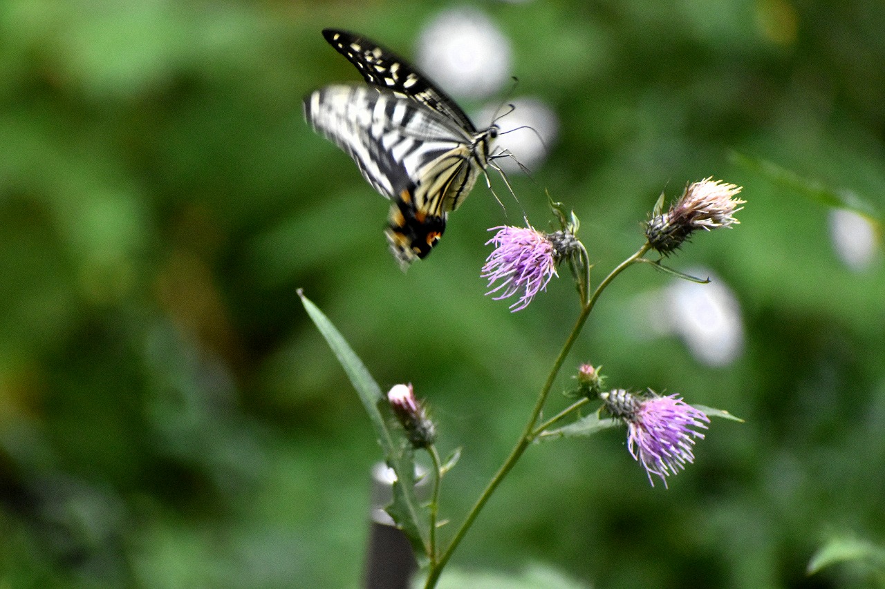 「一言」自然教育園には秋の花が色々と咲き、散策していると楽しめます。イヌショウマの花があちこちで咲いています。 池のまわりにはツリフネソウがたくさん咲いています。ユウガギクやシラヤマギクなどもあちこちに咲いています。 茶ノ木の花やミソソバの花も咲いています。アザミの花もあちこちに咲いており、色々な蝶が飛んできています。