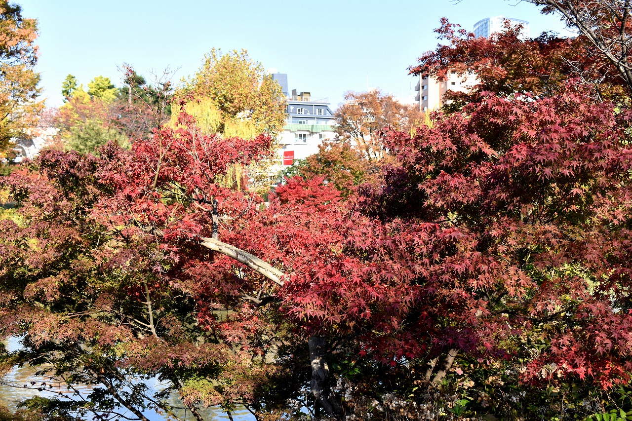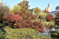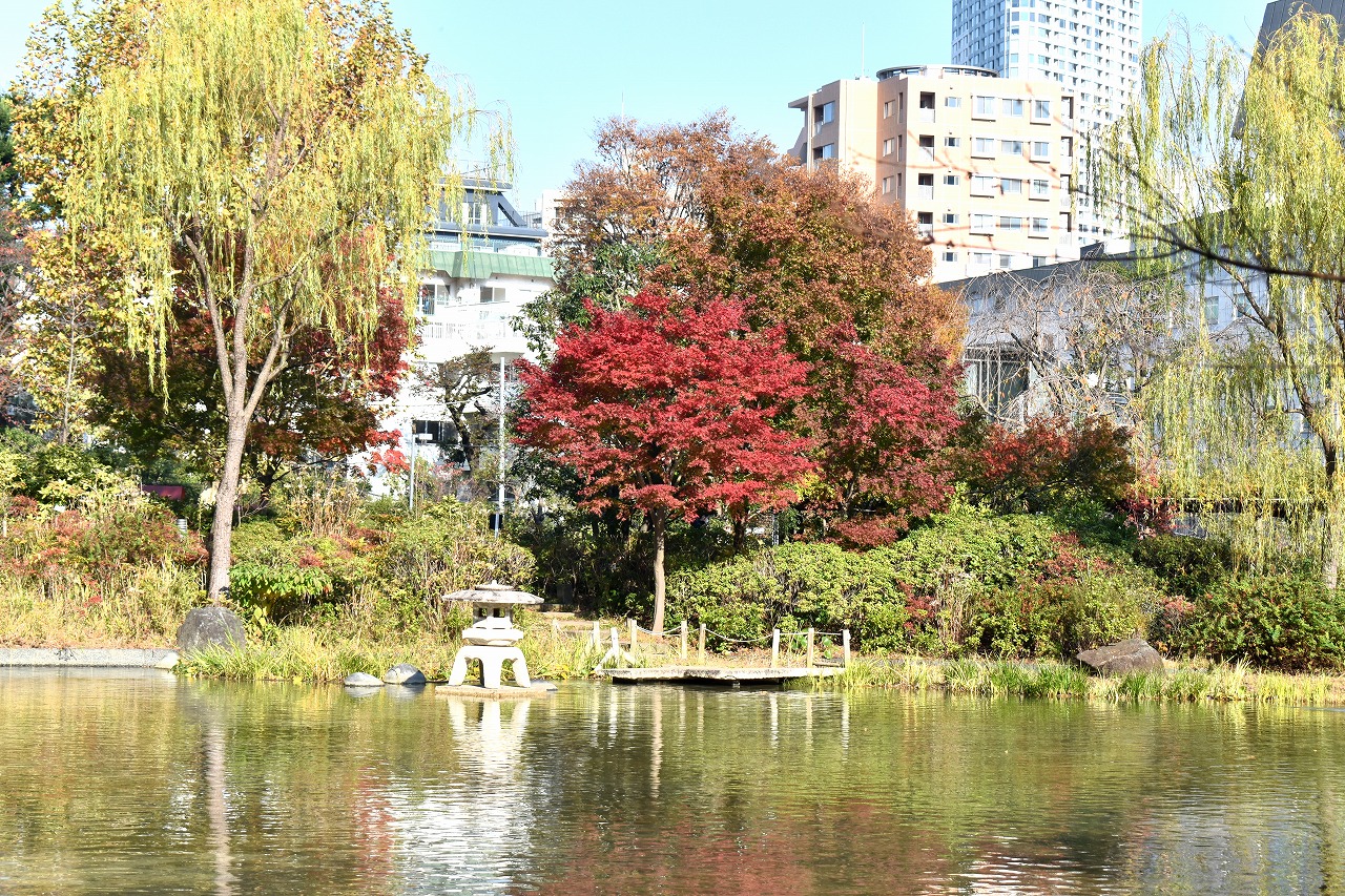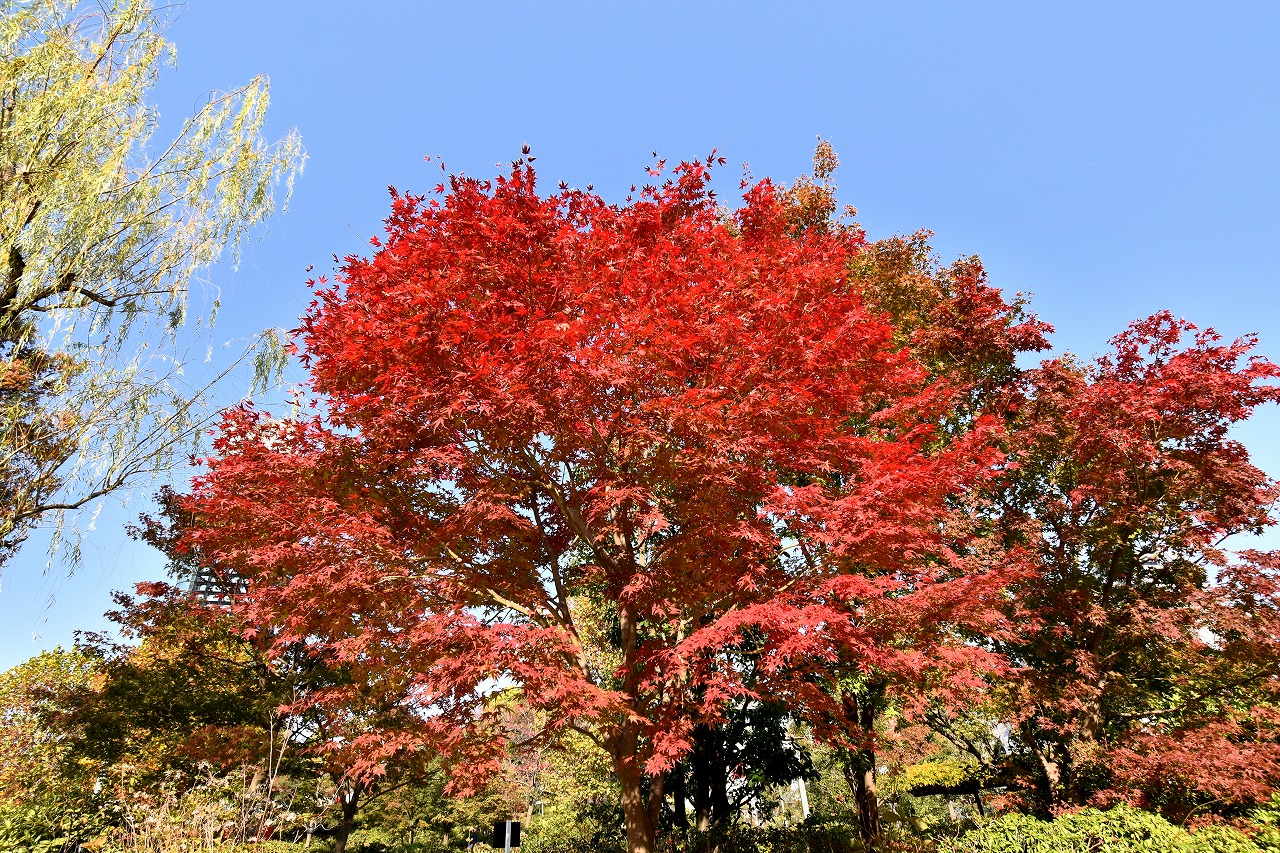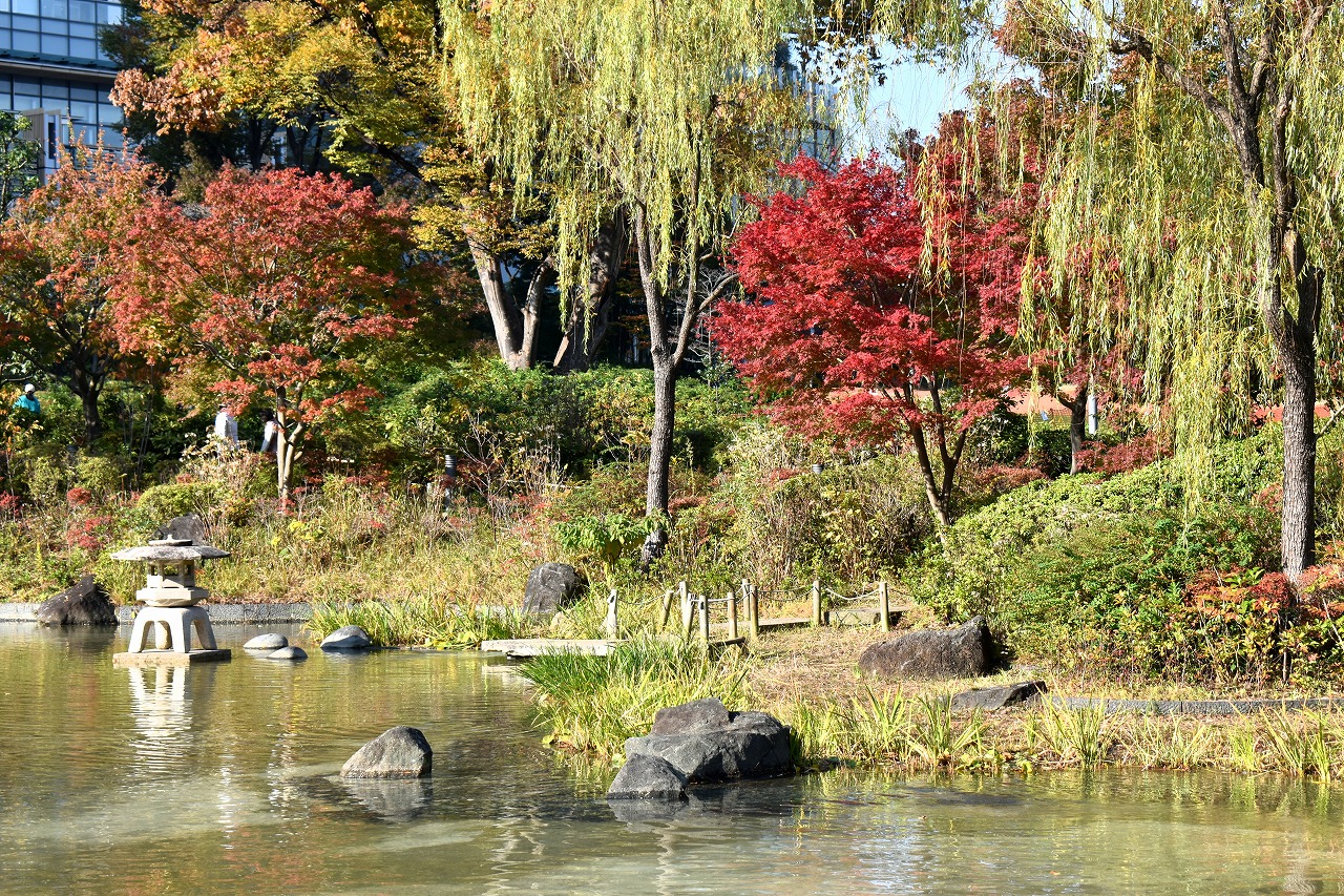 「一言」桧町公園の紅葉が進み見頃になっています。池の横に真っ赤に紅葉した木があり華やかです。