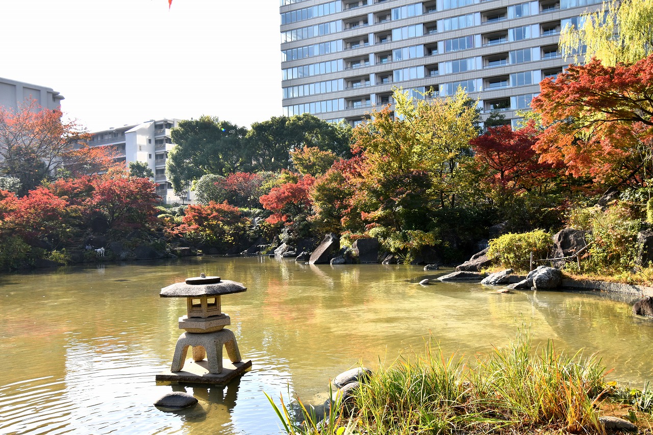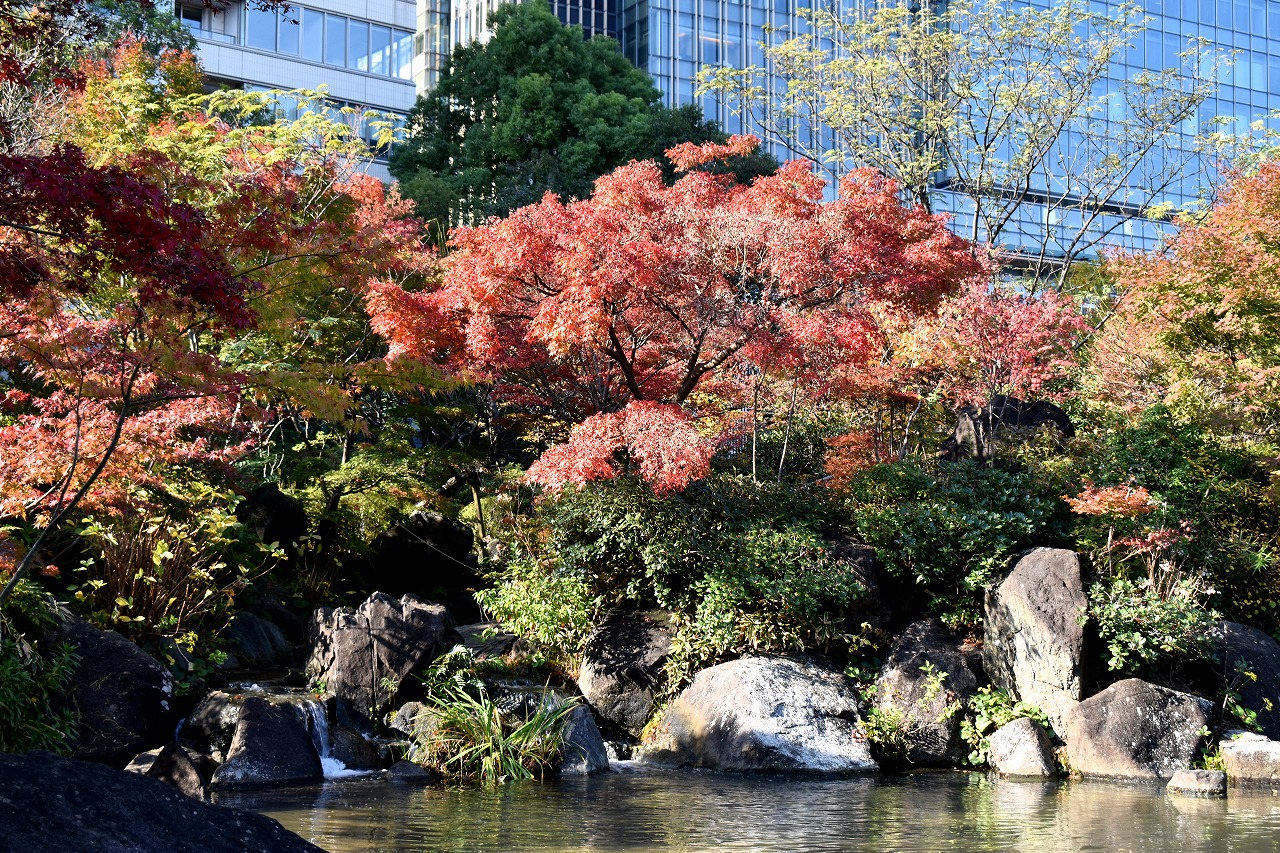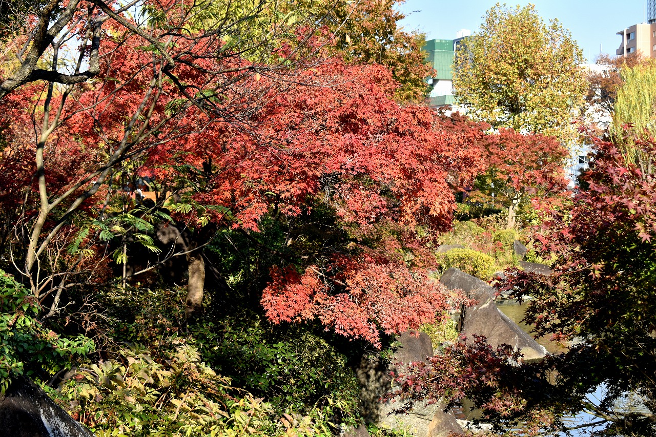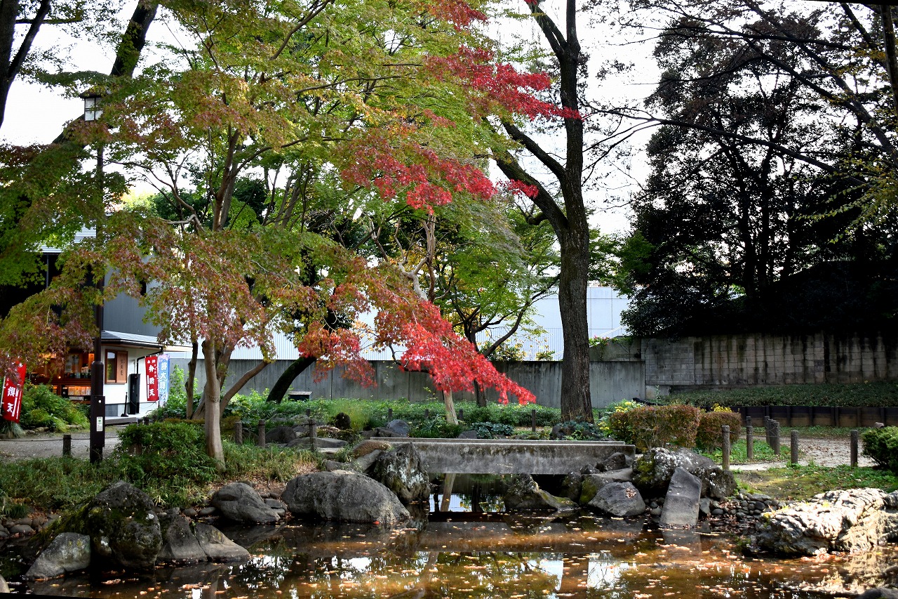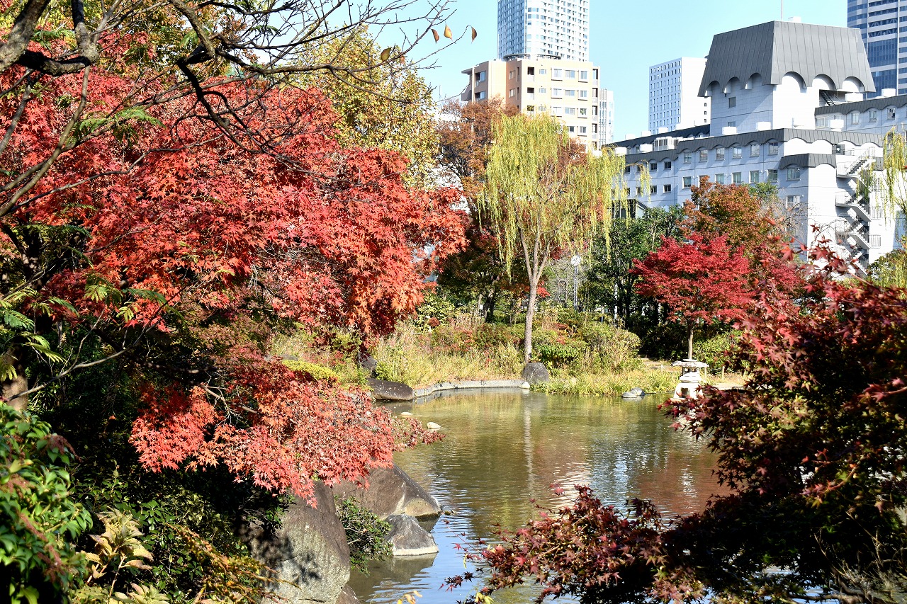 「一言」桧町公園の紅葉が進み見頃になっています。池の横に真っ赤に紅葉した木があり華やかです。