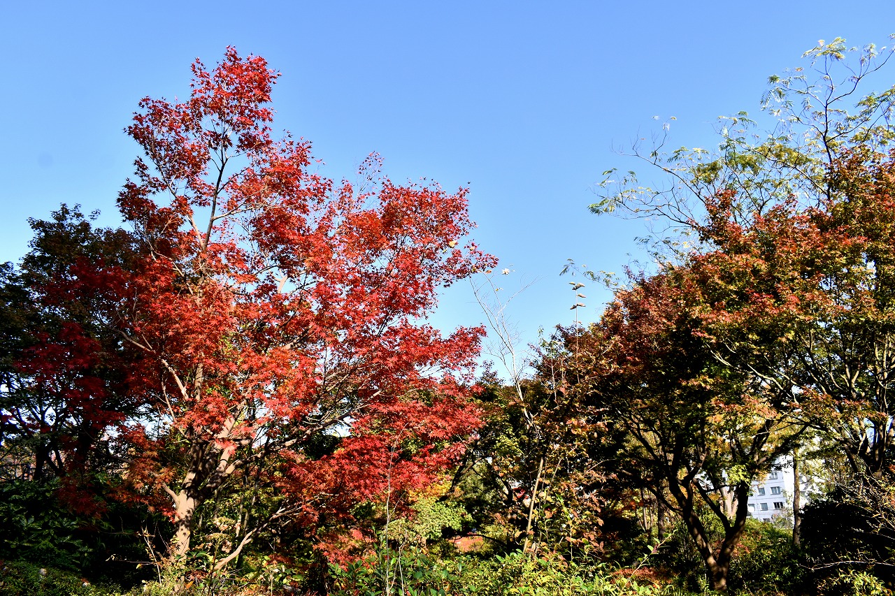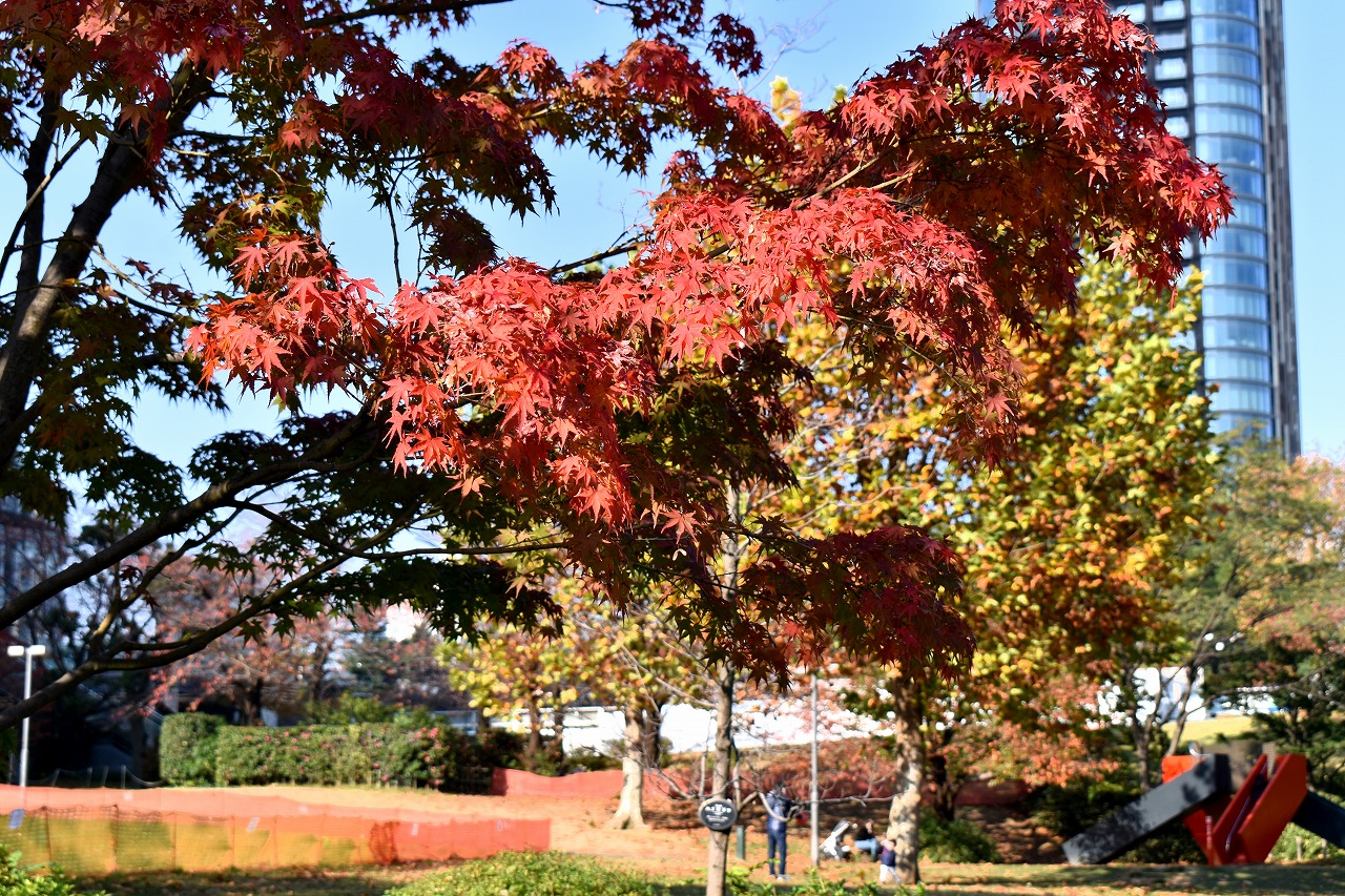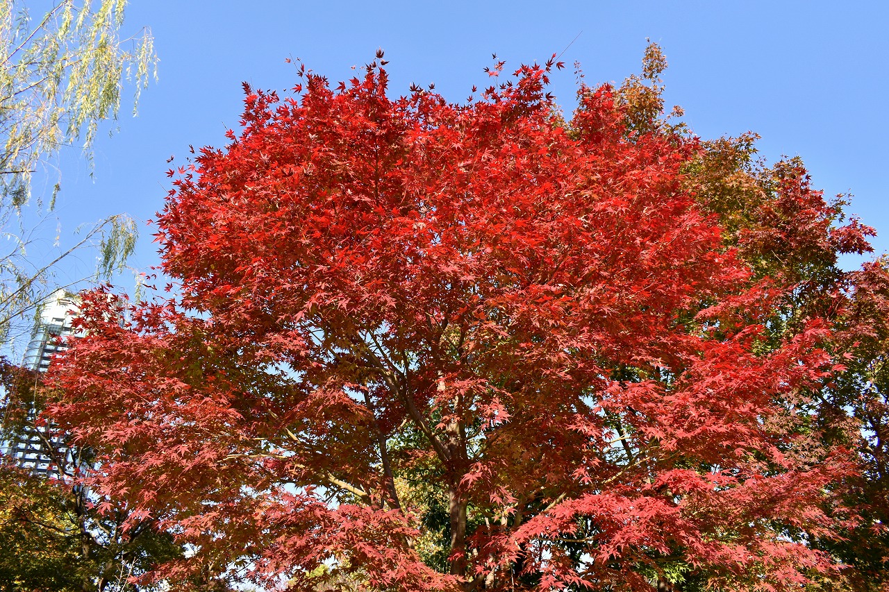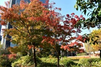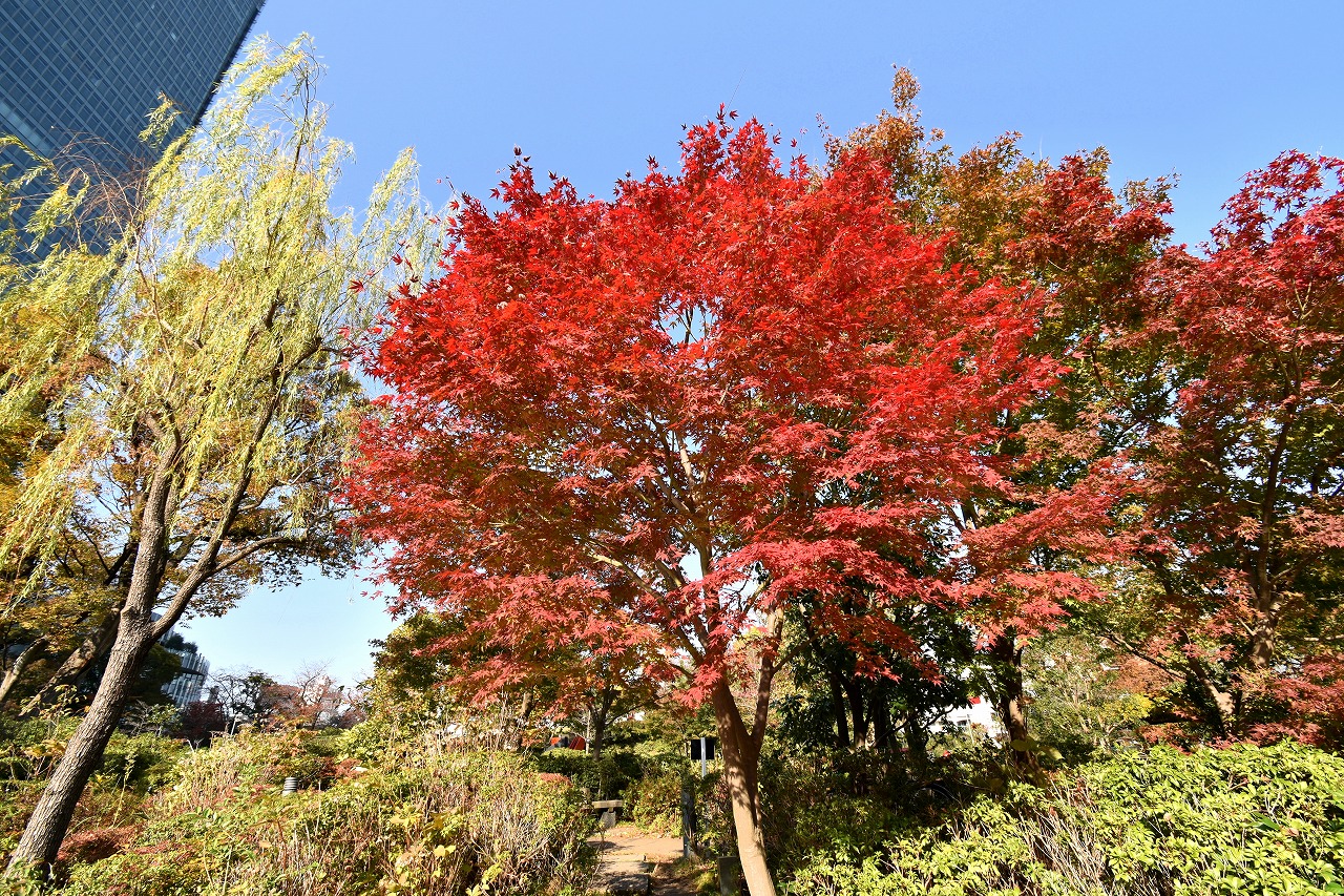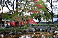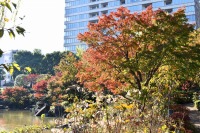 「一言」桧町公園の紅葉が進み見頃になっています。池の横に真っ赤に紅葉した木があり華やかです。