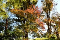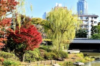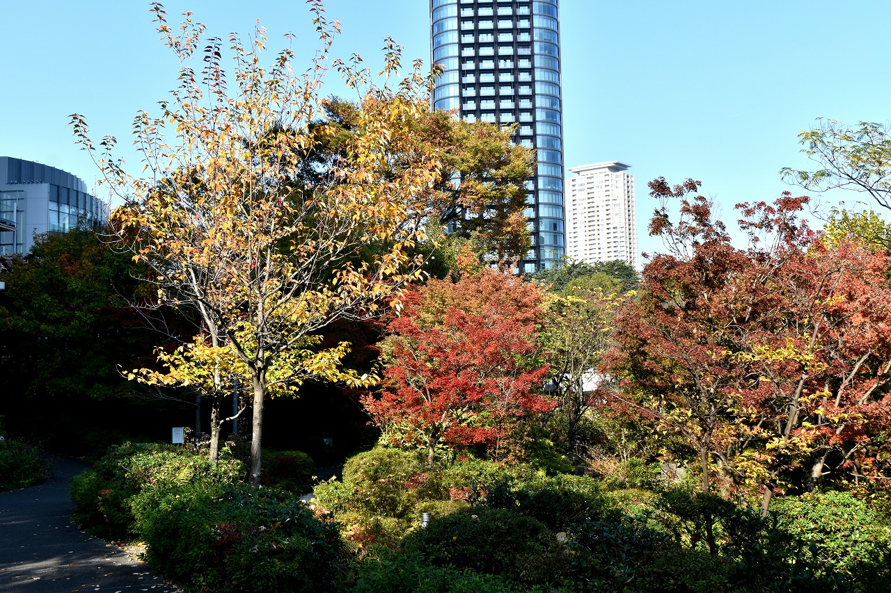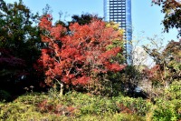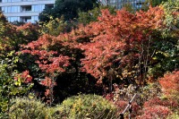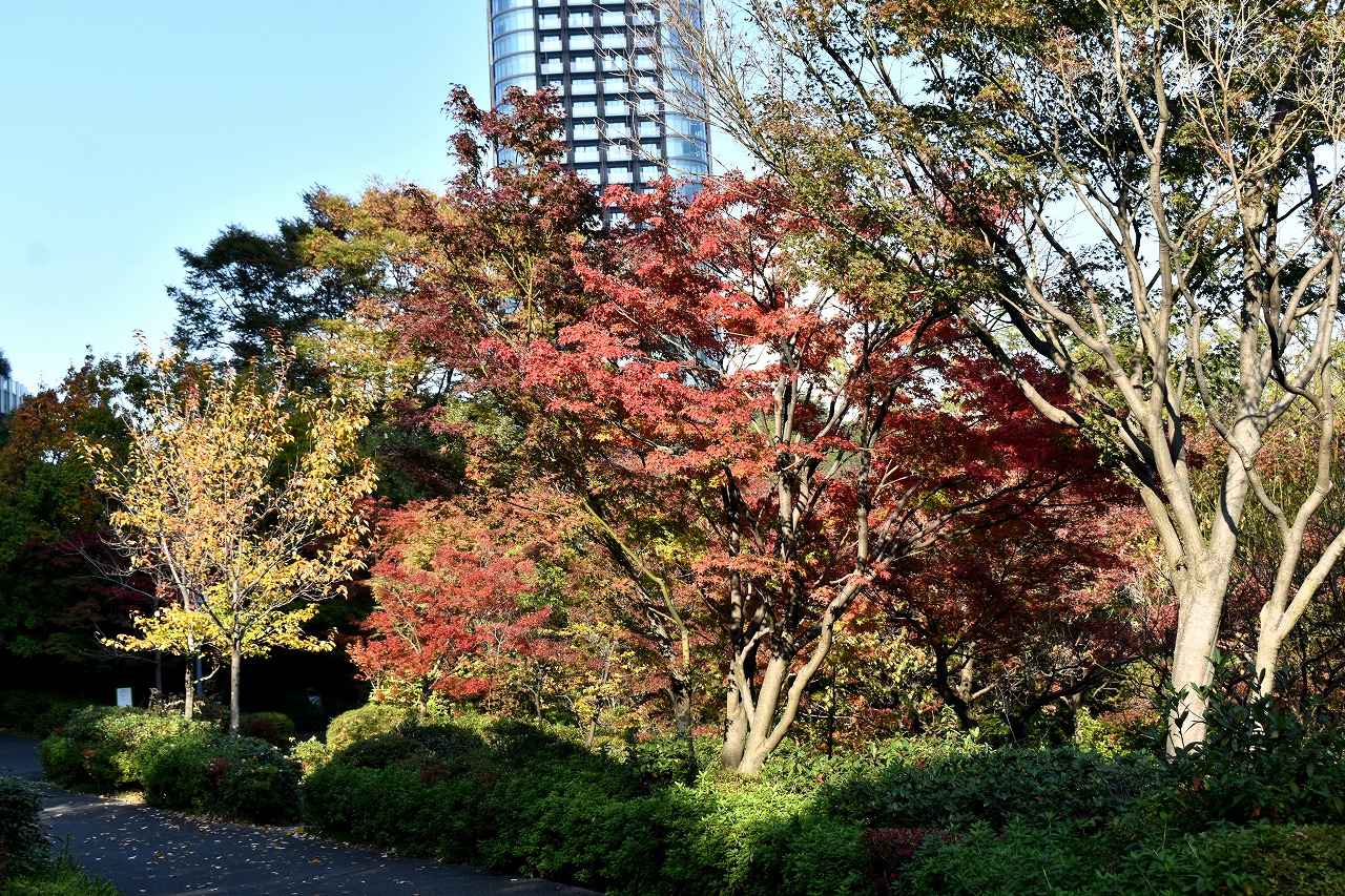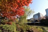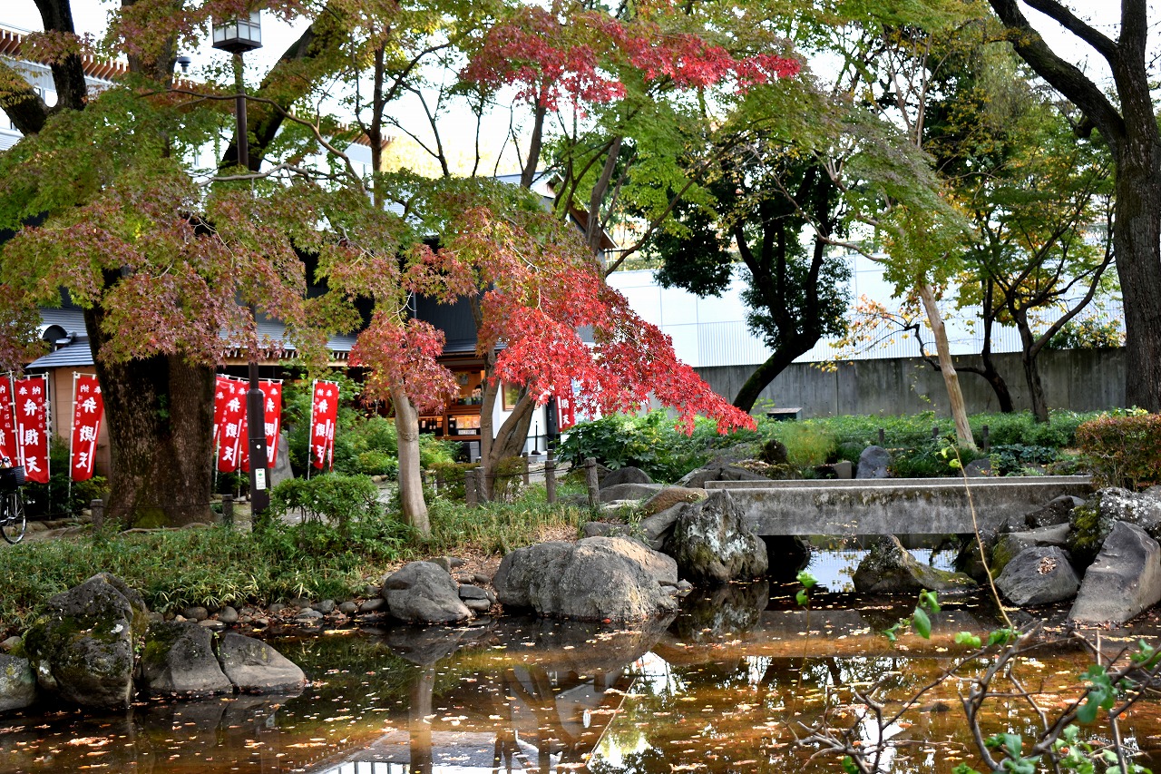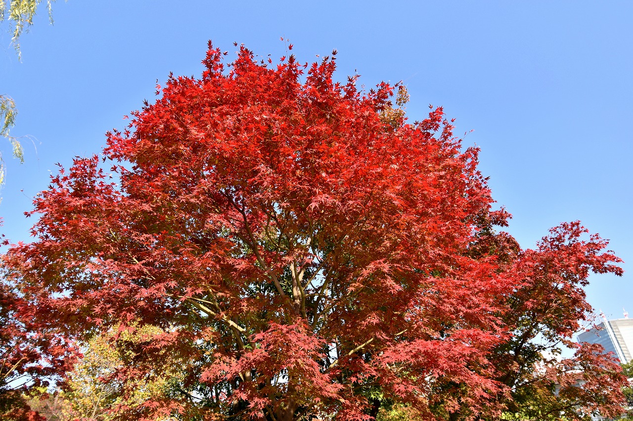 「一言」桧町公園の紅葉が進み見頃になっています。池の横に真っ赤に紅葉した木があり華やかです。