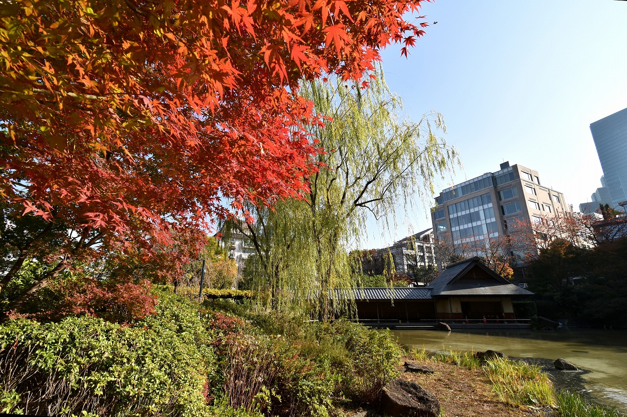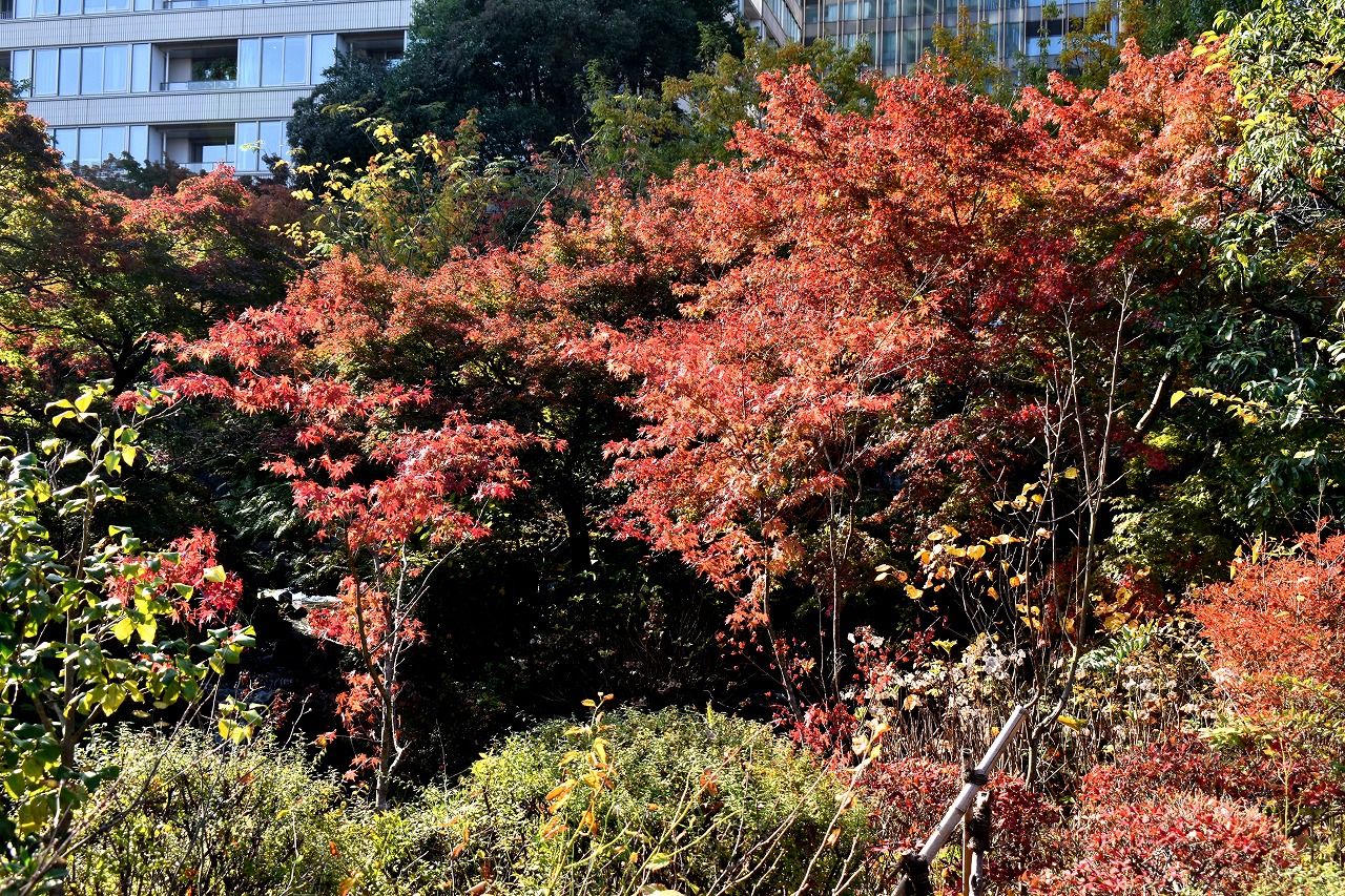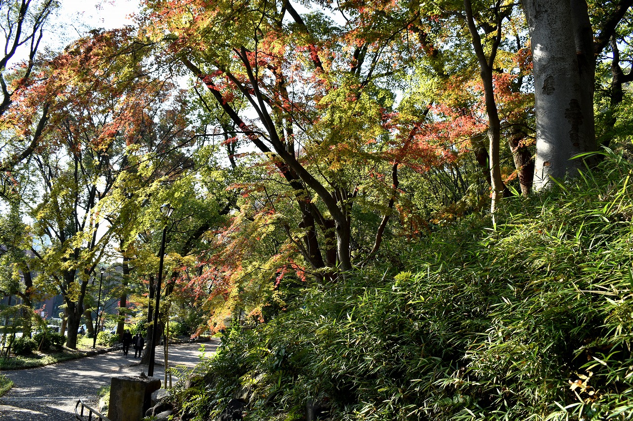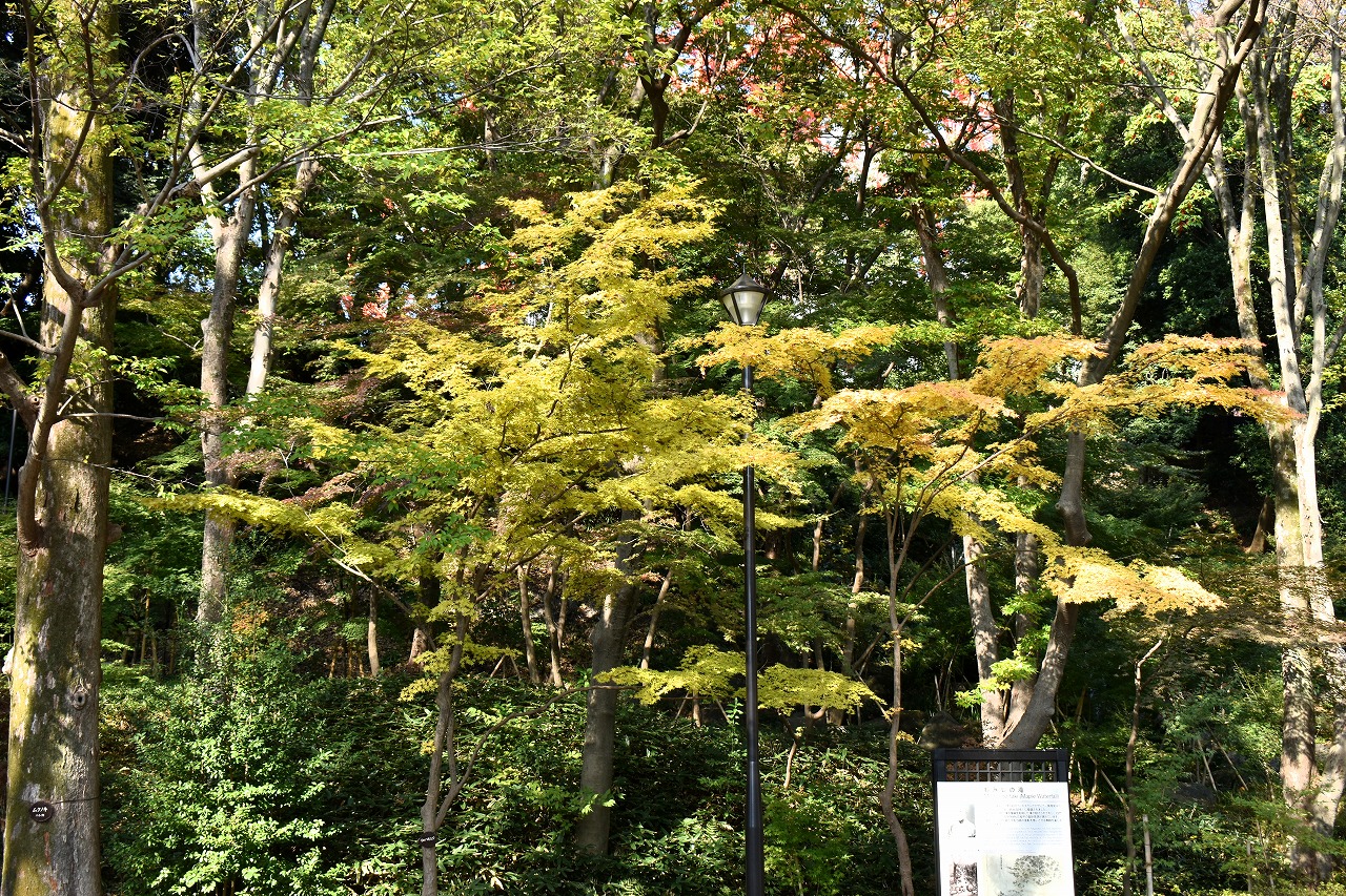 まだ。池の横には葉が青い木のあり、もう少し紅葉が進むと思います。もみじ谷の紅葉は始まった段階です。