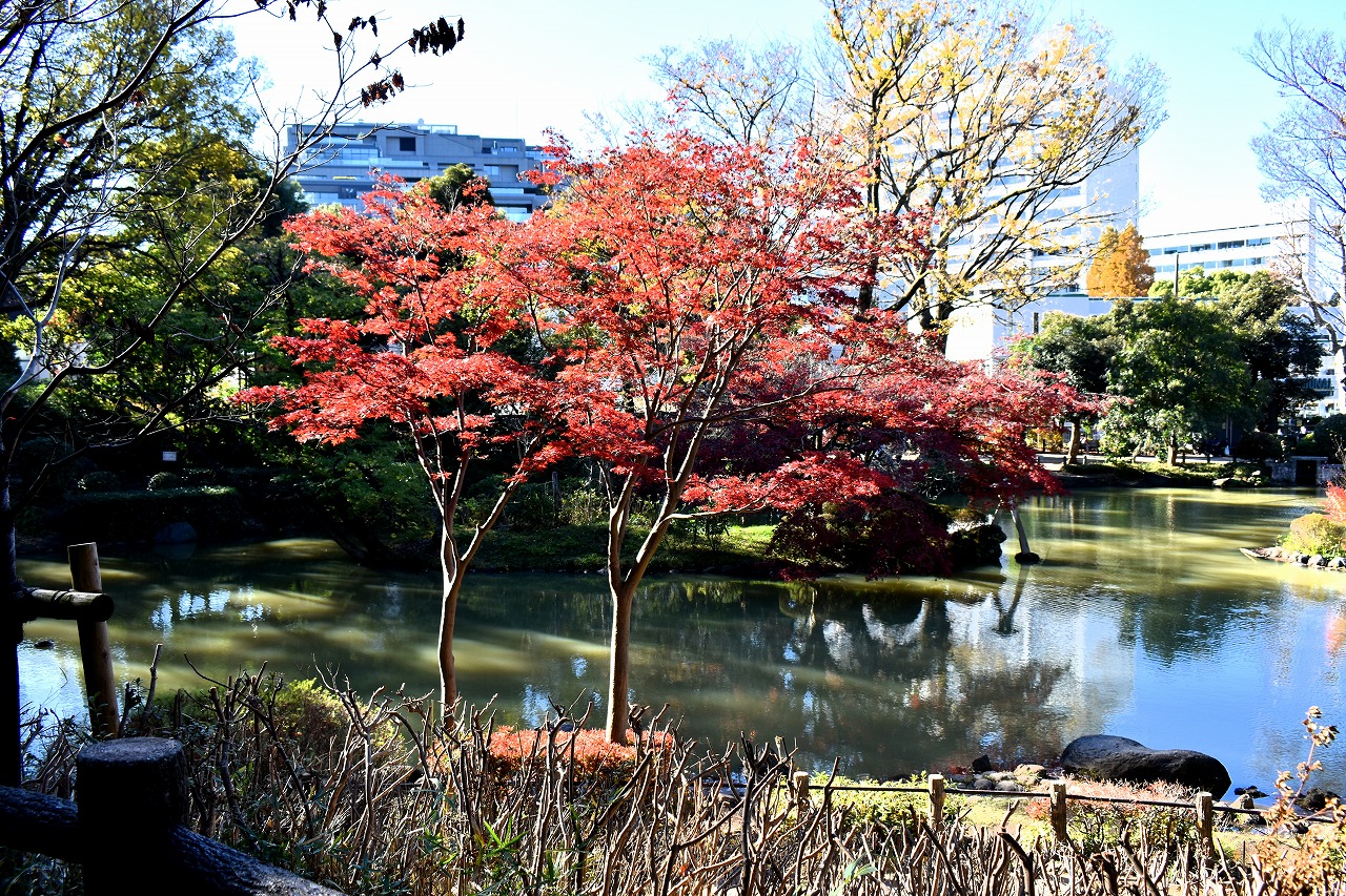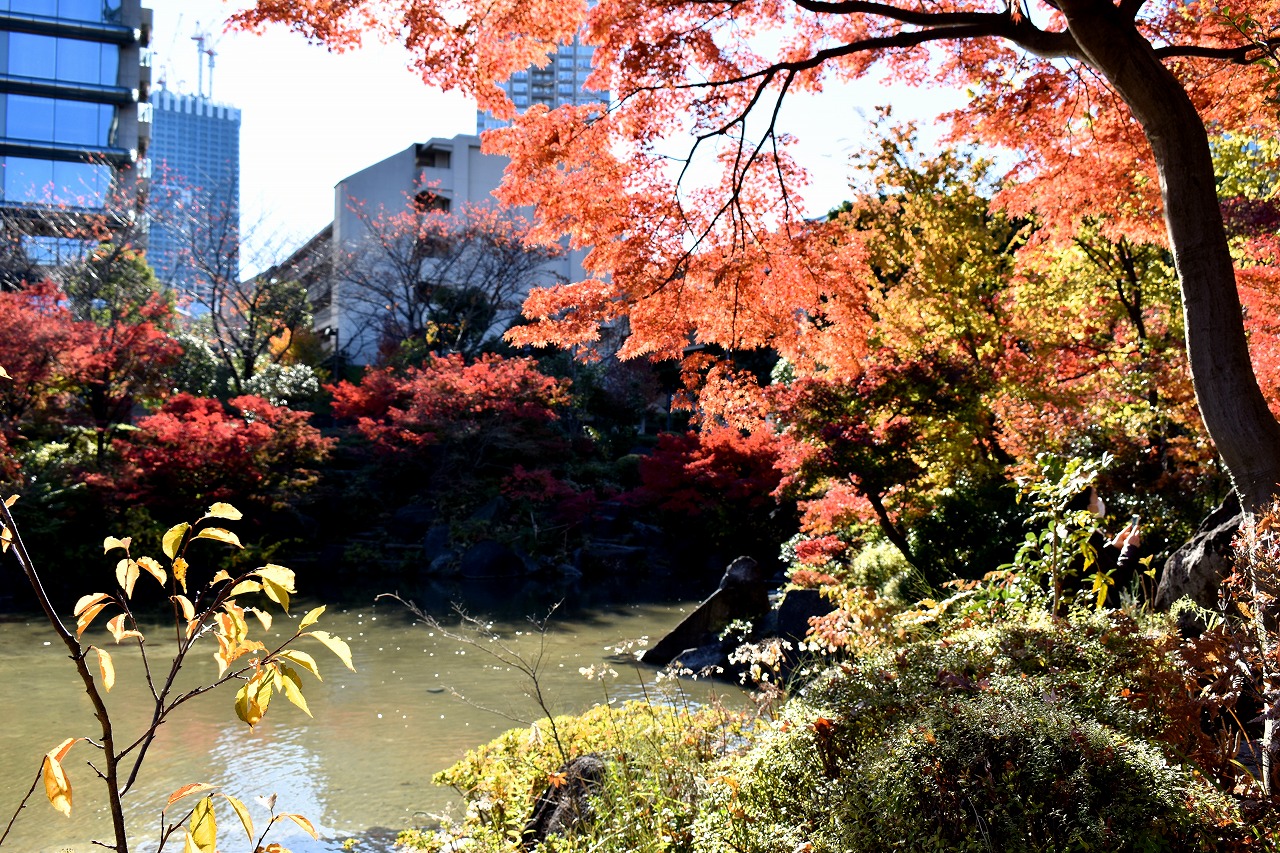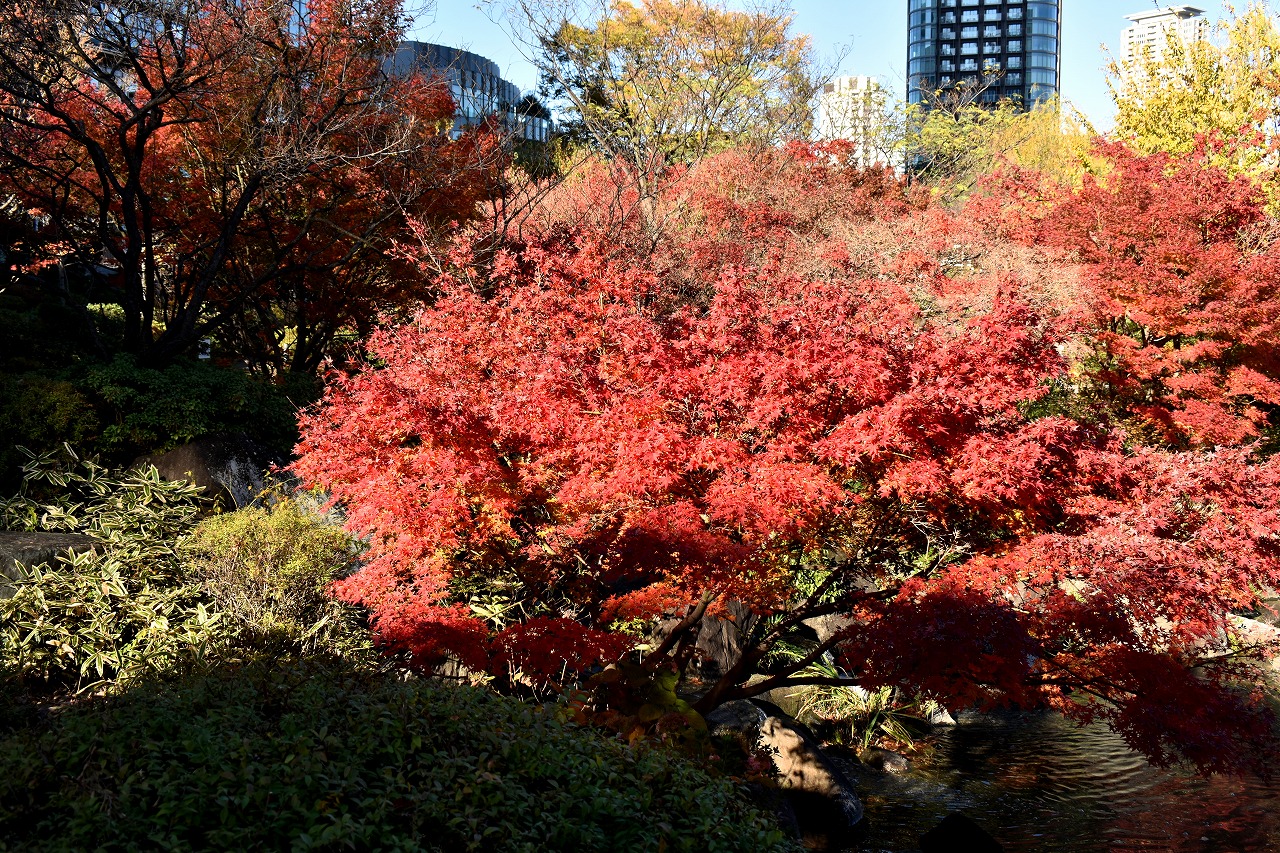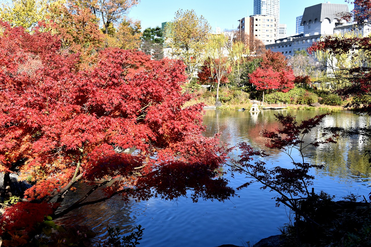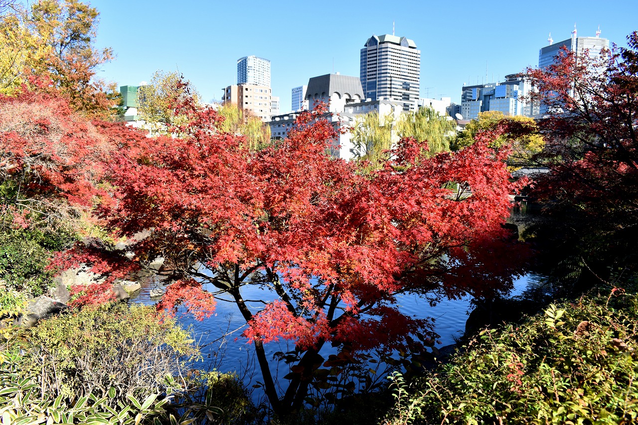 「一言」桧町公園の紅葉が見頃です。池のまわり全体が紅葉していて華やかです。真っ赤なに紅葉している葉は 透明度が増して綺麗です。有栖川公園も丘の上の紅葉が見頃です。毛利庭園は、朝はビルの陰に隠れて 紅葉が良く分かりませんでしたが、お昼過ぎに行くと紅葉に日が当たり庭全体が紅葉しており華やかです。