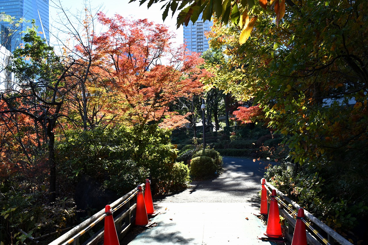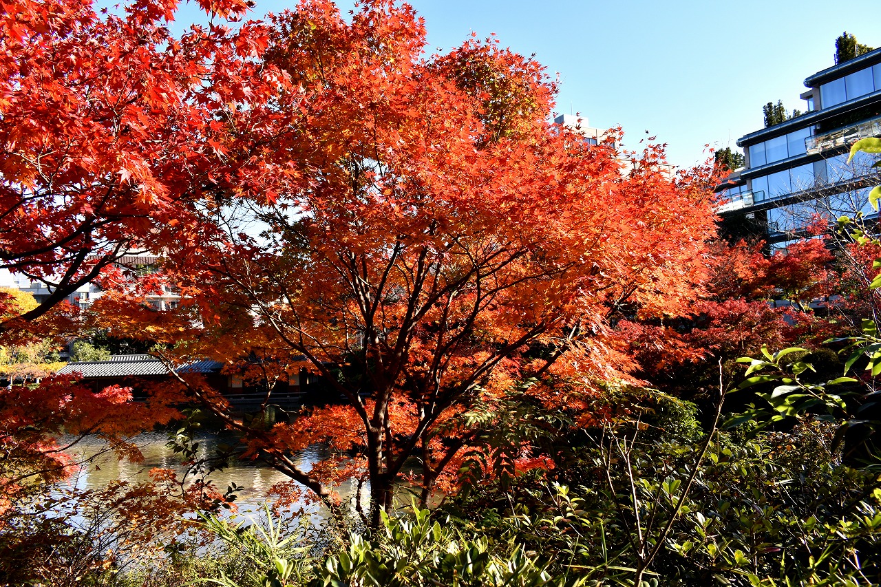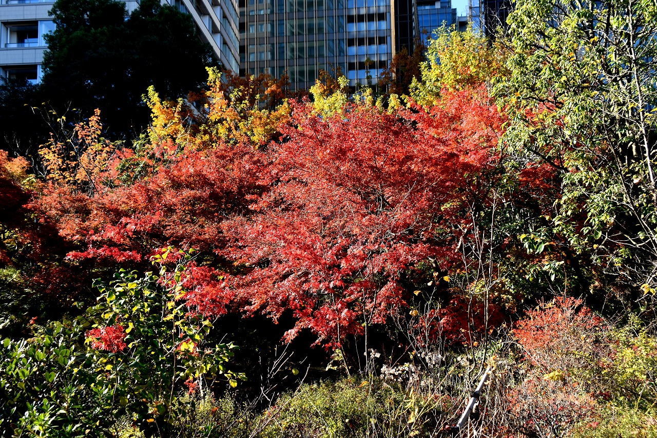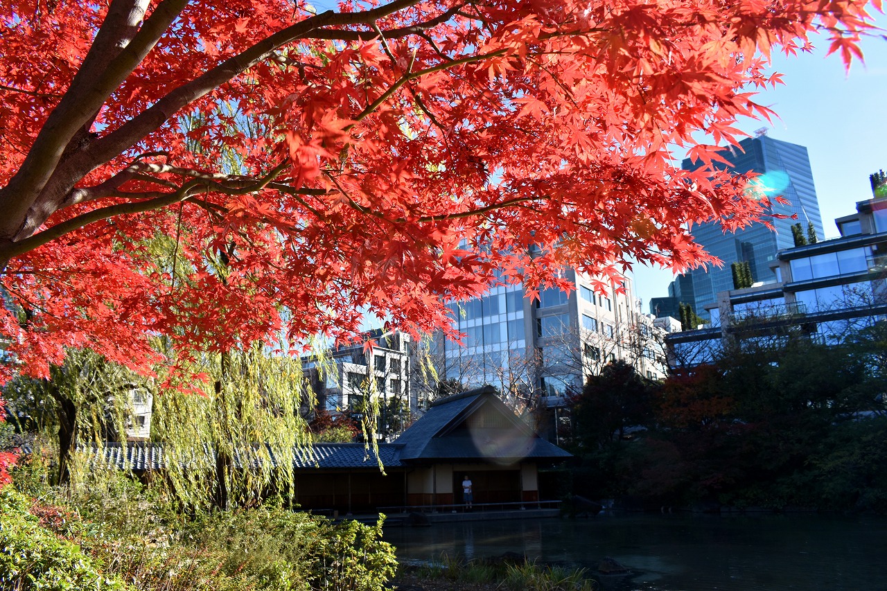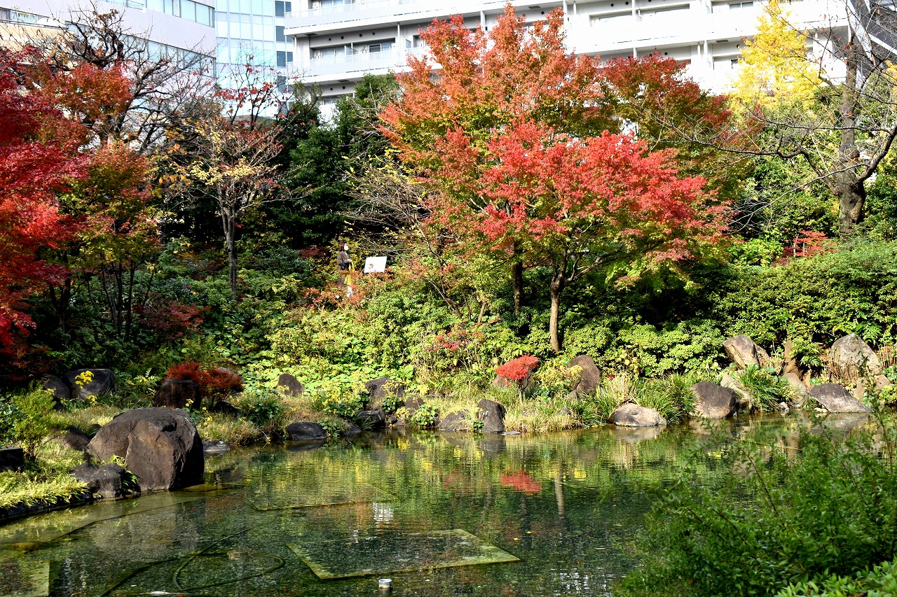 「一言」桧町公園の紅葉が見頃です。池のまわり全体が紅葉していて華やかです。真っ赤なに紅葉している葉は 透明度が増して綺麗です。有栖川公園も丘の上の紅葉が見頃です。毛利庭園は、朝はビルの陰に隠れて 紅葉が良く分かりませんでしたが、お昼過ぎに行くと紅葉に日が当たり庭全体が紅葉しており華やかです。
