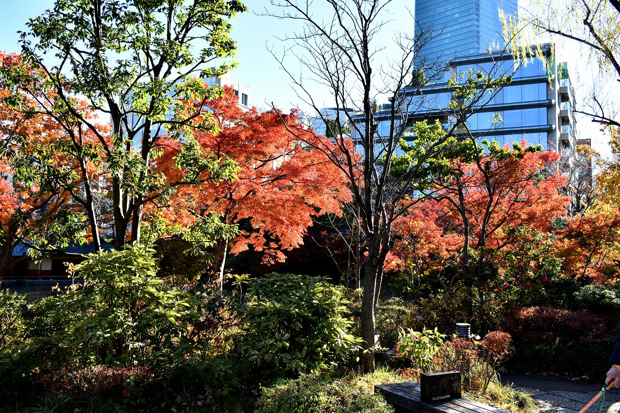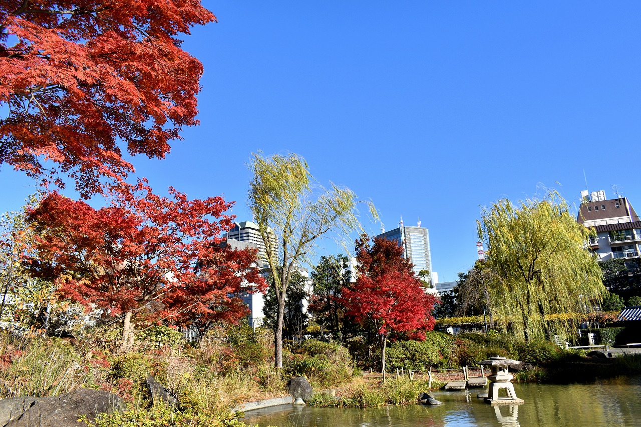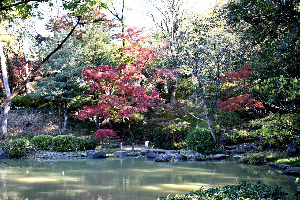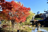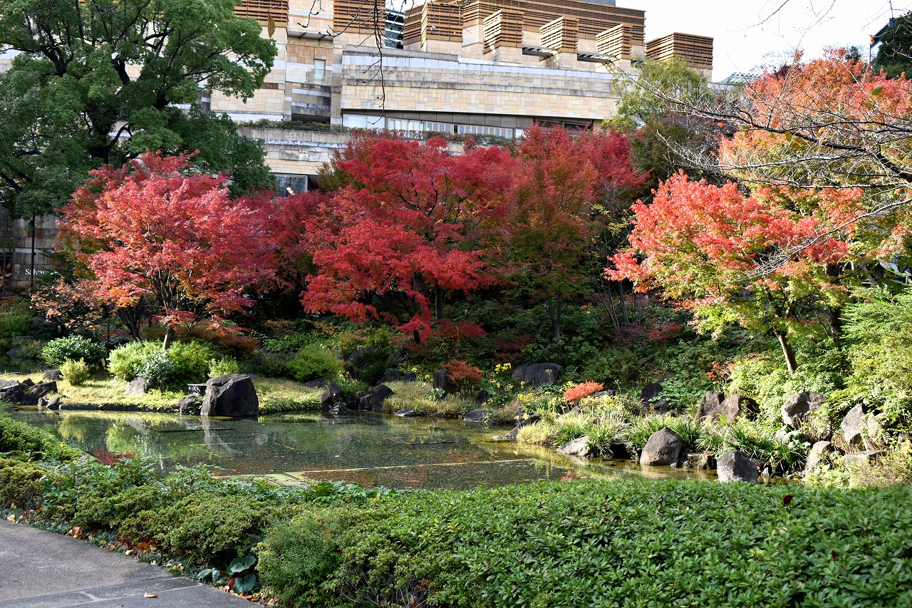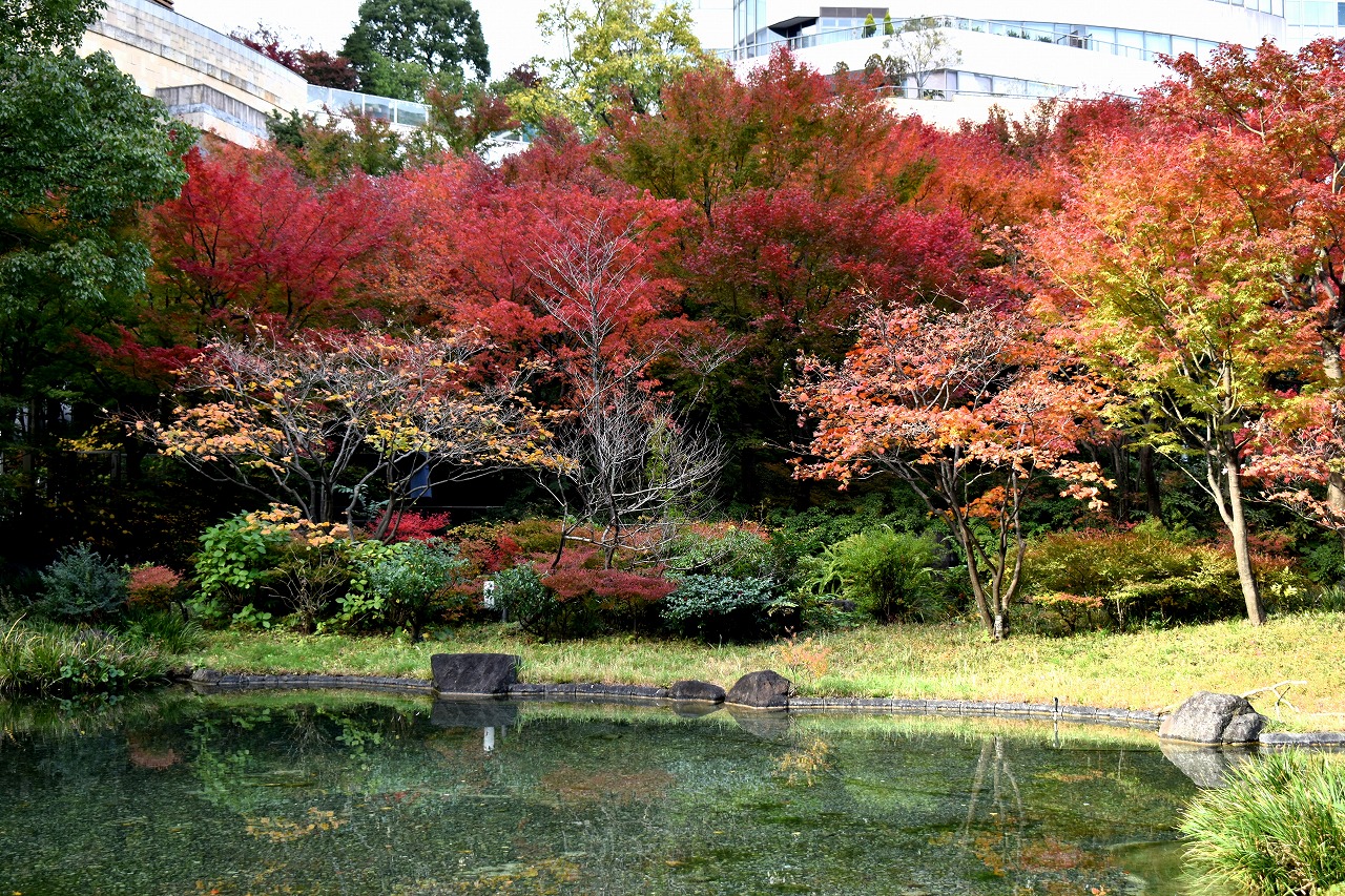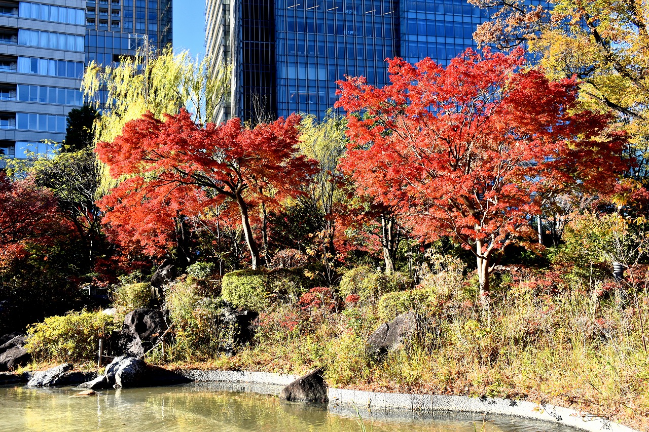 「一言」桧町公園の紅葉が見頃です。池のまわり全体が紅葉していて華やかです。真っ赤なに紅葉している葉は 透明度が増して綺麗です。有栖川公園も丘の上の紅葉が見頃です。毛利庭園は、朝はビルの陰に隠れて 紅葉が良く分かりませんでしたが、お昼過ぎに行くと紅葉に日が当たり庭全体が紅葉しており華やかです。