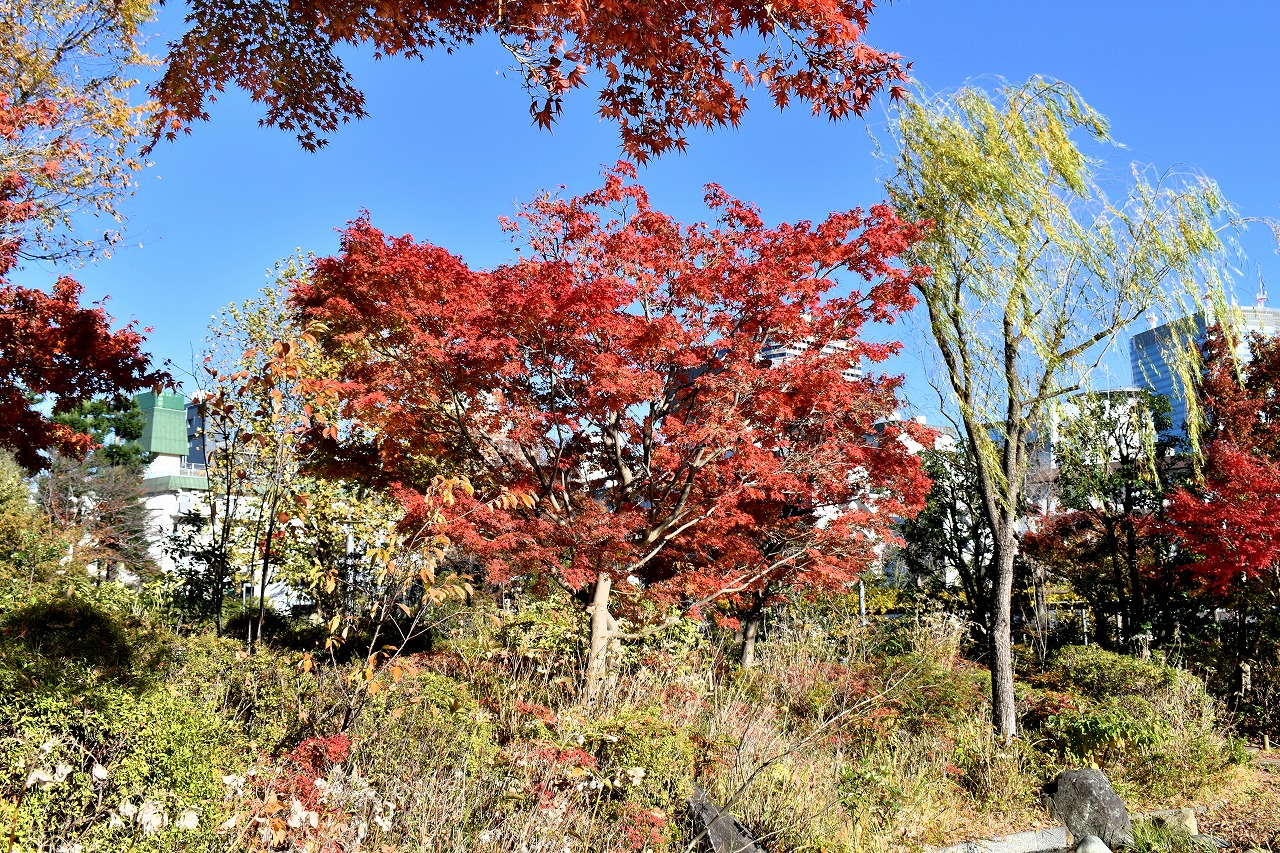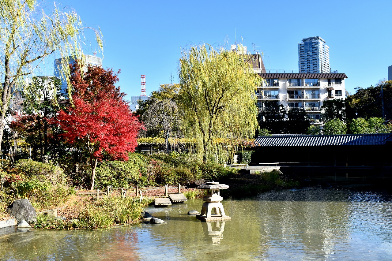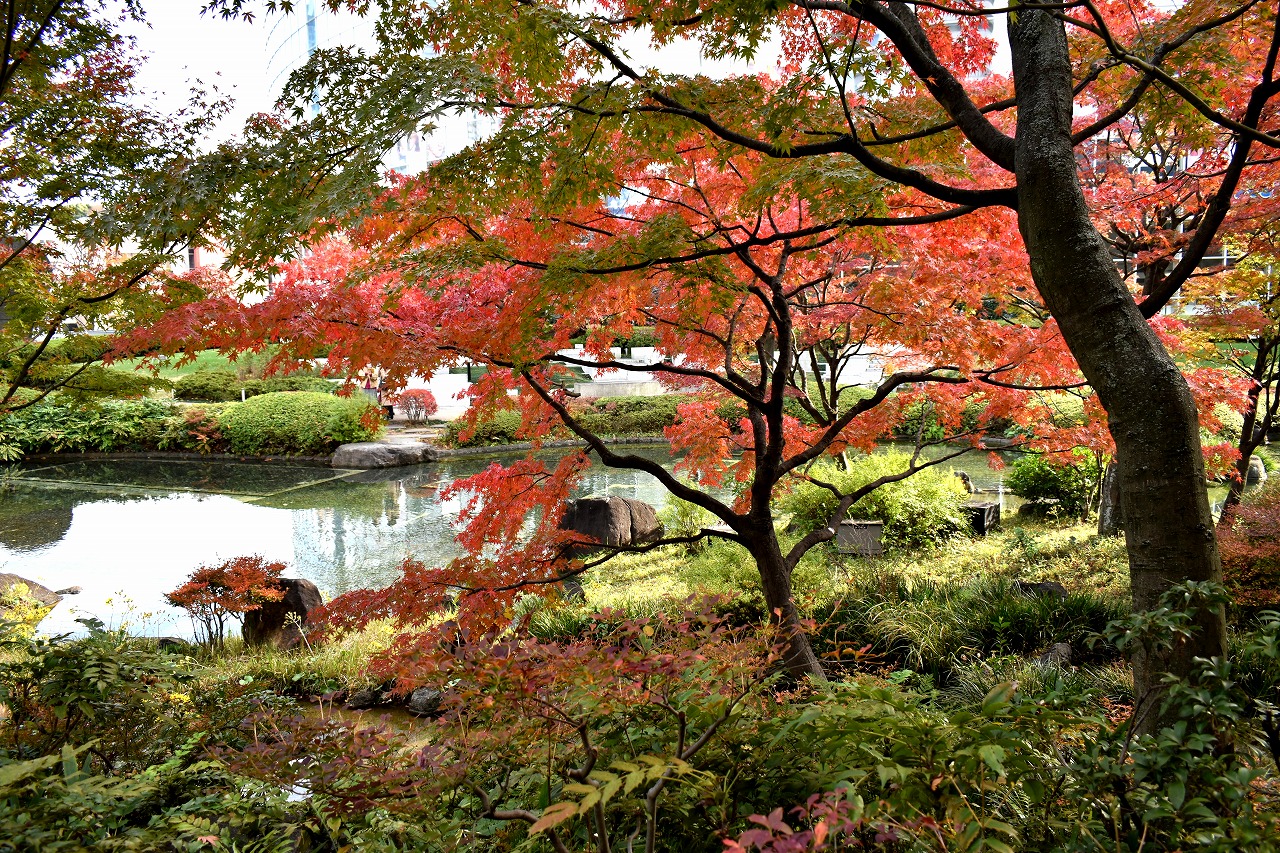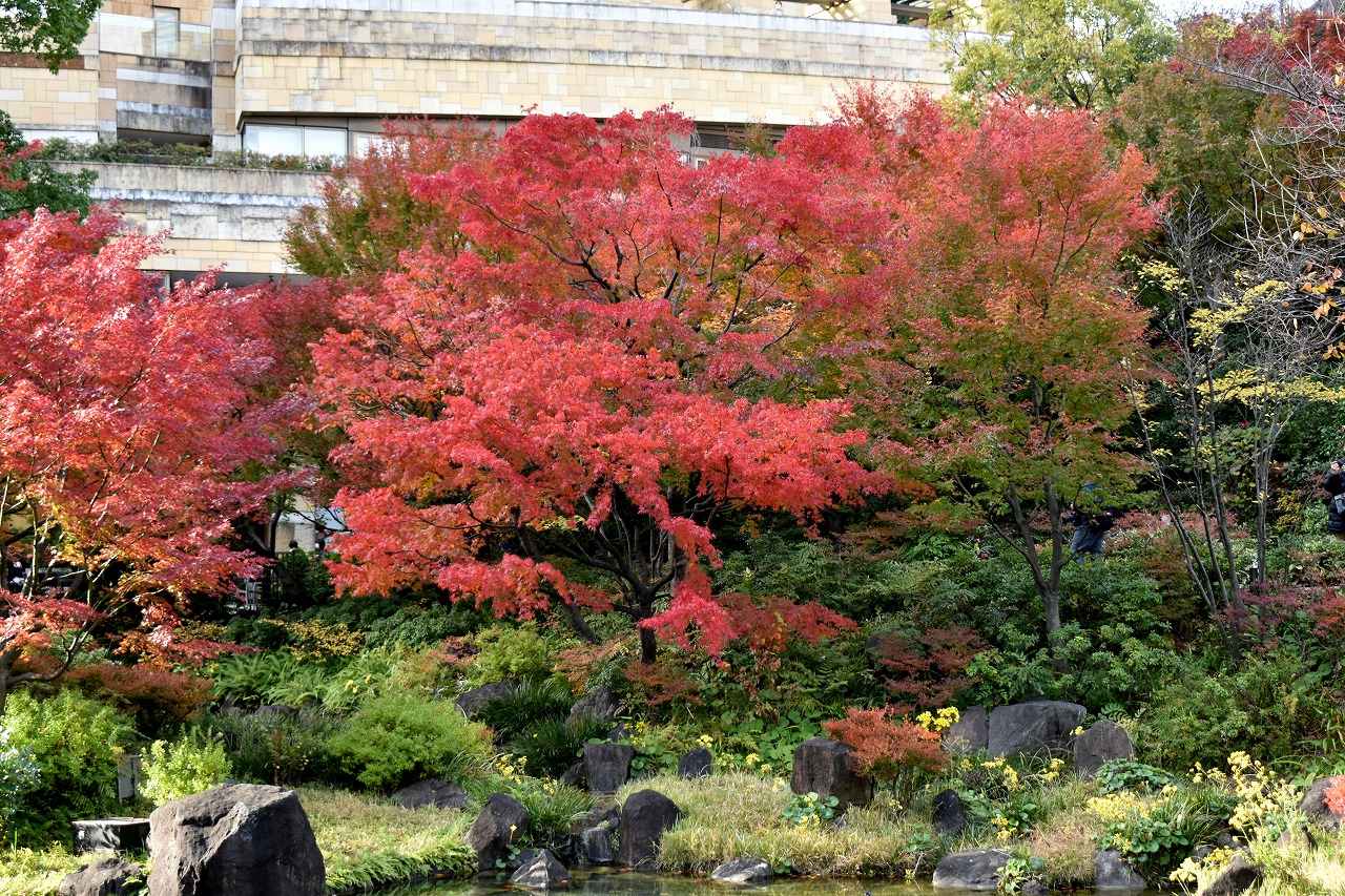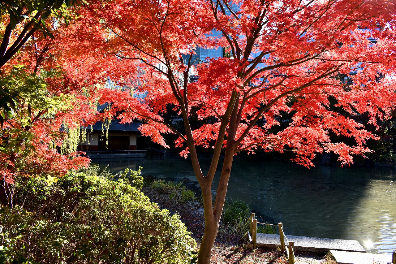 「一言」桧町公園の紅葉が見頃です。池のまわり全体が紅葉していて華やかです。真っ赤なに紅葉している葉は 透明度が増して綺麗です。有栖川公園も丘の上の紅葉が見頃です。毛利庭園は、朝はビルの陰に隠れて 紅葉が良く分かりませんでしたが、お昼過ぎに行くと紅葉に日が当たり庭全体が紅葉しており華やかです。