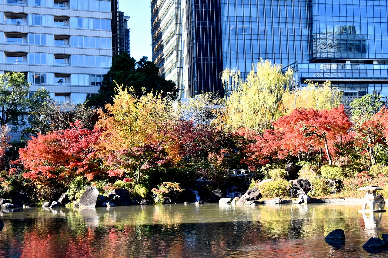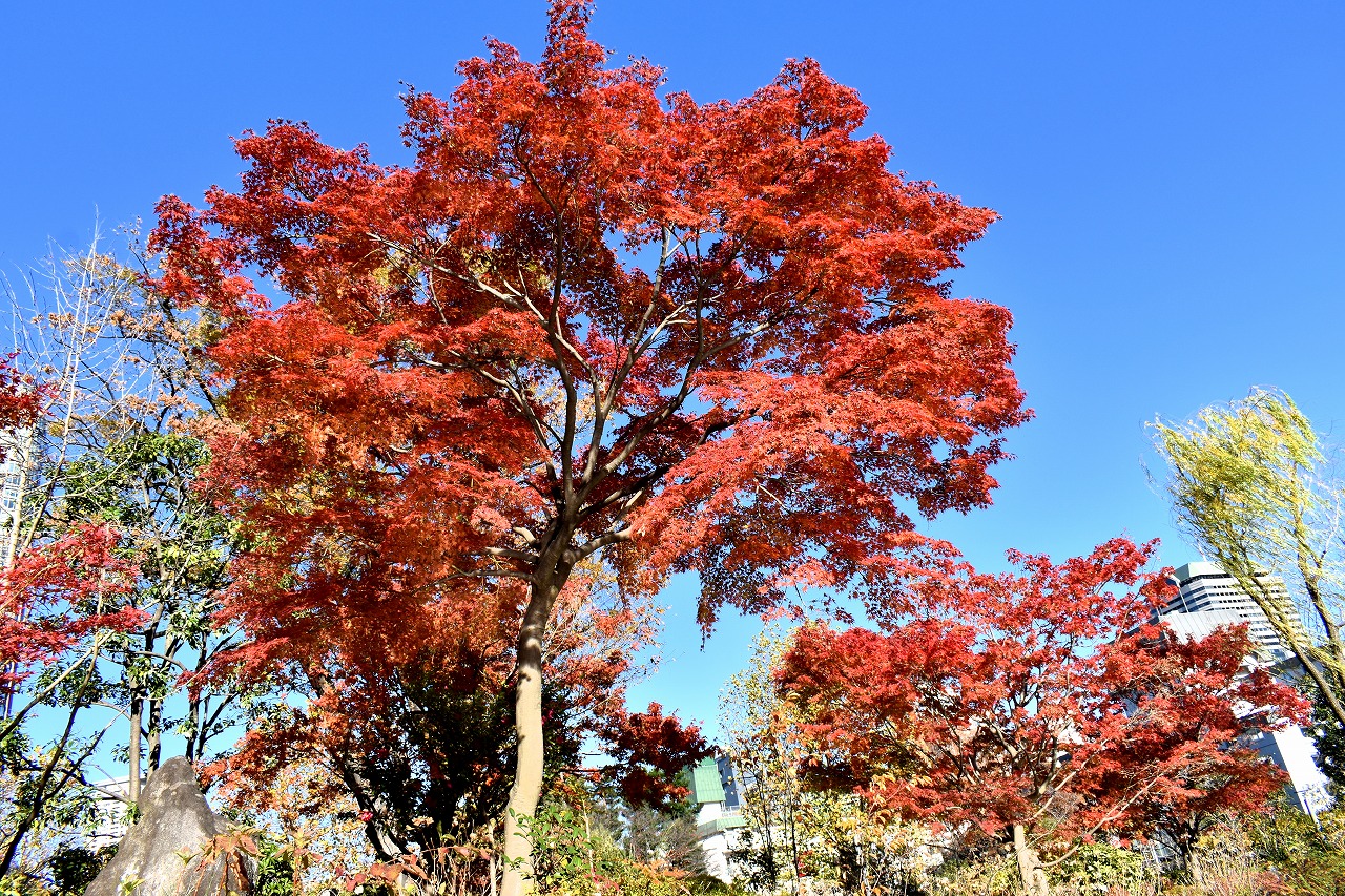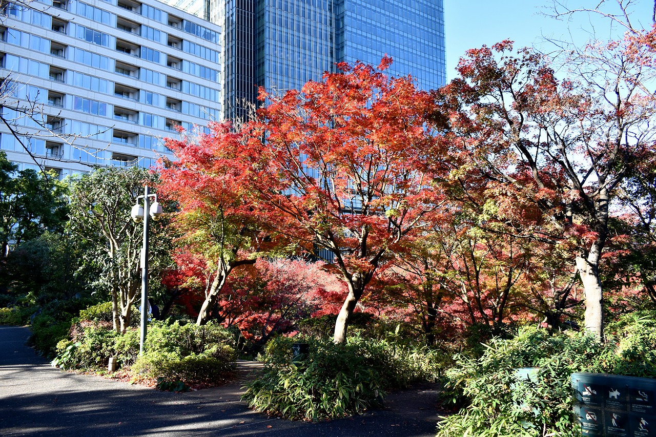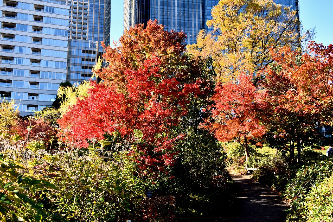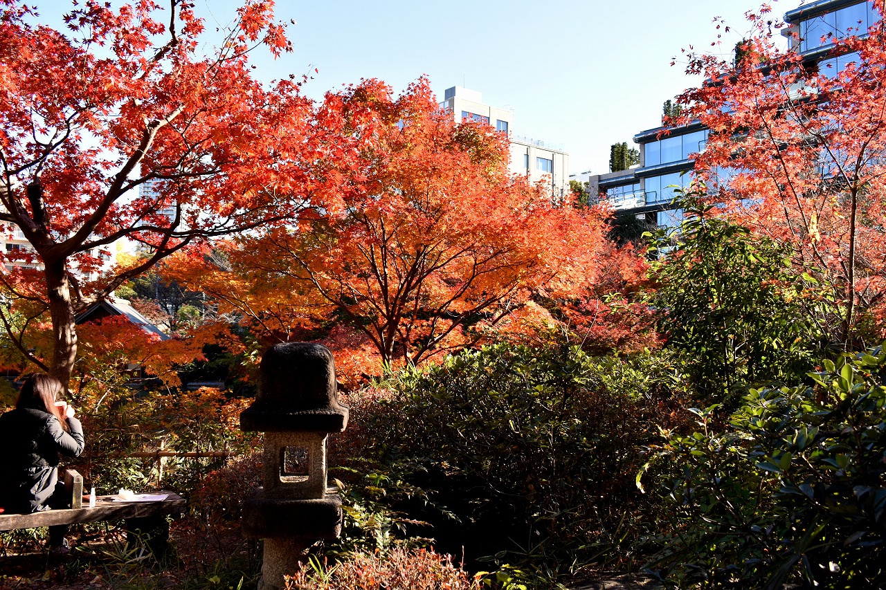 「一言」桧町公園の紅葉が見頃です。池のまわり全体が紅葉していて華やかです。真っ赤なに紅葉している葉は 透明度が増して綺麗です。有栖川公園も丘の上の紅葉が見頃です。毛利庭園は、朝はビルの陰に隠れて 紅葉が良く分かりませんでしたが、お昼過ぎに行くと紅葉に日が当たり庭全体が紅葉しており華やかです。