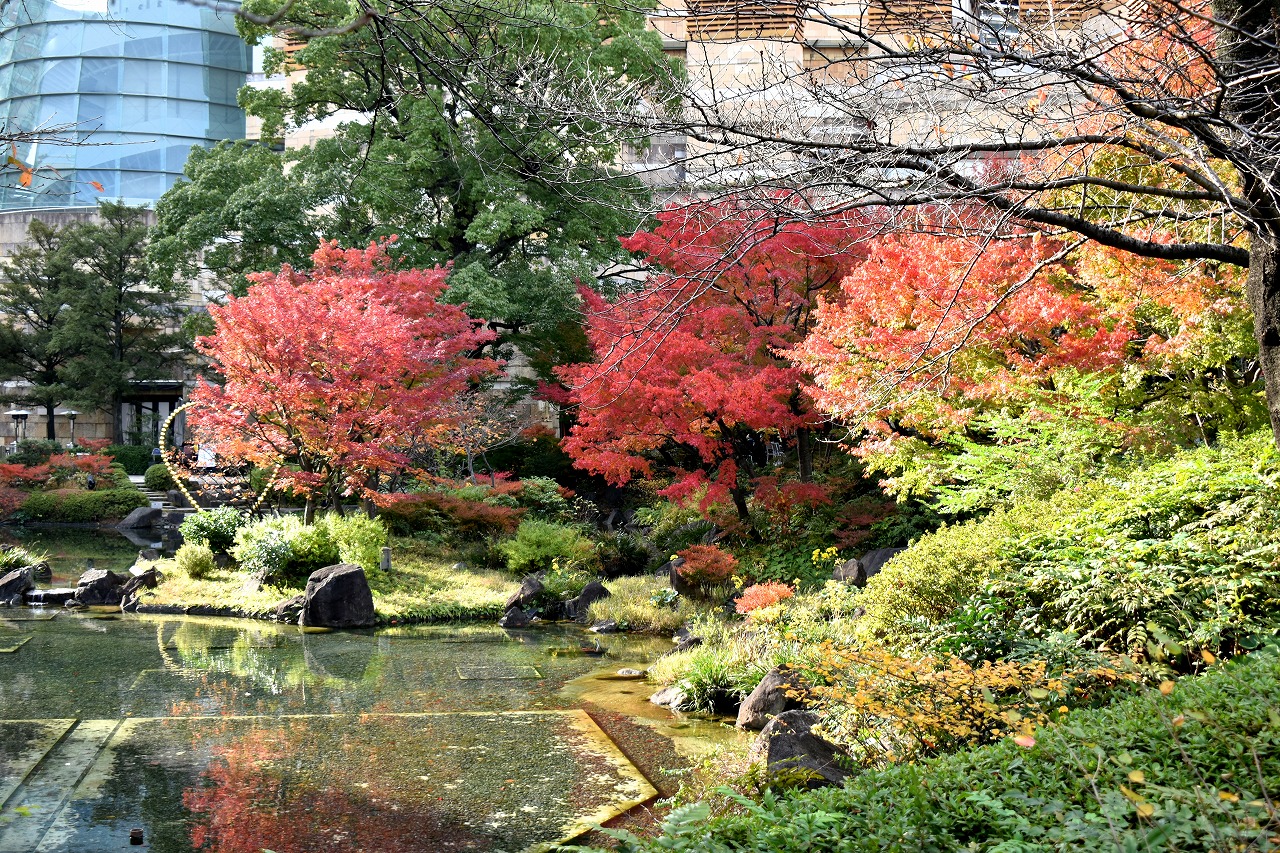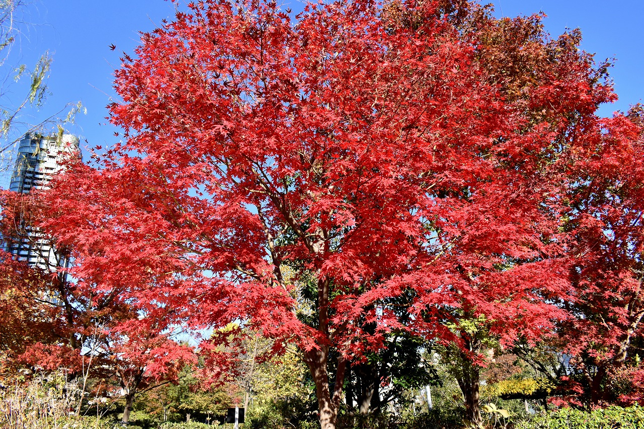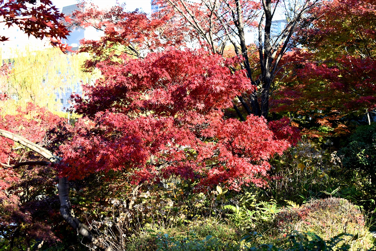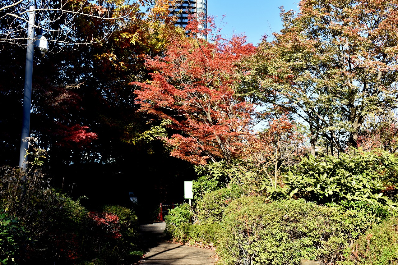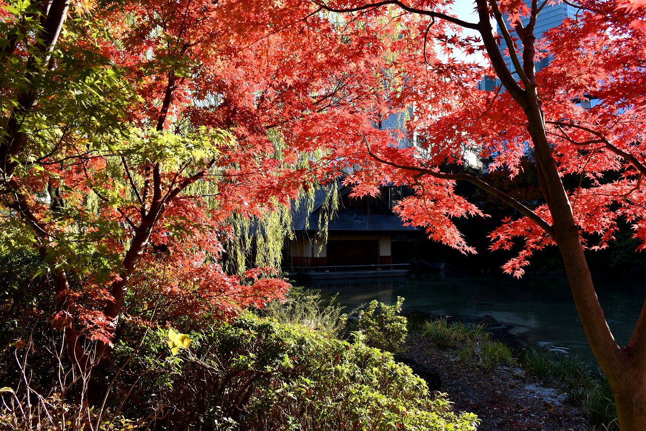 「一言」桧町公園の紅葉が見頃です。池のまわり全体が紅葉していて華やかです。真っ赤なに紅葉している葉は 透明度が増して綺麗です。有栖川公園も丘の上の紅葉が見頃です。毛利庭園は、朝はビルの陰に隠れて 紅葉が良く分かりませんでしたが、お昼過ぎに行くと紅葉に日が当たり庭全体が紅葉しており華やかです。