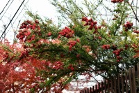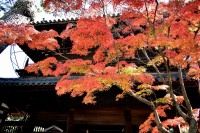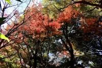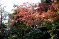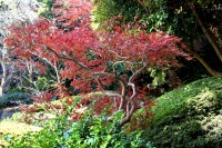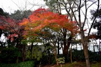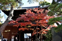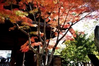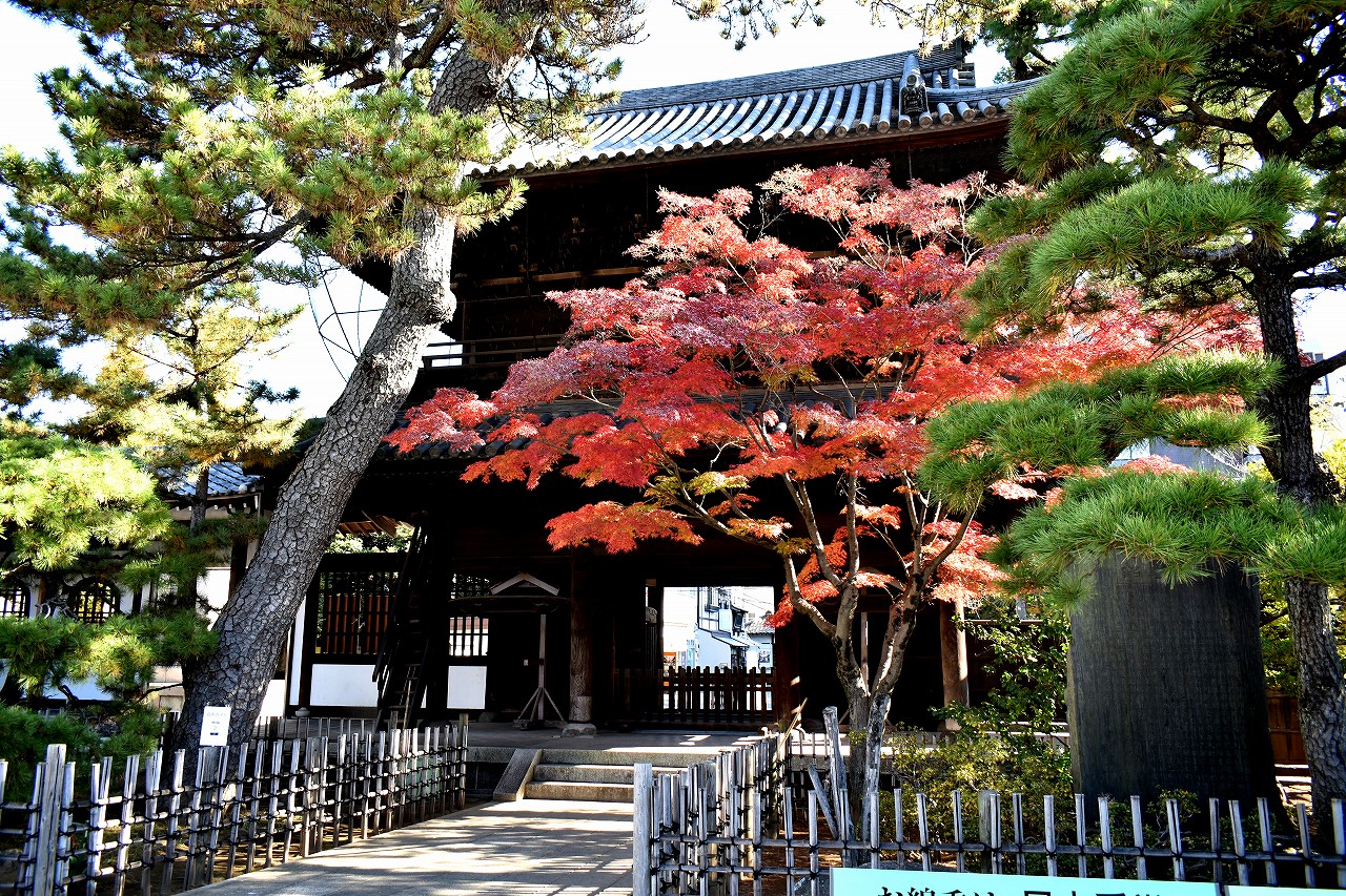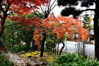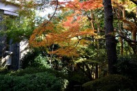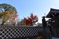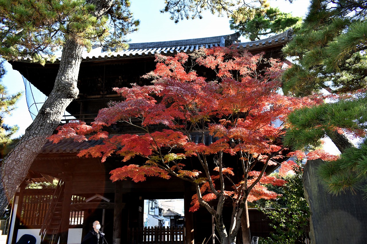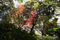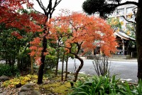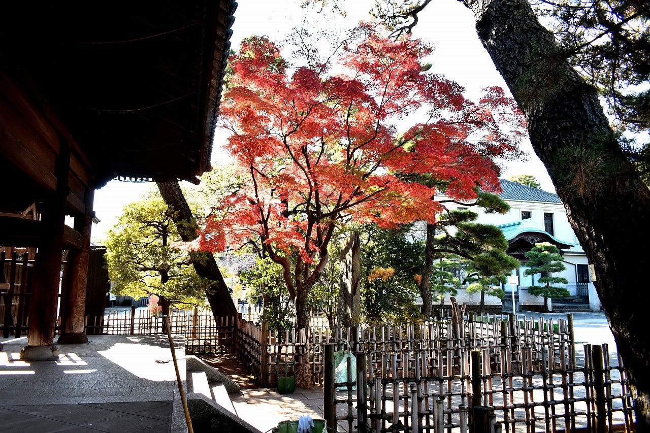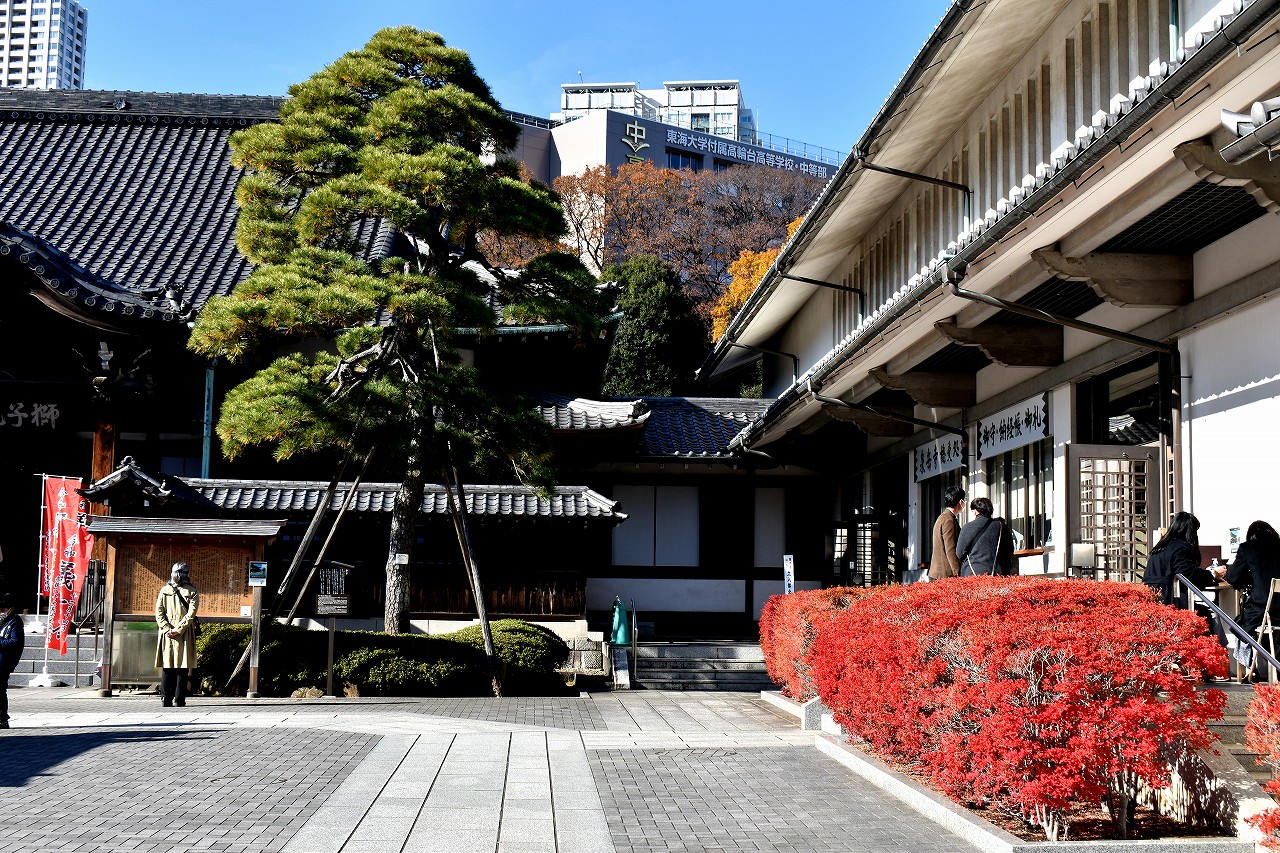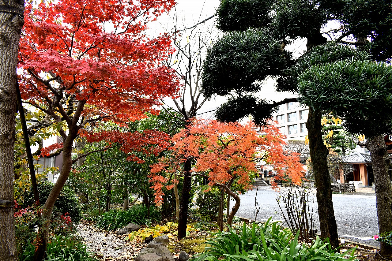 泉岳寺の境内のモミジが紅葉しています。大きな松の下に植えられていて風情があります。ドウダンツツジも紅葉しています。