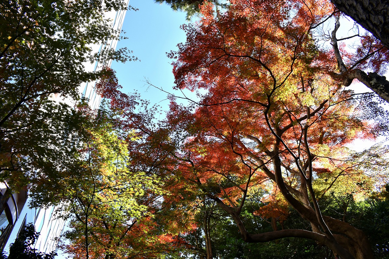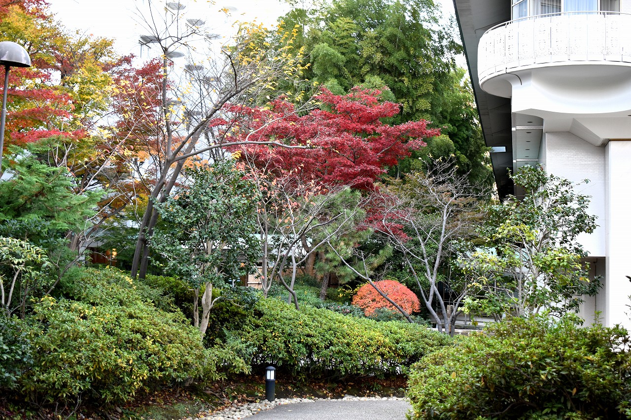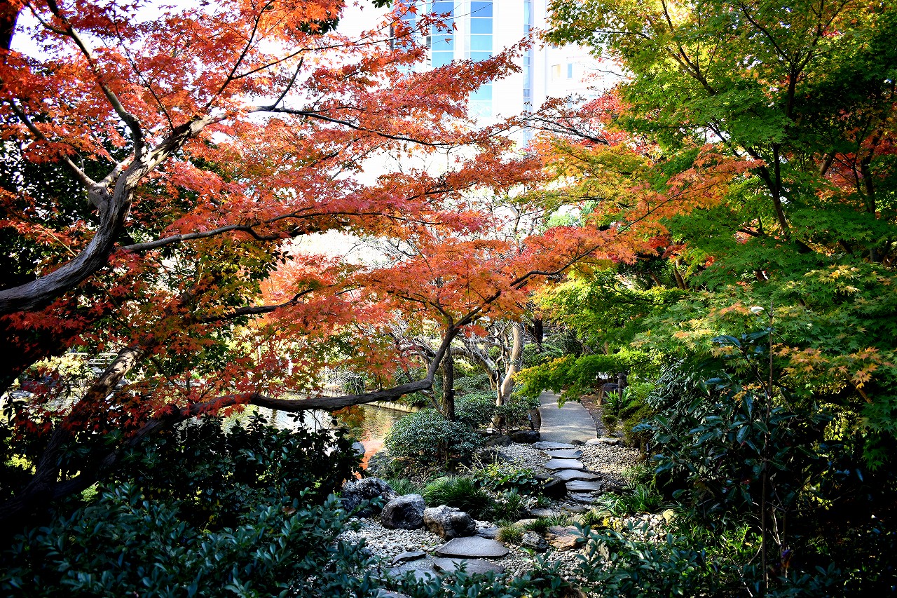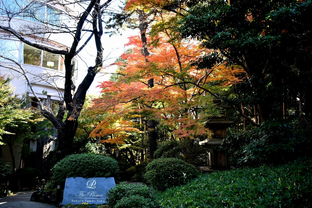 「一言」高輪プリンスホテルの庭園の紅葉が見頃になっています。庭園にはたくさんのモミジが植えられていて綺麗です。