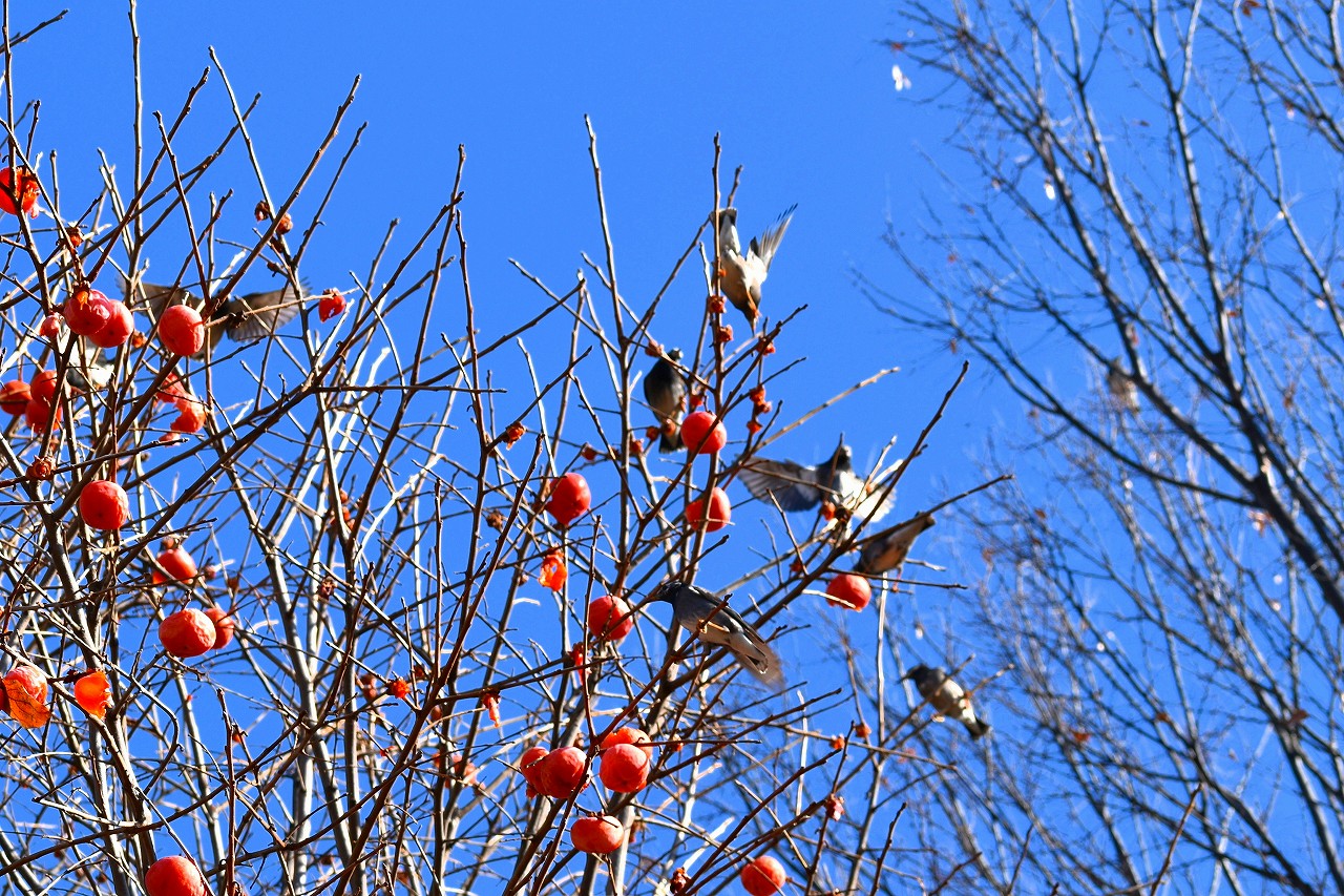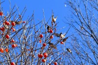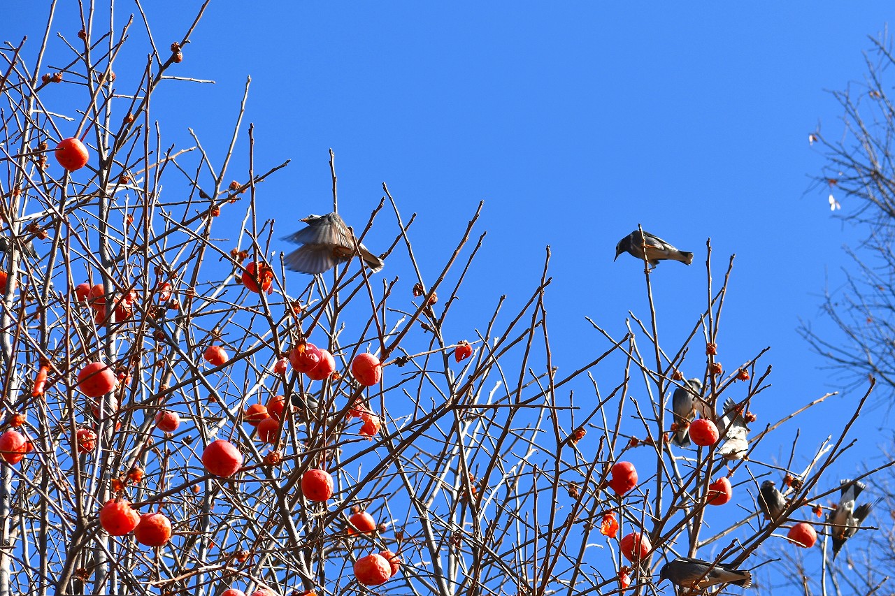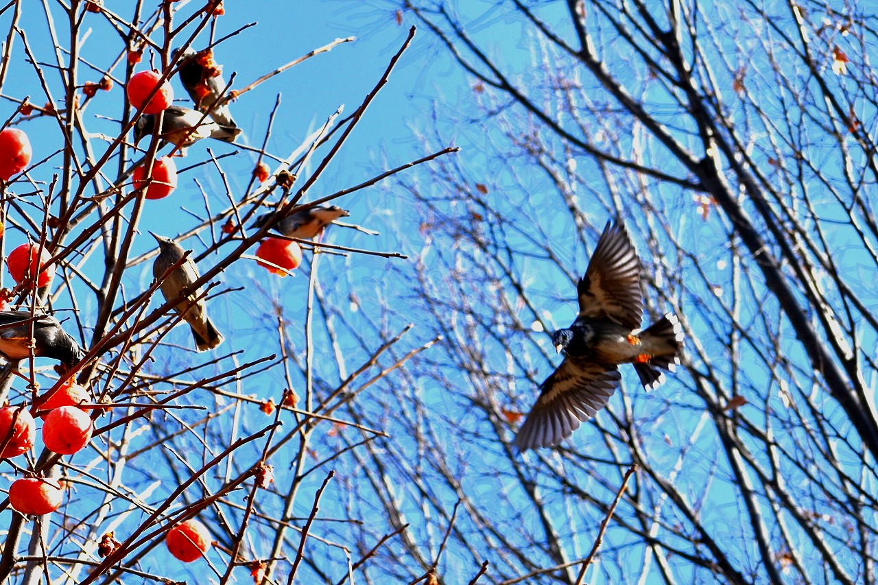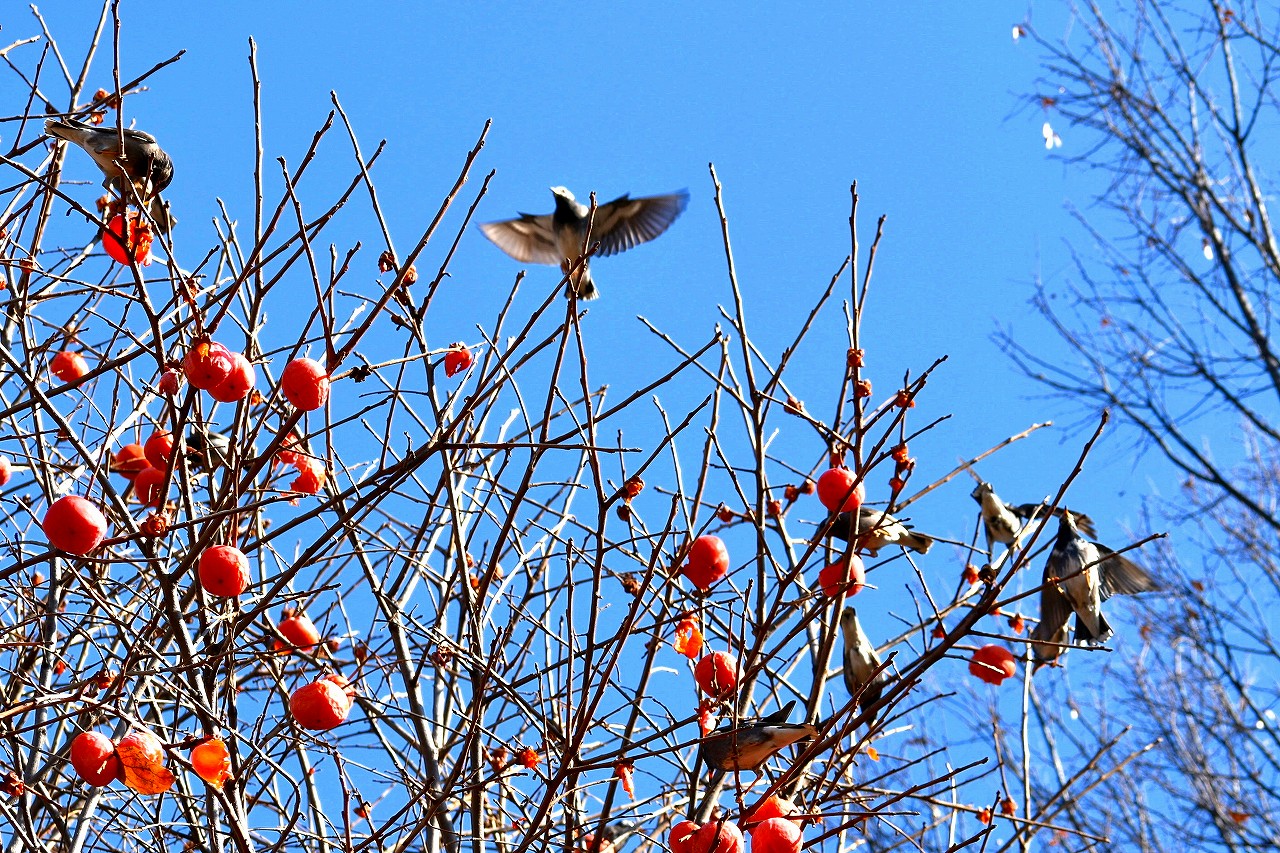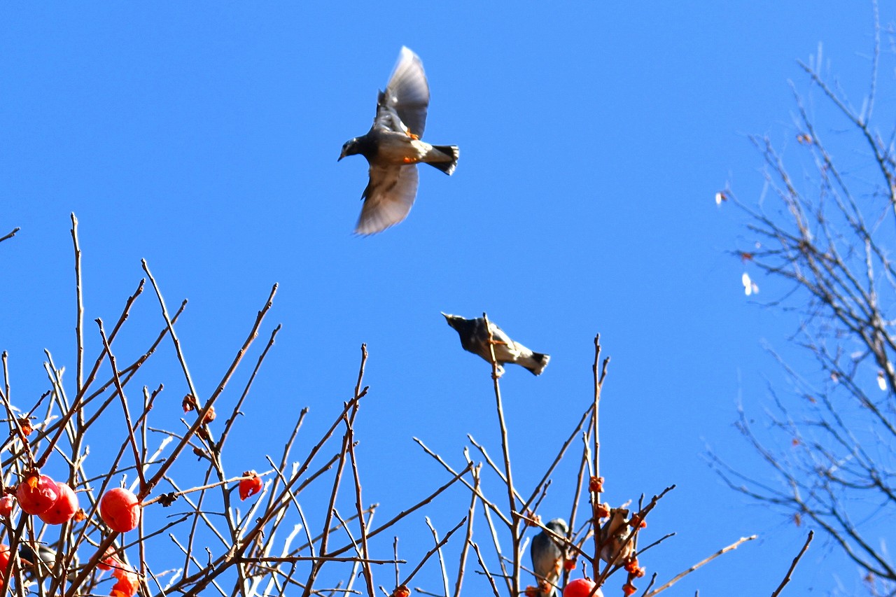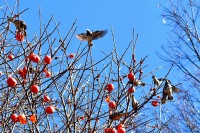 「一言」三田台児童遊園の大きな柿の木の実を食べるためにメジロやムクドリ、ススメが集まっています。メジロの写真を 撮っていたら。ムクドリの群れが飛んできて柿の実を食べだしました。ムクドリの飛んでいる写真が撮れました。