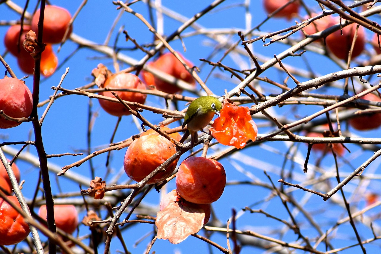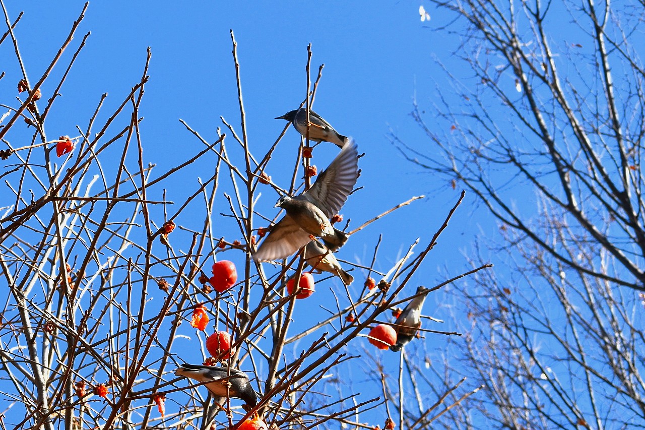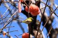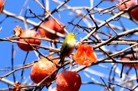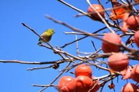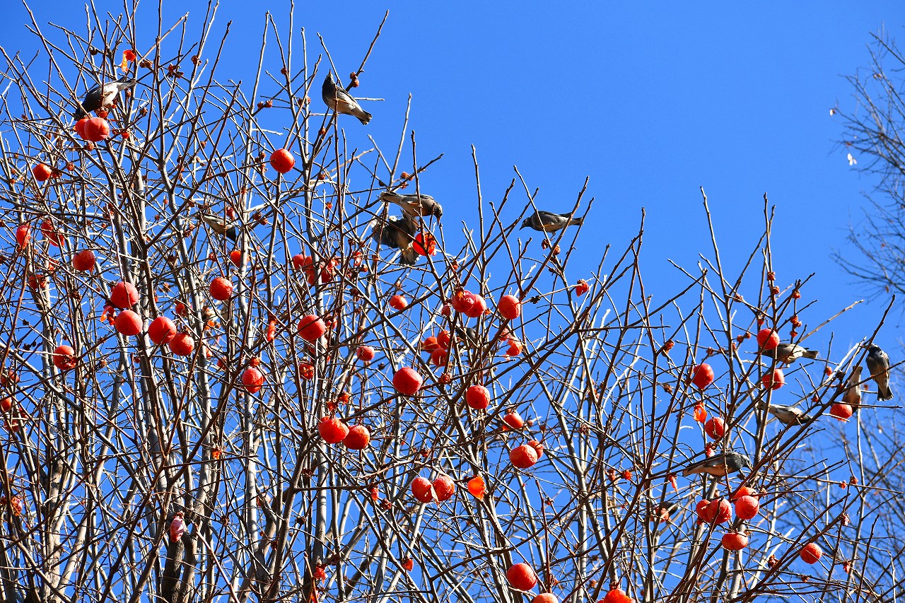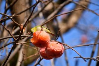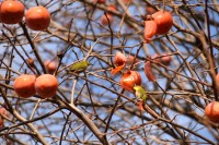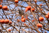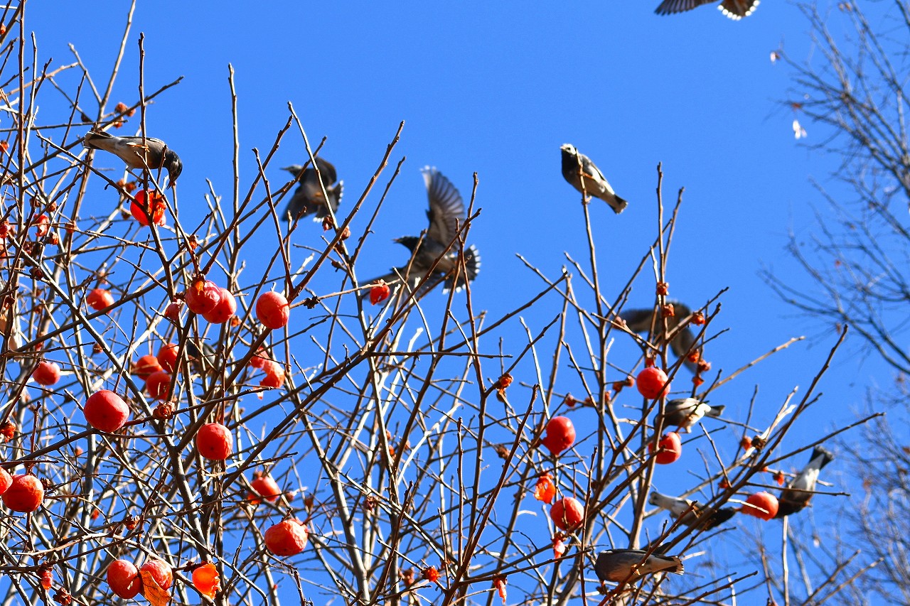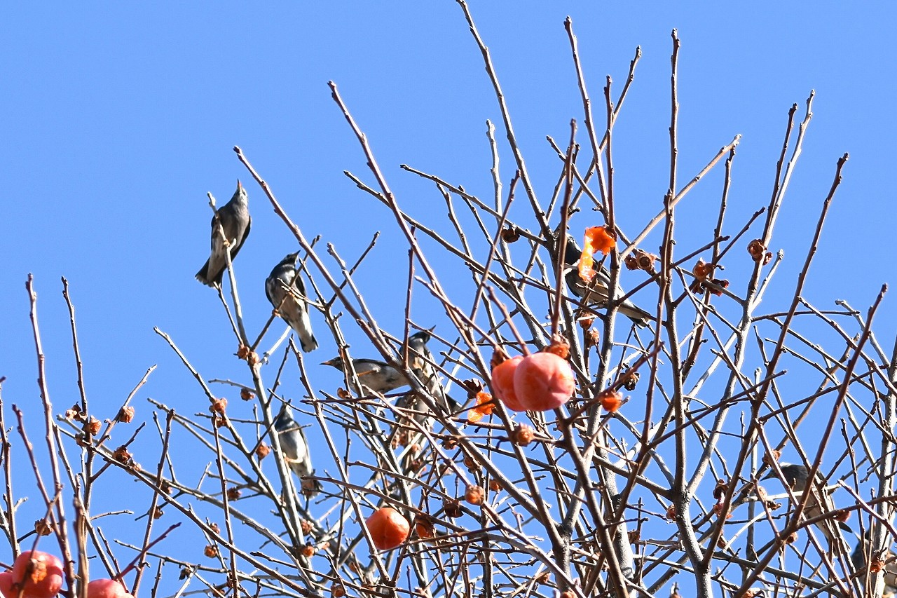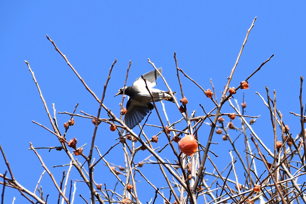 「一言」三田台児童遊園の大きな柿の木の実を食べるためにメジロやムクドリ、ススメが集まっています。メジロの写真を 撮っていたら。ムクドリの群れが飛んできて柿の実を食べだしました。ムクドリの飛んでいる写真が撮れました。