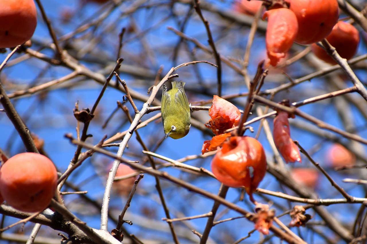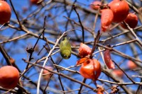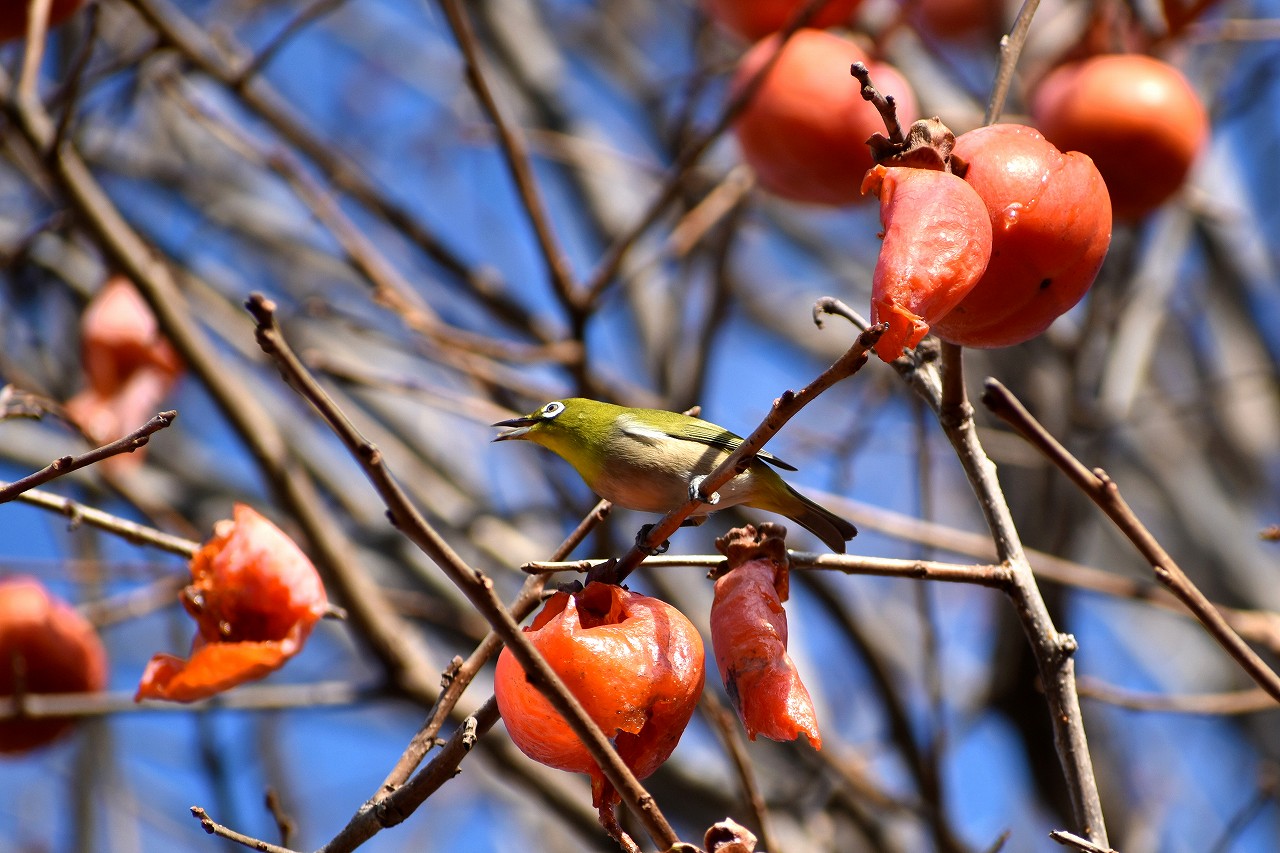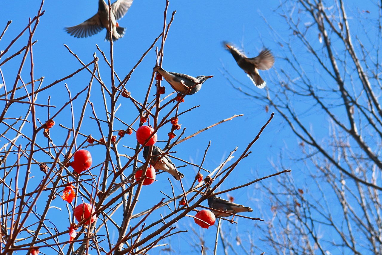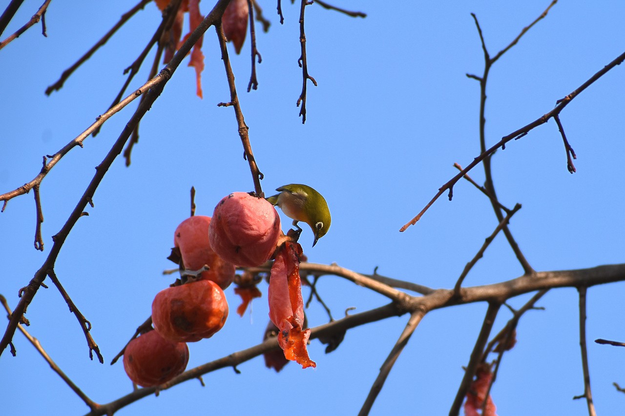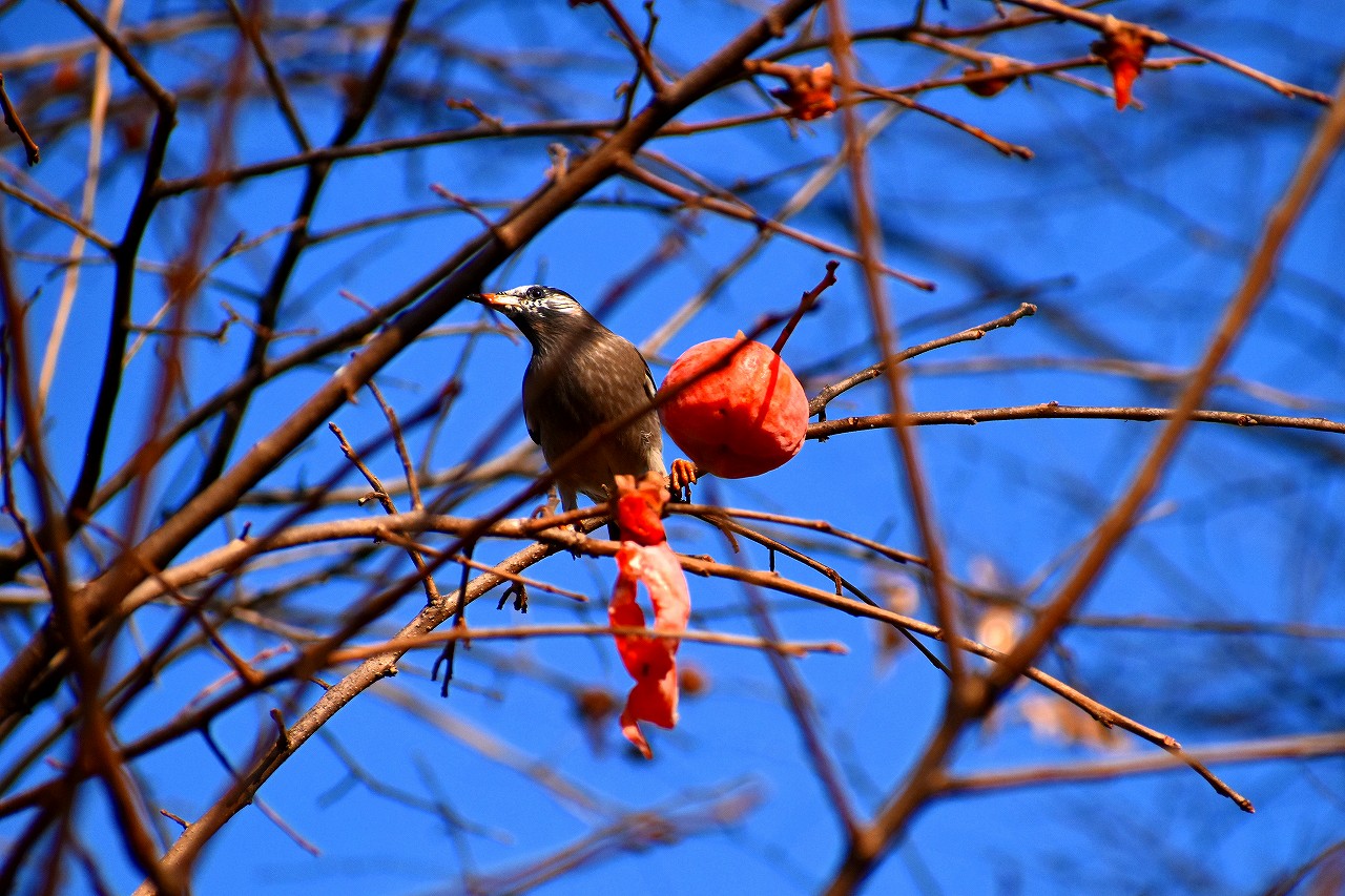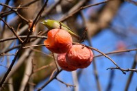 「一言」三田台児童遊園の大きな柿の木の実を食べるためにメジロやムクドリ、ススメが集まっています。メジロの写真を 撮っていたら。ムクドリの群れが飛んできて柿の実を食べだしました。ムクドリの飛んでいる写真が撮れました。