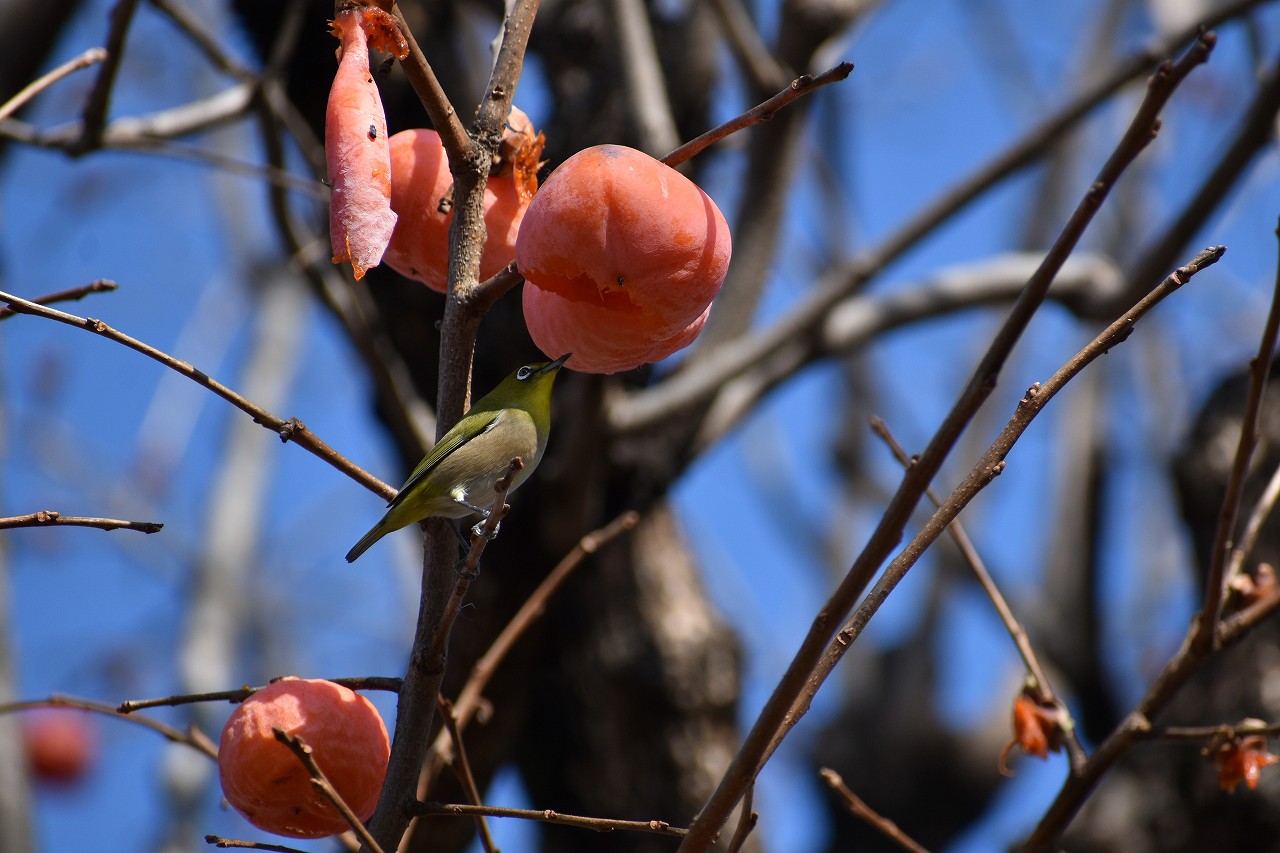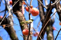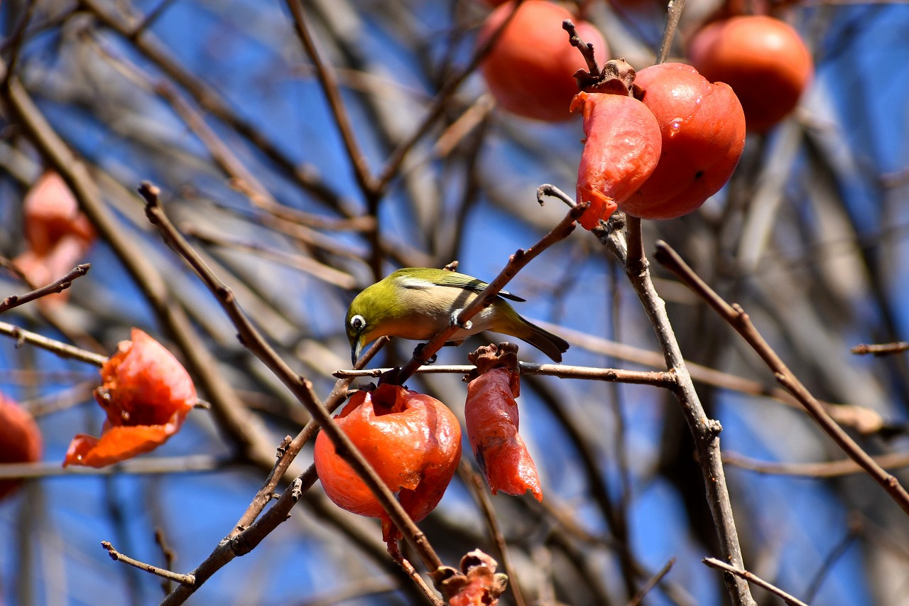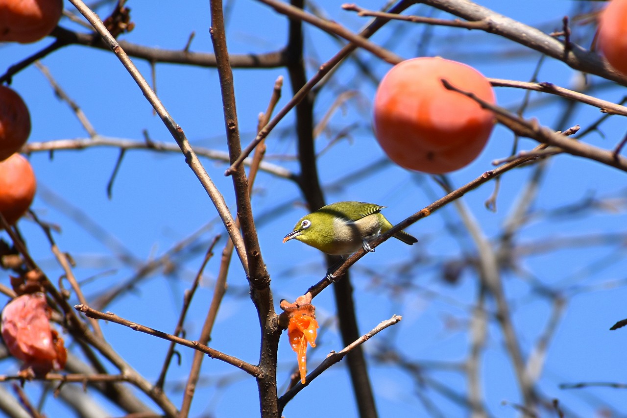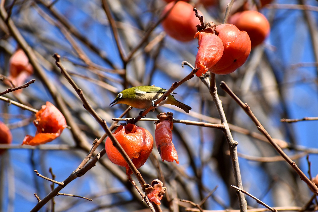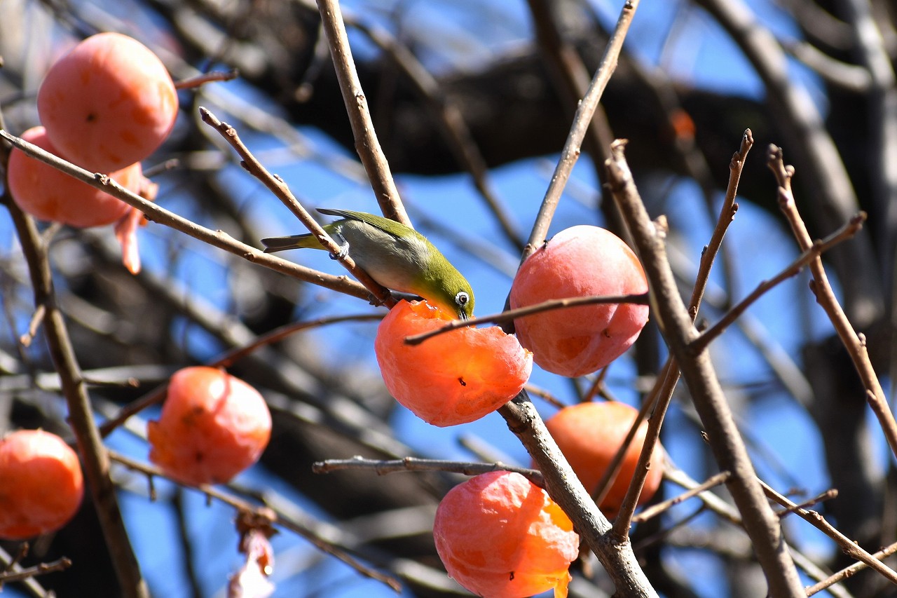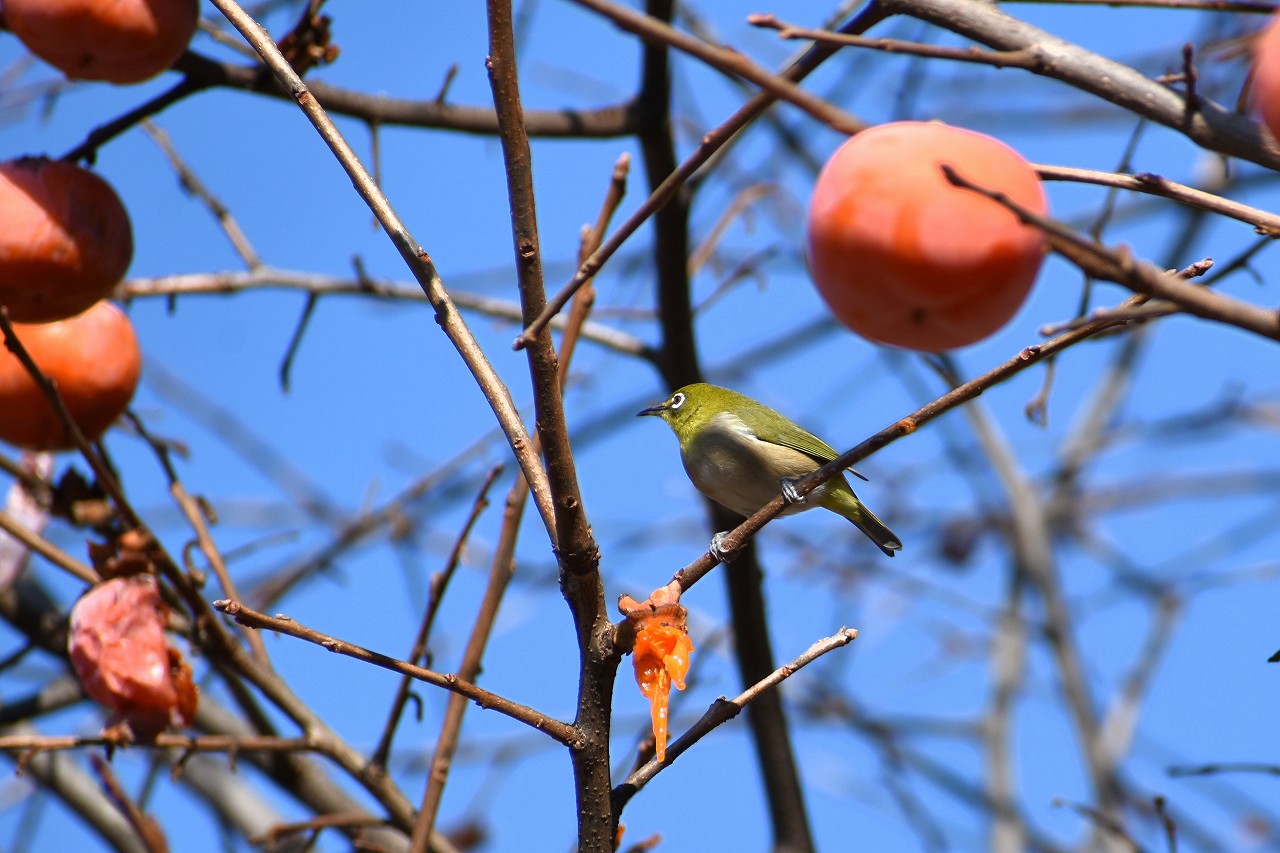 「一言」三田台児童遊園の大きな柿の木の実を食べるためにメジロやムクドリ、ススメが集まっています。メジロの写真を 撮っていたら。ムクドリの群れが飛んできて柿の実を食べだしました。ムクドリの飛んでいる写真が撮れました。