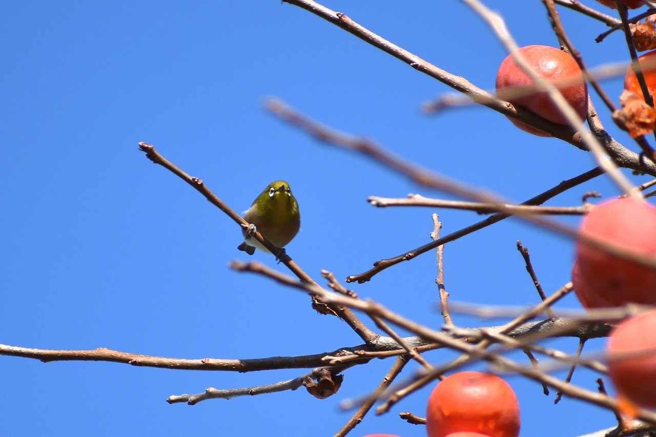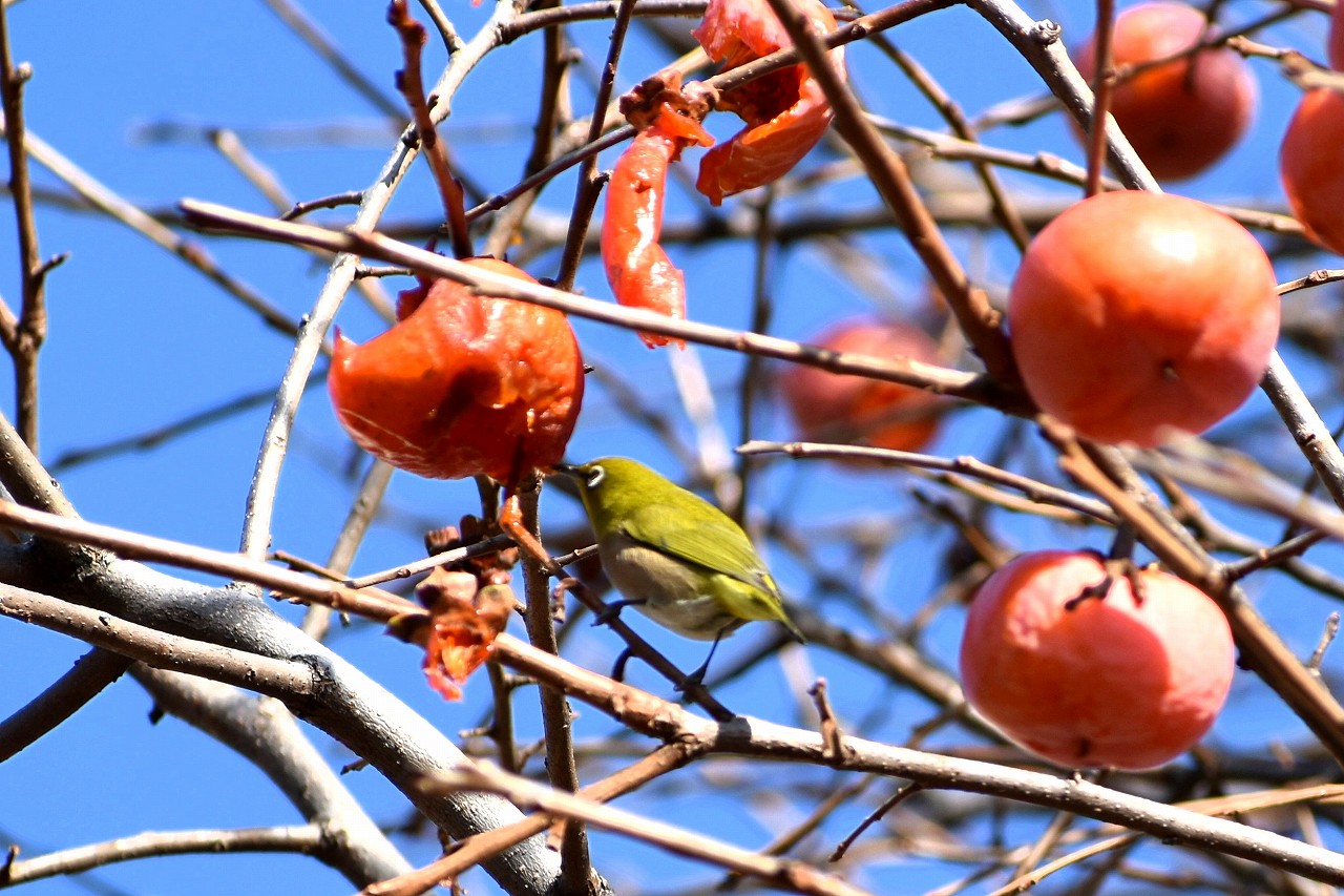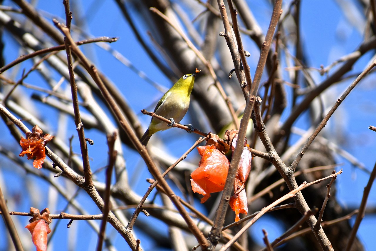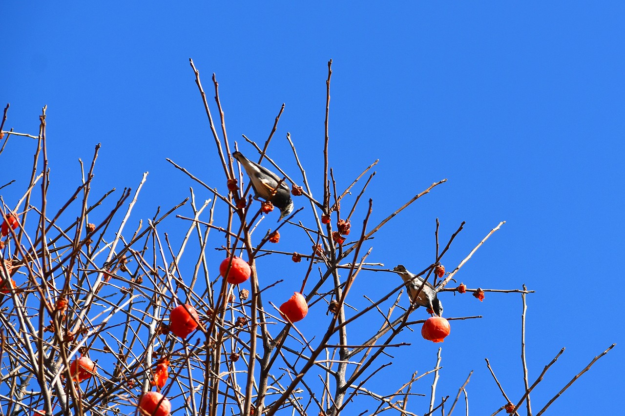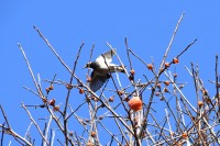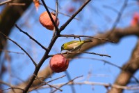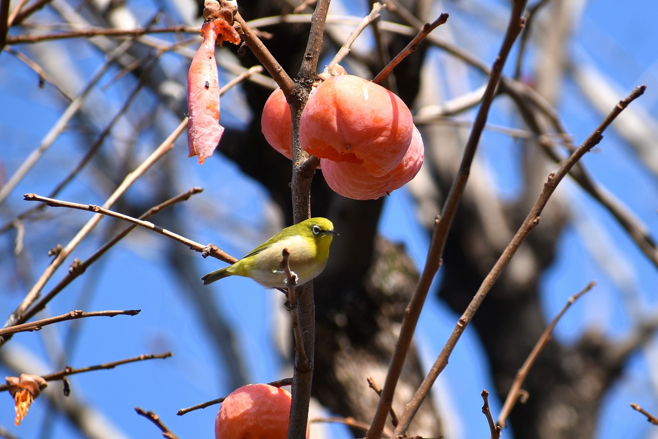 「一言」三田台児童遊園の大きな柿の木の実を食べるためにメジロやムクドリ、ススメが集まっています。メジロの写真を 撮っていたら。ムクドリの群れが飛んできて柿の実を食べだしました。ムクドリの飛んでいる写真が撮れました。