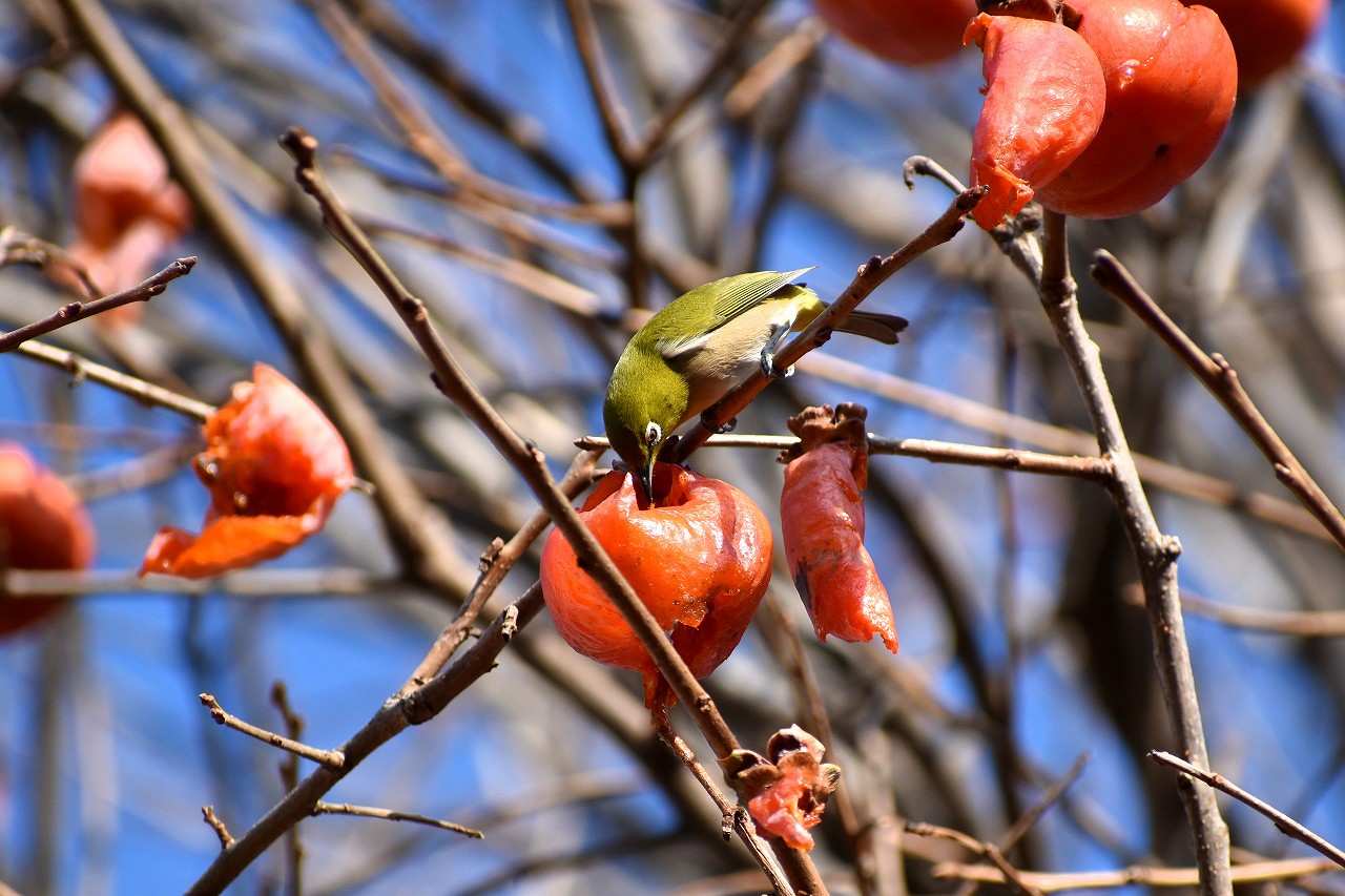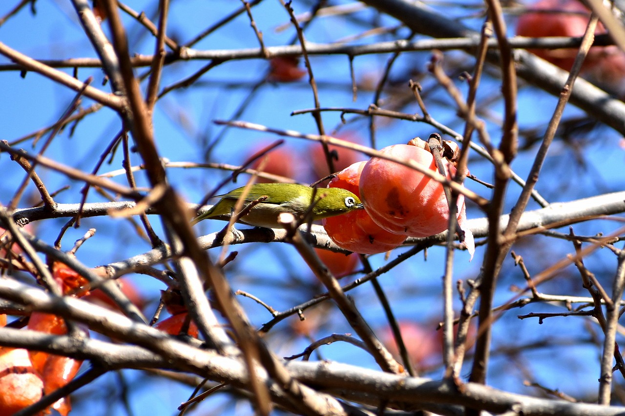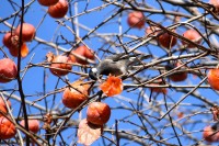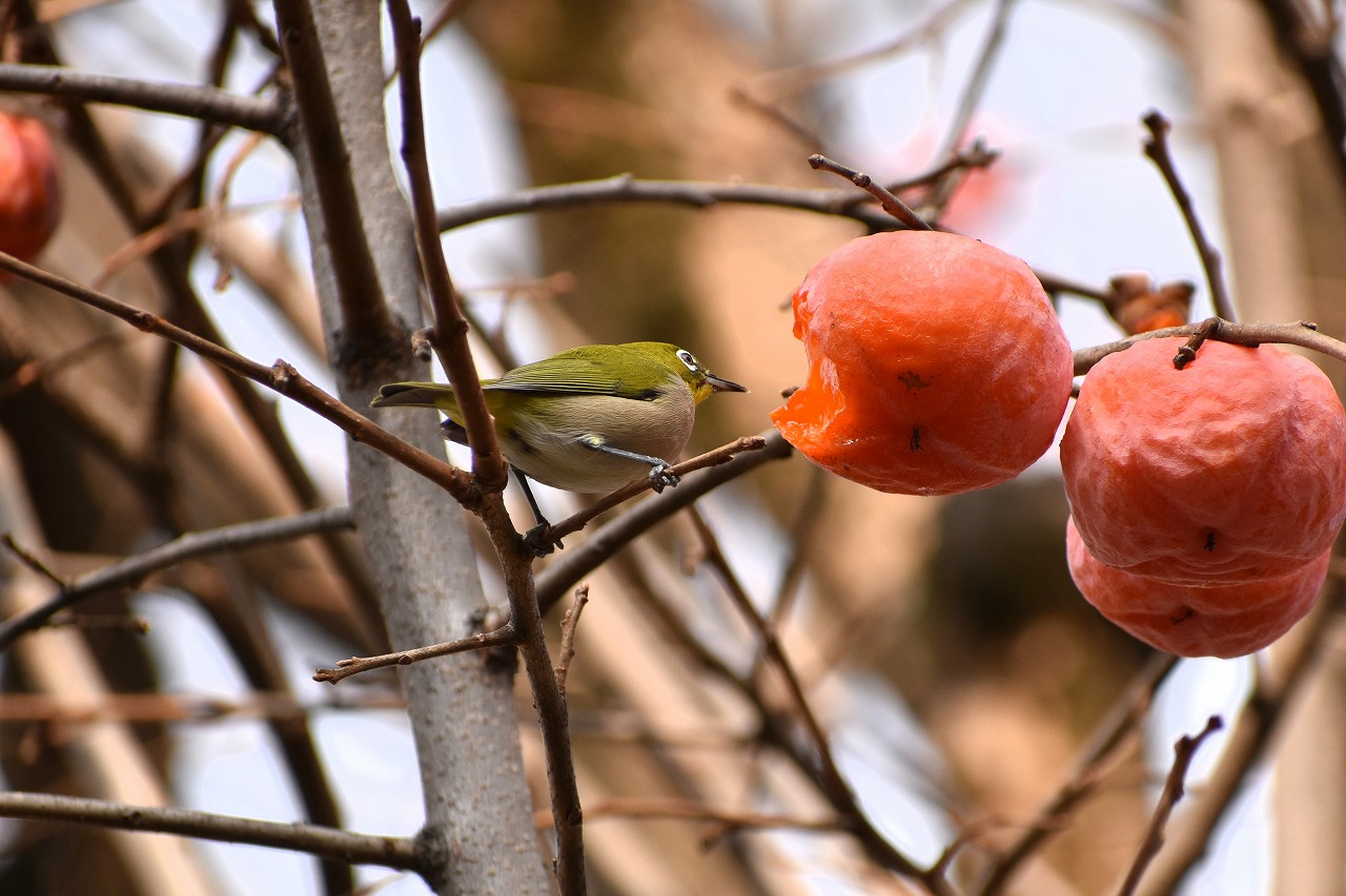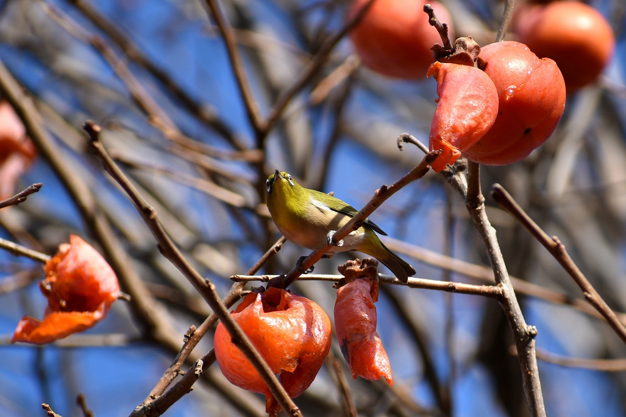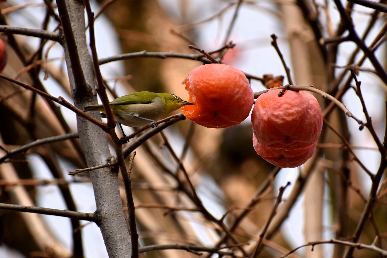 「一言」三田台児童遊園の大きな柿の木の実を食べるためにメジロやムクドリ、ススメが集まっています。メジロの写真を 撮っていたら。ムクドリの群れが飛んできて柿の実を食べだしました。ムクドリの飛んでいる写真が撮れました。