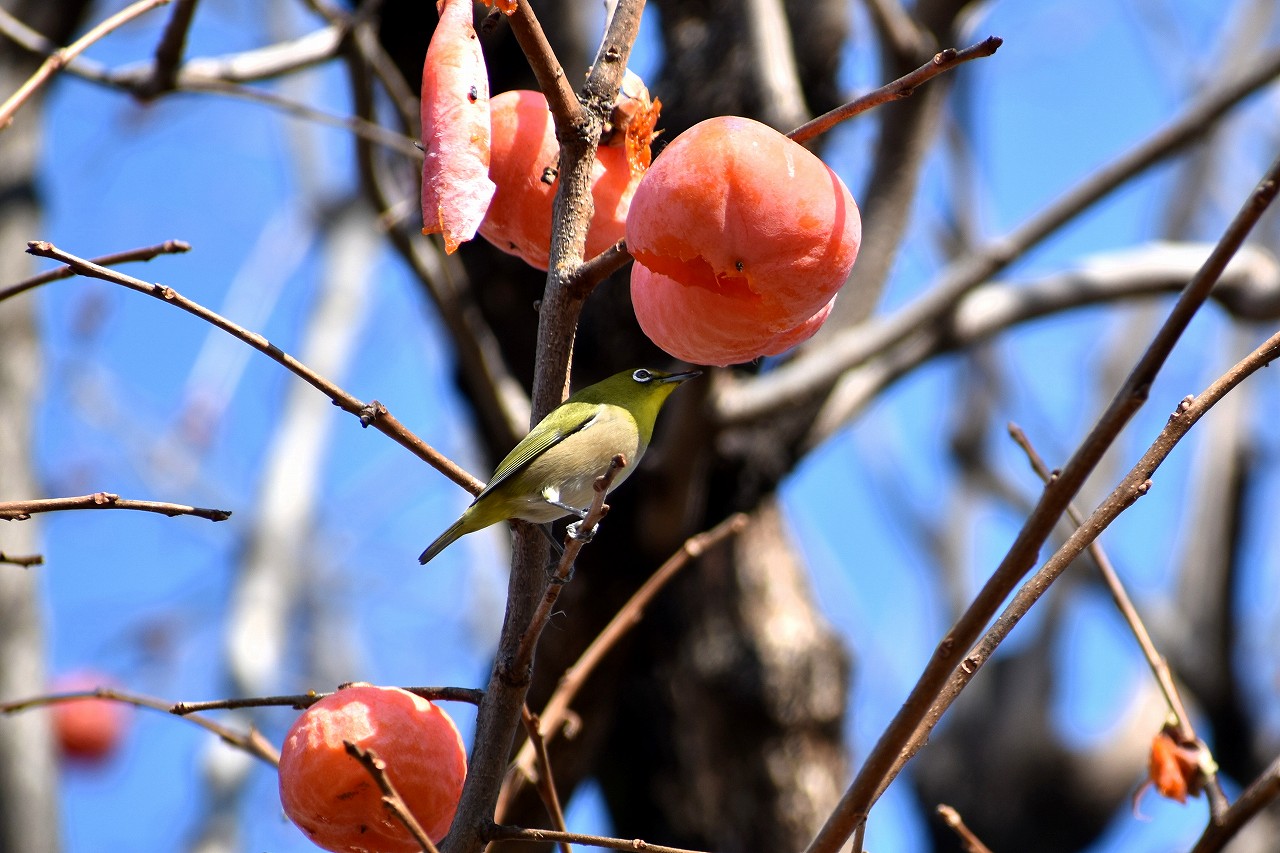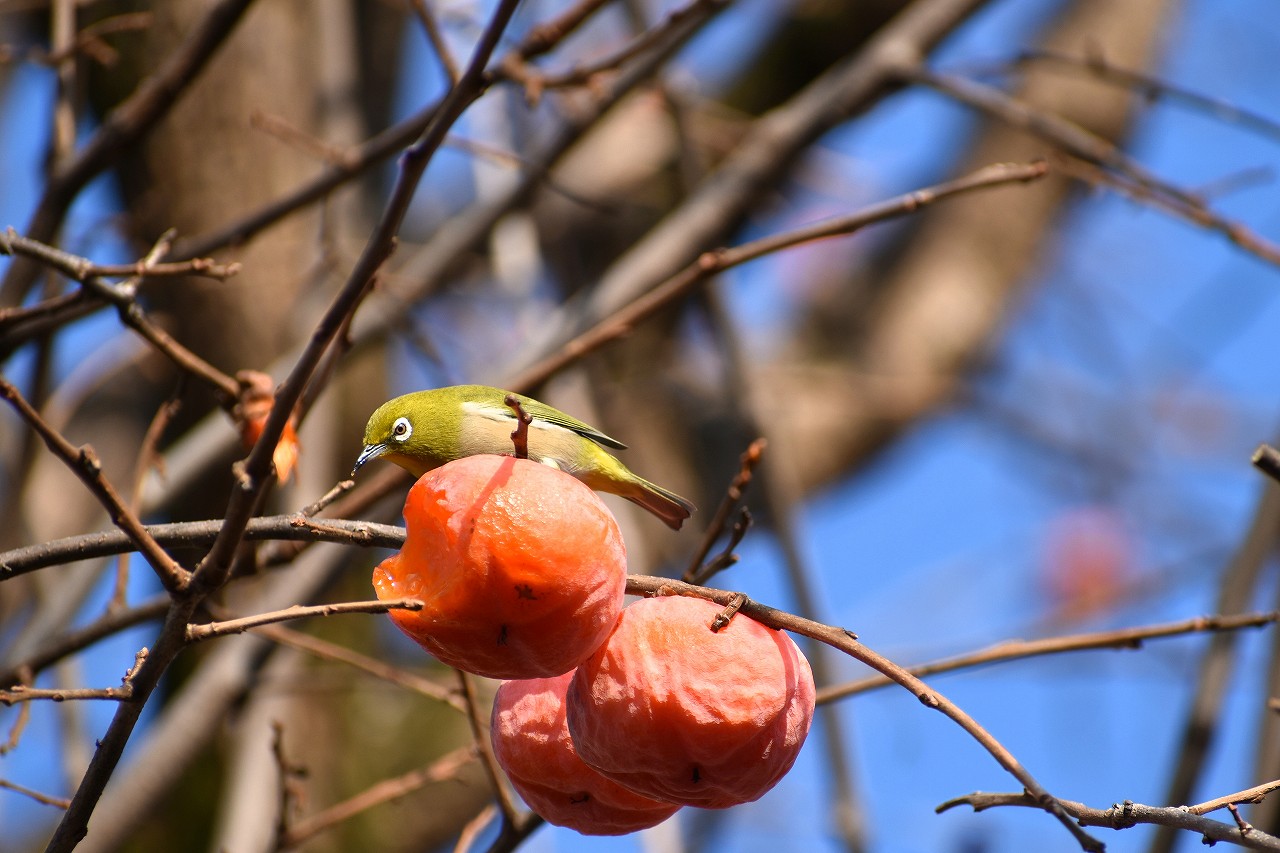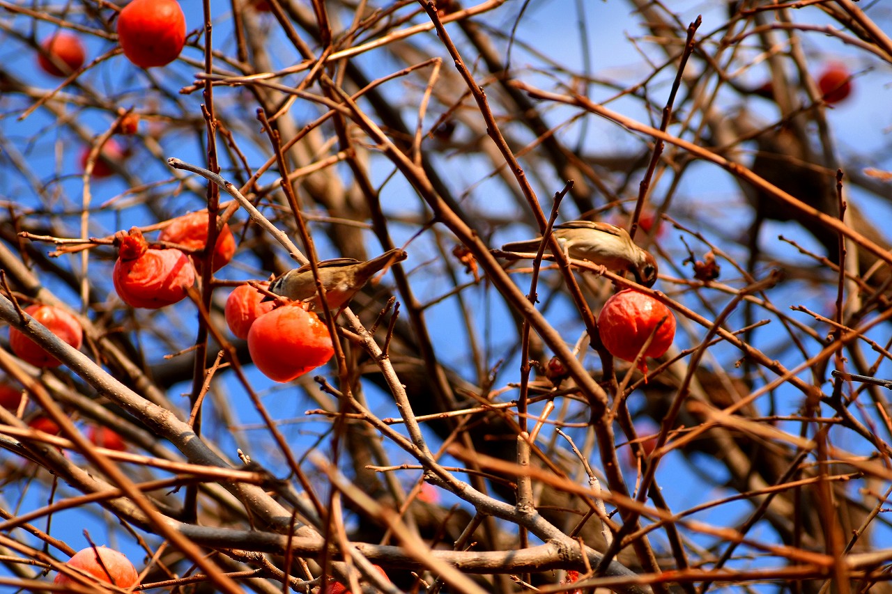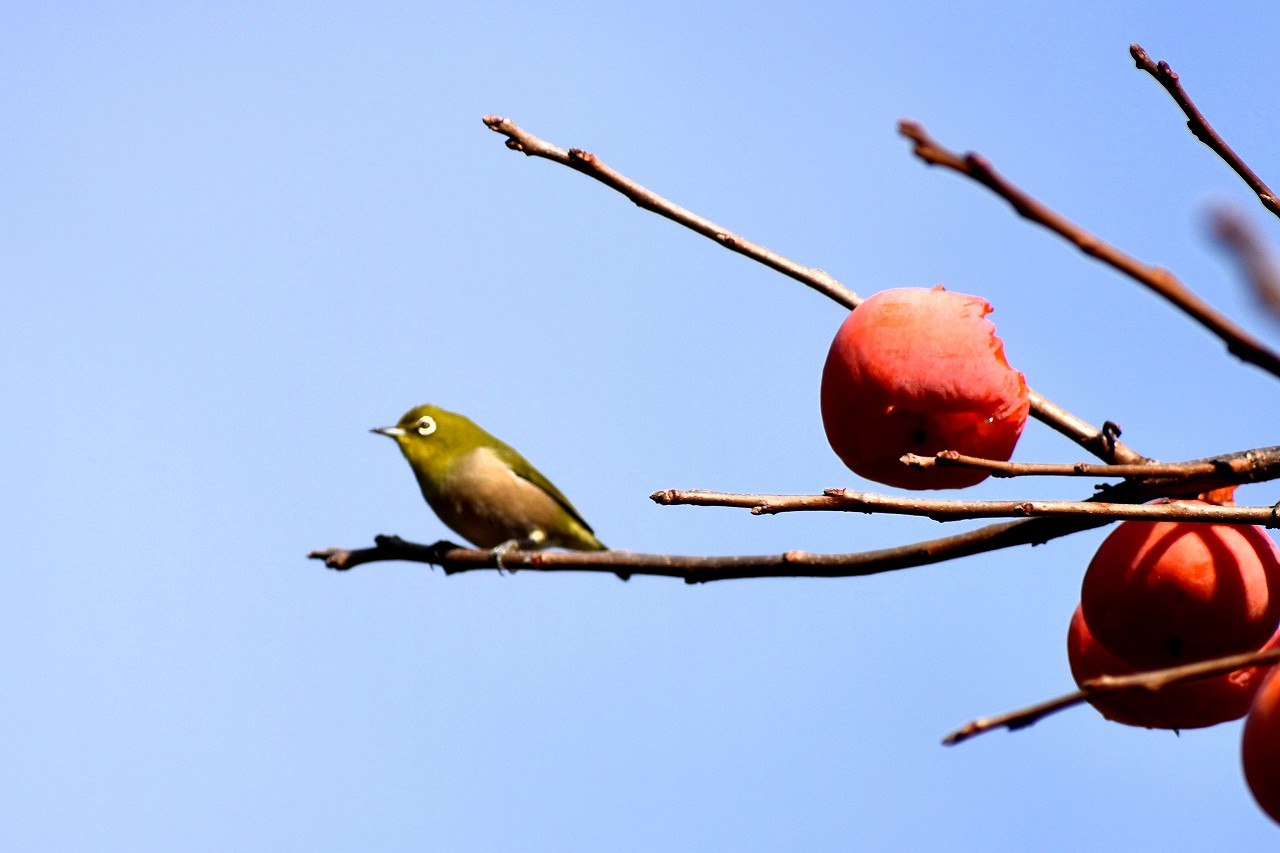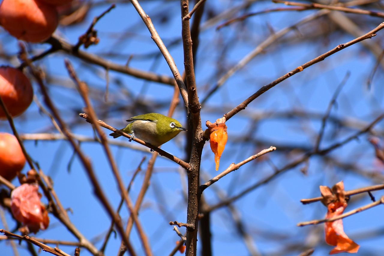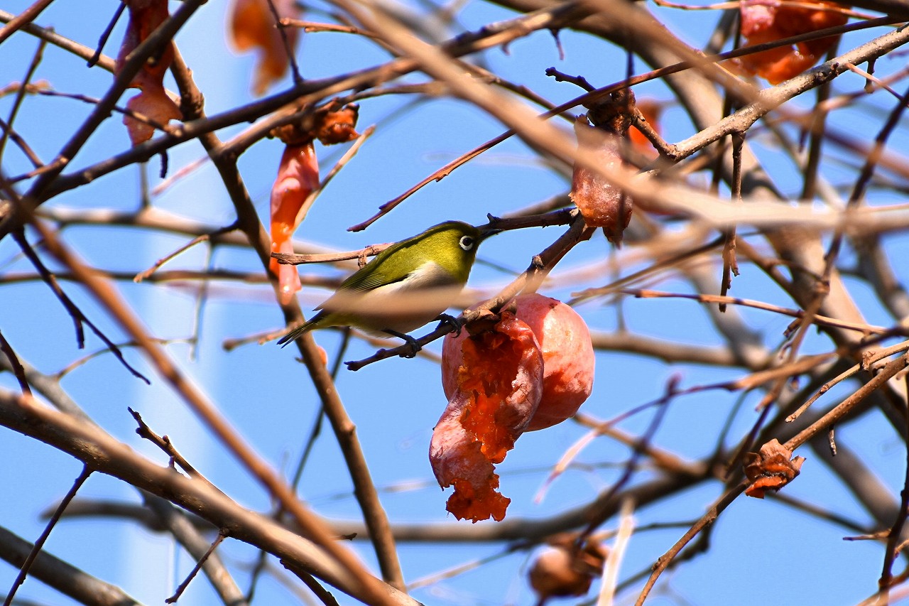 「一言」三田台児童遊園の大きな柿の木の実を食べるためにメジロやムクドリ、ススメが集まっています。メジロの写真を 撮っていたら。ムクドリの群れが飛んできて柿の実を食べだしました。ムクドリの飛んでいる写真が撮れました。