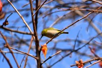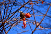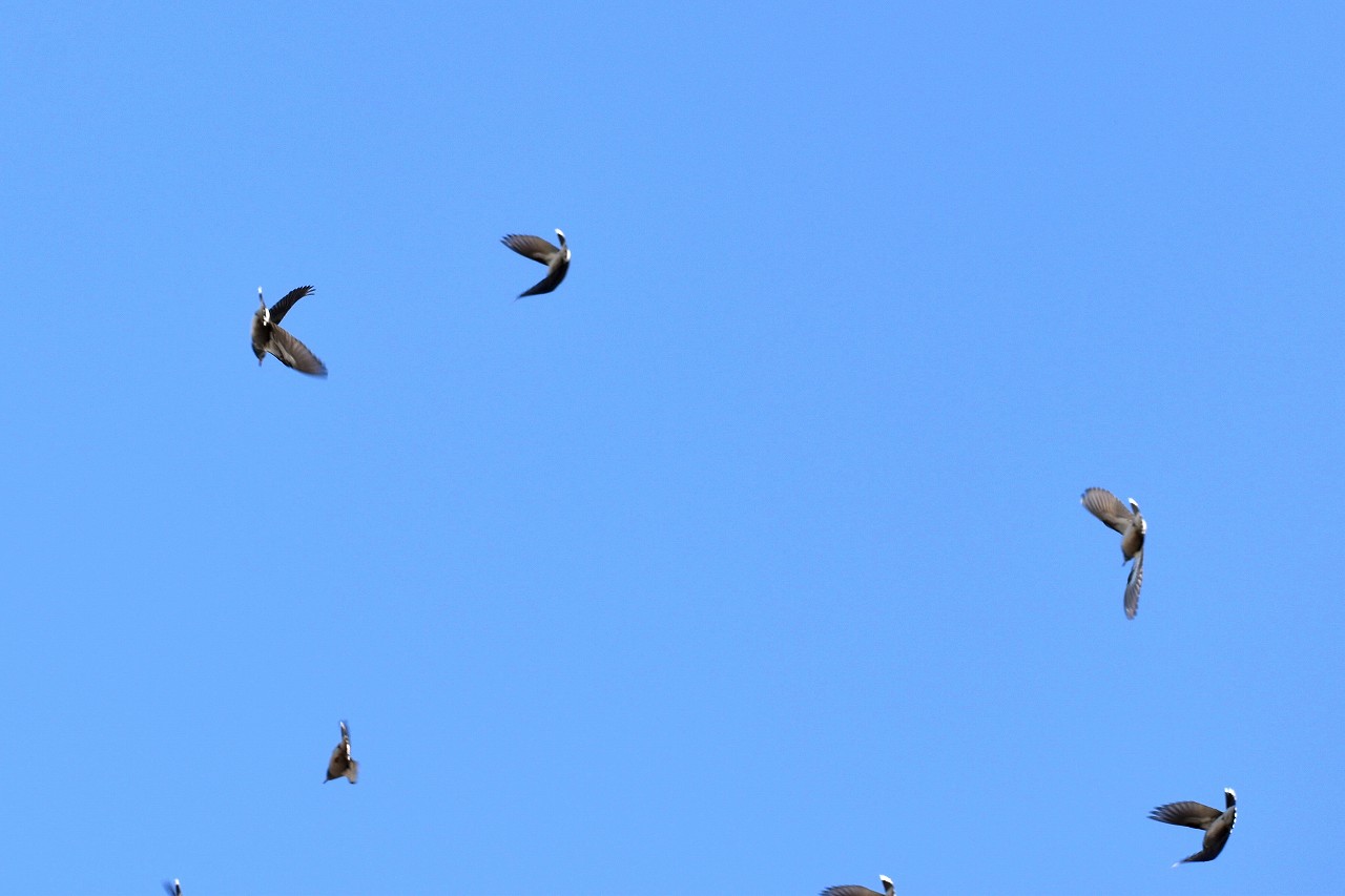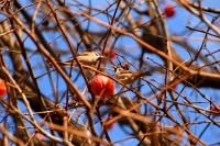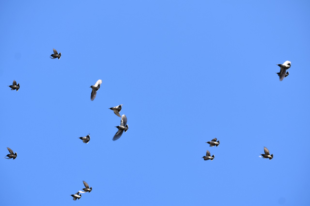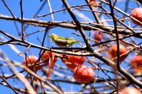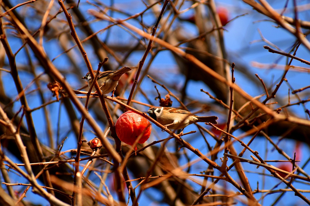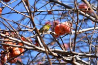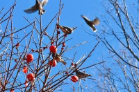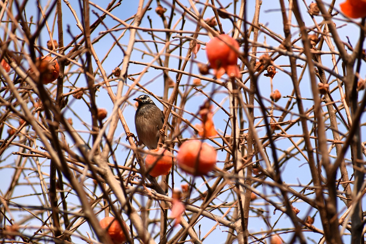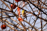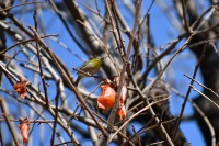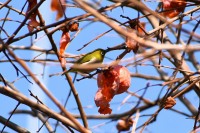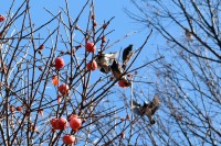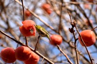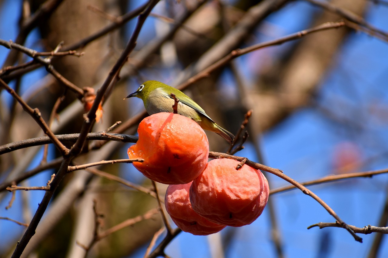 「一言」三田台児童遊園の大きな柿の木の実を食べるためにメジロやムクドリ、ススメが集まっています。メジロの写真を 撮っていたら。ムクドリの群れが飛んできて柿の実を食べだしました。ムクドリの飛んでいる写真が撮れました。