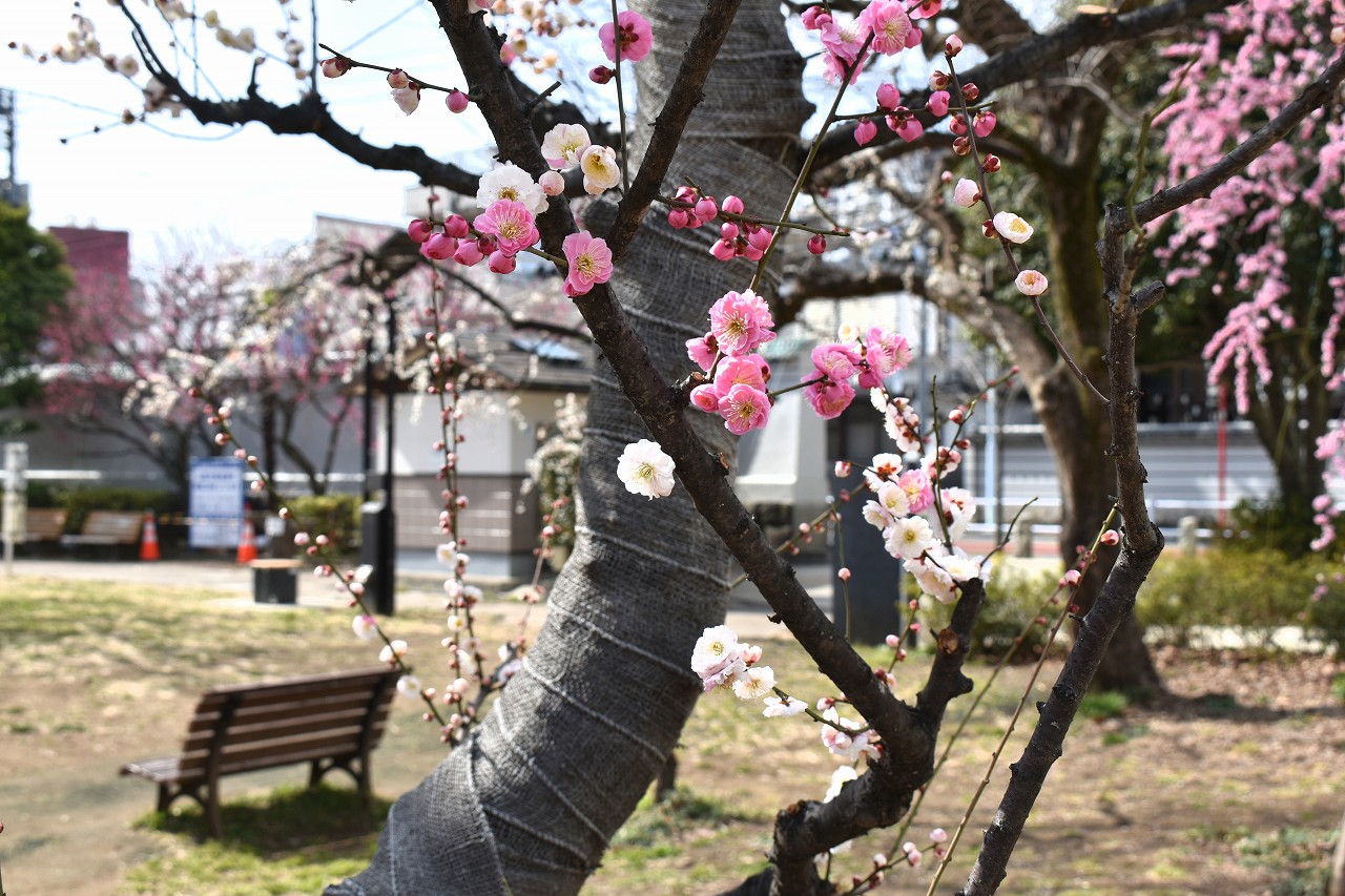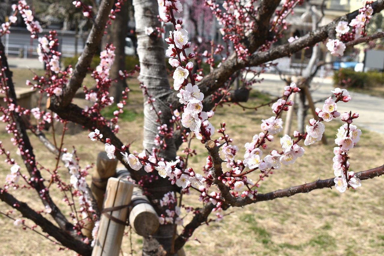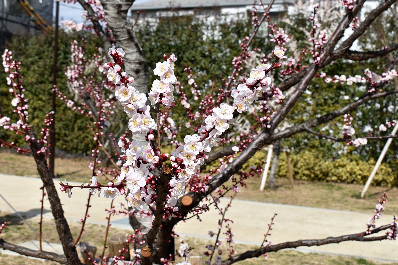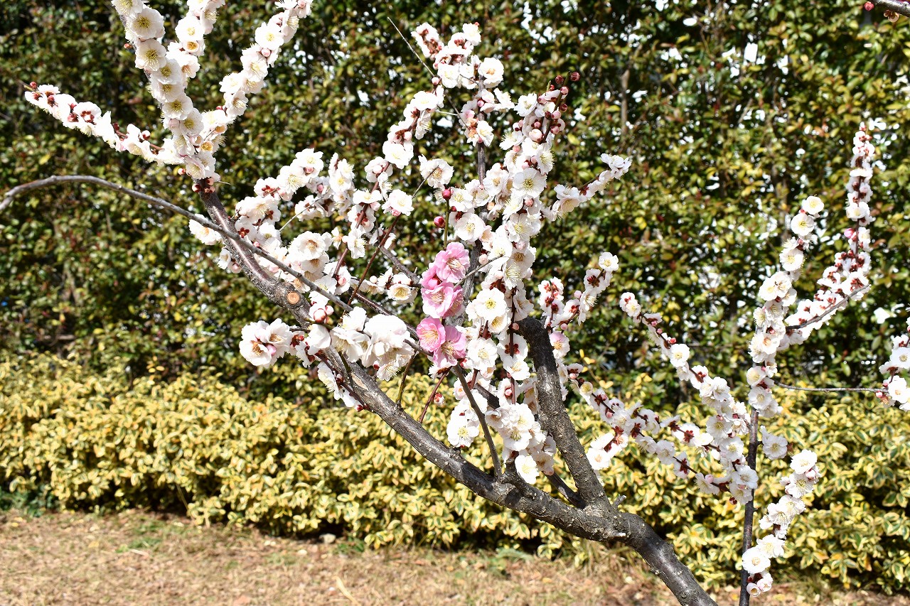 「一言」三田台児童遊園に色々な梅の花が咲き梅園のようになってきました。昨年植えた梅の花が一斉に咲いています、